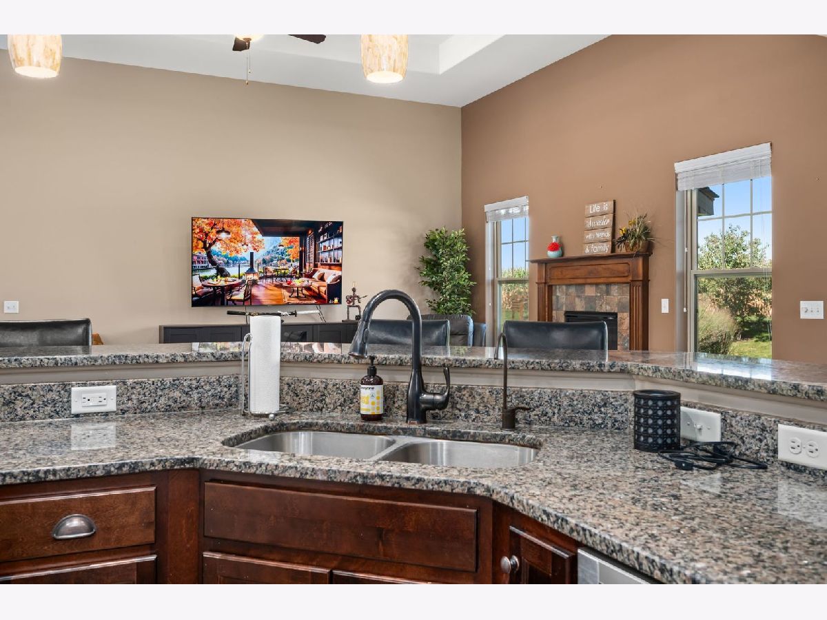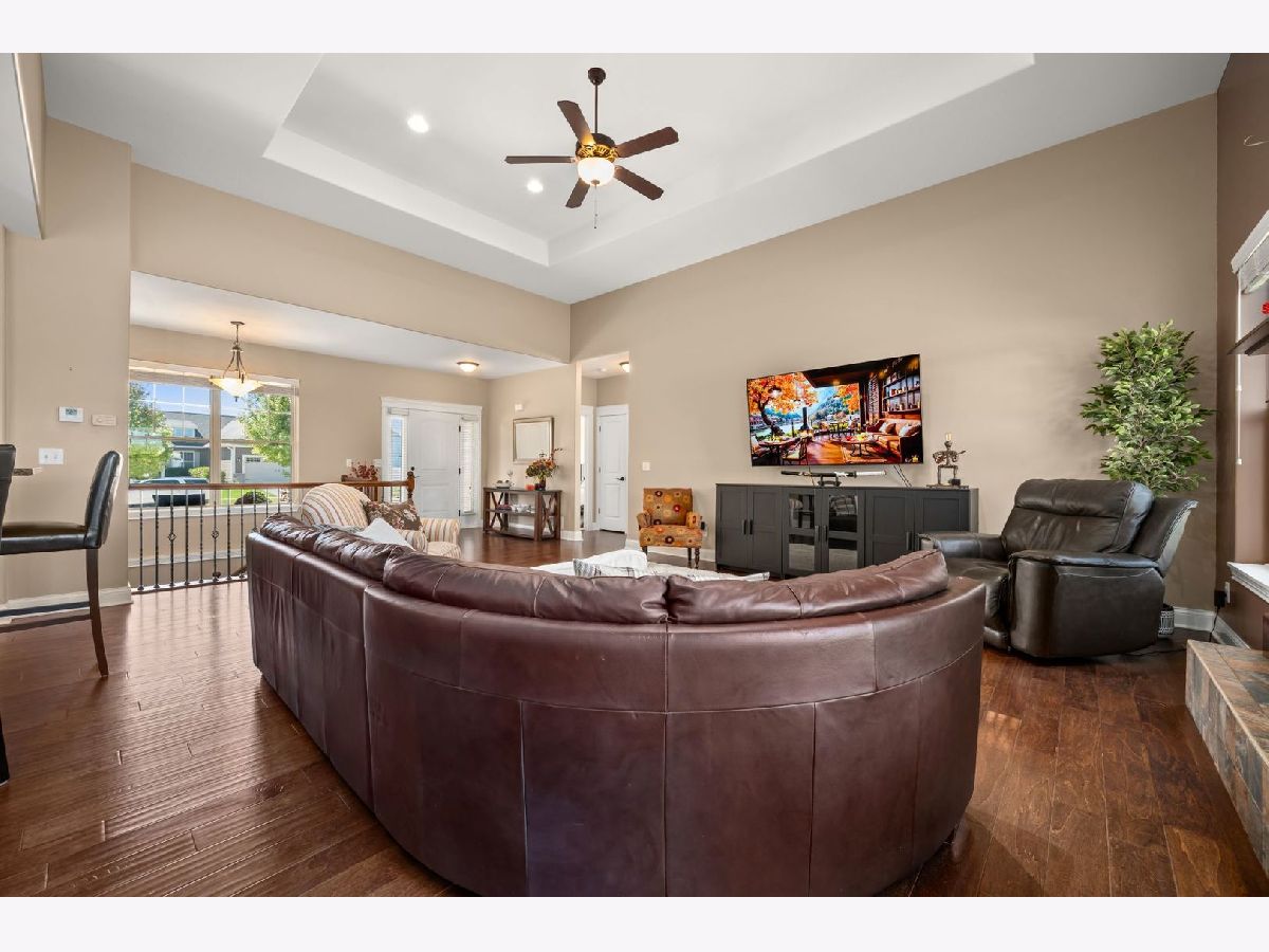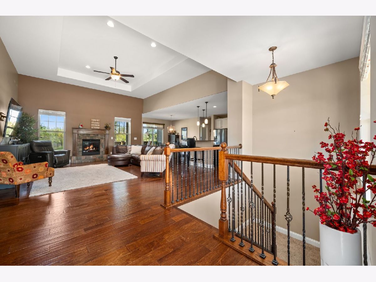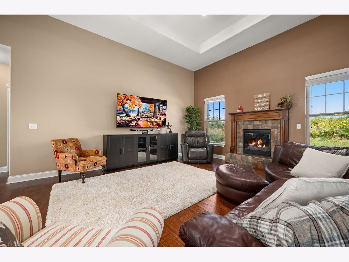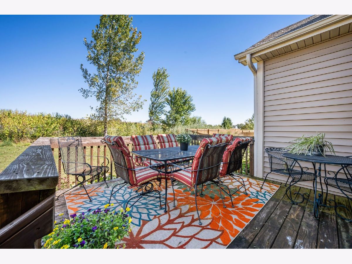 This stunning ranch located in North Grove Crossings boosts a welcoming covered front porch, open floor plan with grand foyer, open staircase, and gleaming engineered hardwood floors throughout. The foyer opens up to spacious family room with 13' tray ceiling and gas fireplace with wood mantle. The kitchen overlooks both the family room and dining room offers an extended island with a breakfast bar for casual dining and entertaining. The chef's kitchen features 2 toned cabinetry with soft close drawers and crown molding, granite countertops, stainless steel appliances, and walk-in pantry. The laundry is equipped with washer and dryer with shelving. You will love the privacy of split floor plan! The primary suite features tray ceiling and an en-suite bathroom with double sinks, tiled shower with Jolie showerhead, linen closet, and large walk-in closet. The 2 additional bedrooms with a hall bathroom located on opposite side of the house arounds off the first floor. If you need more room, check out the beautifully finished basement with living room, 4th bedroom, office, full bathroom, and storage rooms. The 14X12 deck overlooks meticulously landscaped, peaceful, and private backyard with a view of cornfields, making it the perfect retreat. 3 car garage, Sycamore Schools. Conveniently located near downtown Sycamore, shopping, dining, and I88. Make this your next move!