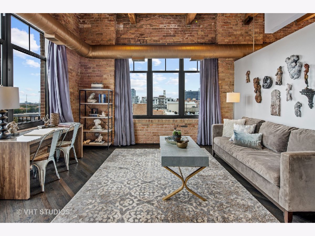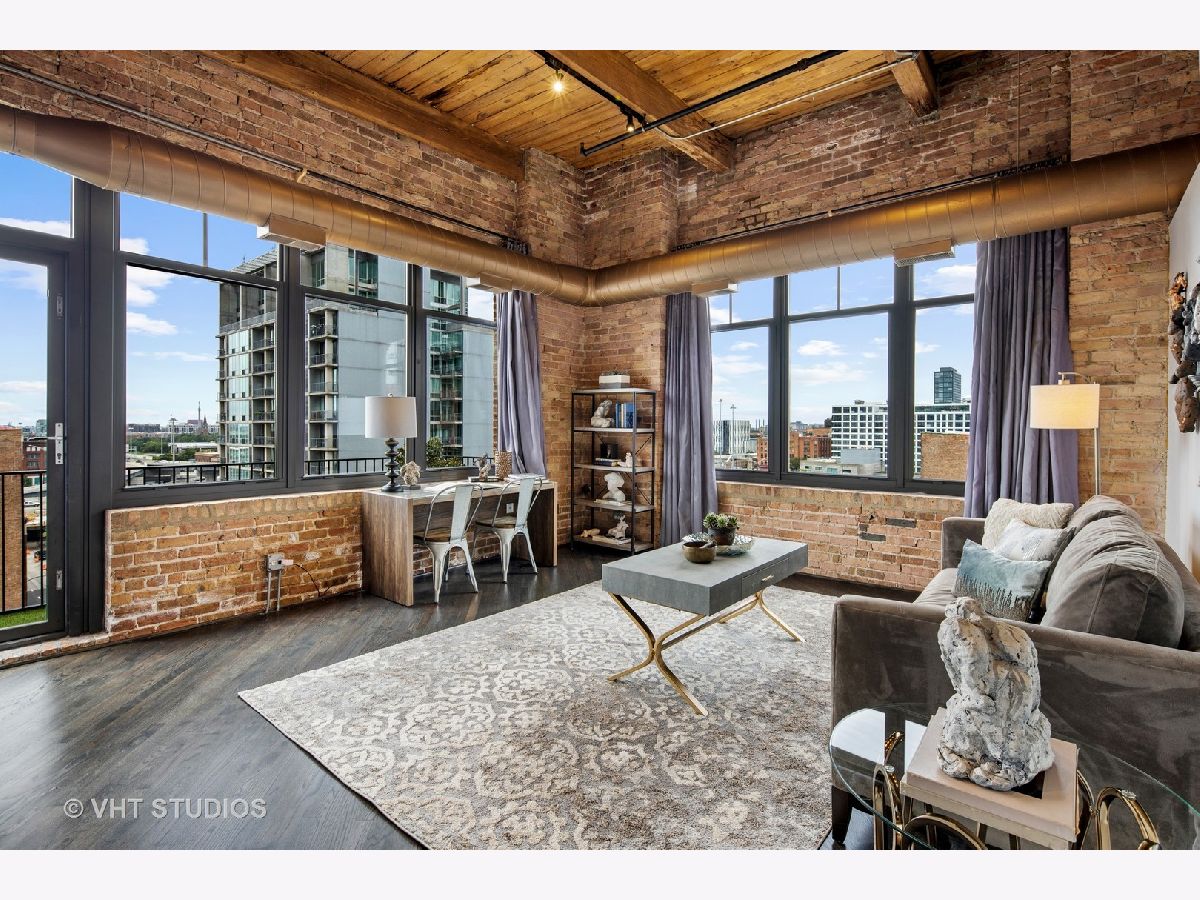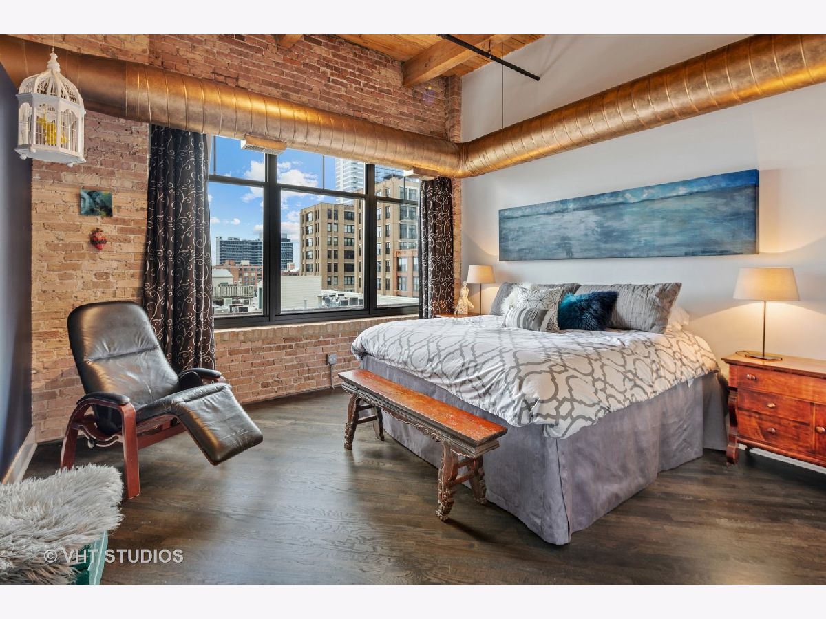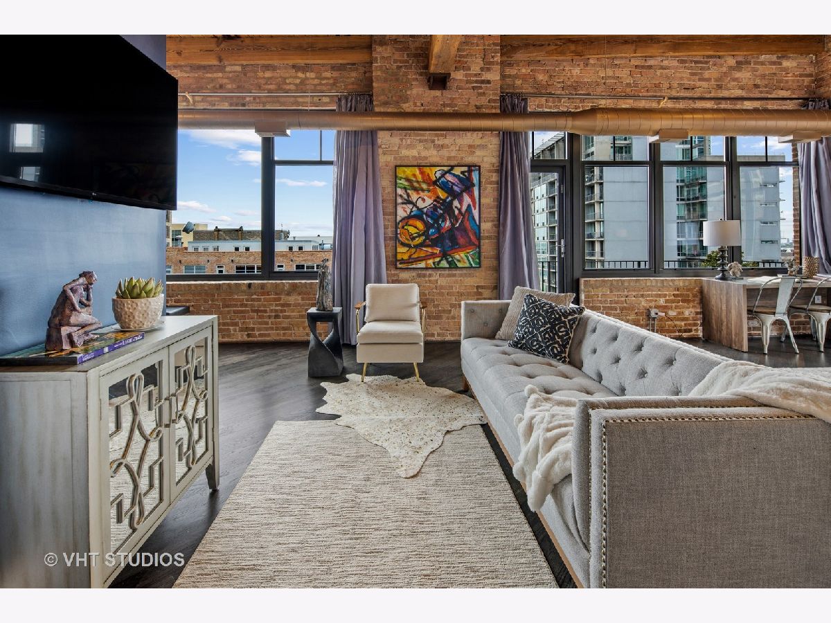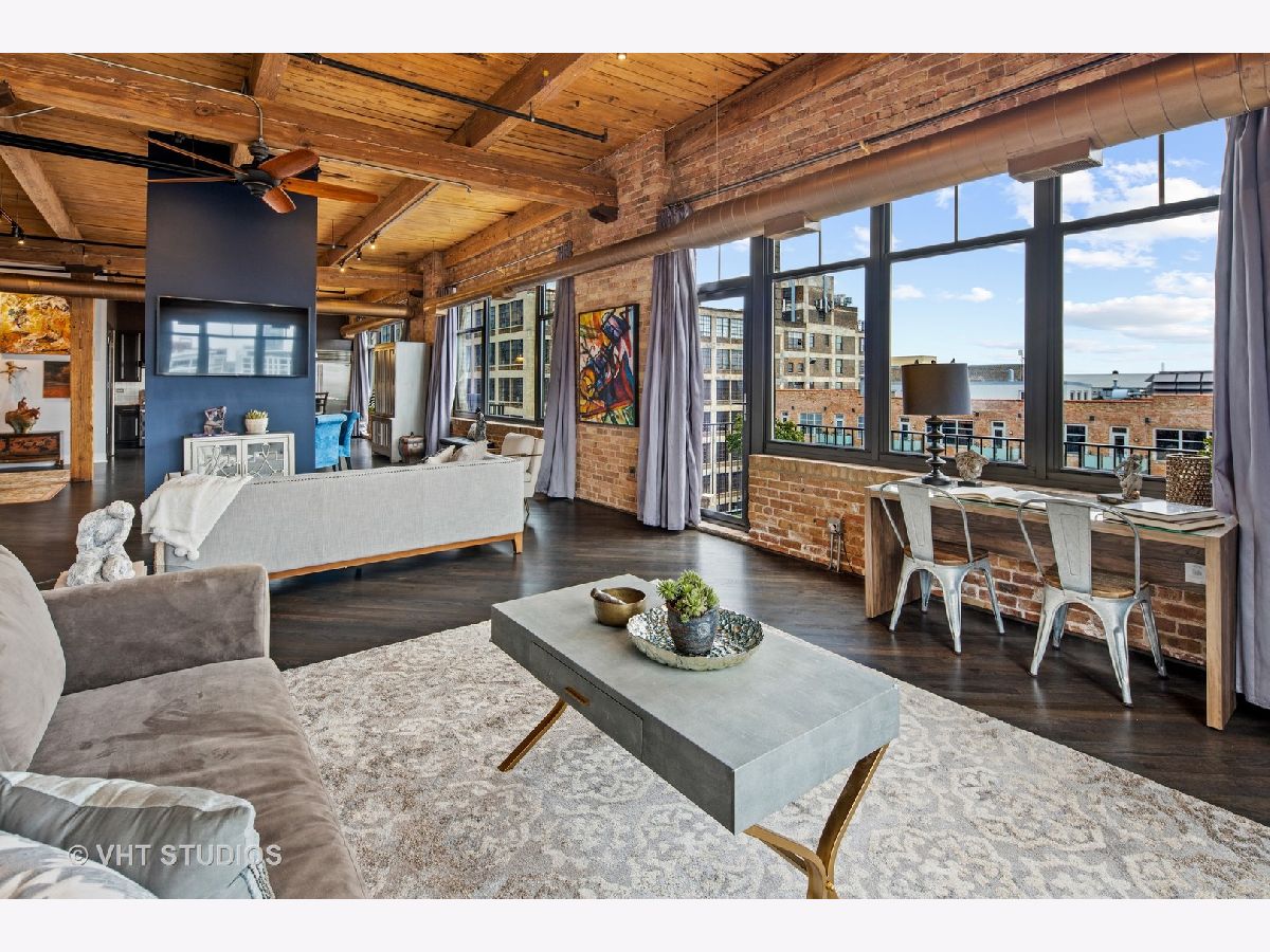 Beautiful penthouse loft filled with natural light in this one-of-a-kind South West corner timber loft at Capitol Hill Lofts in the West Loop that was two units combined from the developer (the top floor "04" two bed two bath with "05" one bed space) creating the largest loft in the building and only one like it with two 16'x5' balconies - one off kitchen for grilling and one off the living room. Filled with character this artist's loft offers exposed brick, soaring 13' timber ceilings, beams and columns, fifteen oversized 7' high loft windows, nearly 60' south-facing wall for all-day sunlight and almost 30' wall of west-facing light for incredible sunset views, and newly refinished, "aged barrel" dark stained hardwood floors throughout. The layout of this corner loft is ideal for the artist-owner who wanted huge open space filled with light in true open loft style with approximately 1,650 sq ft. Renovated chef's kitchen has a large island, quartzite countertops, stainless steel appliances including a SubZero 42" French door refrigerator, and a large walk-in pantry with chalkboard paint on the inside doors for your grocery list, to-do list or favorite recipes. Spacious primary bedroom has a wall of West windows, an organized walk-in closet, attached bathroom with double vanity, quartzite counters, and deep soaking tub with shower. The second full bathroom has a modern floating vanity, 18" Carrera white marble floors, white subway tiles on walls, ceiling and a frameless glass shower for a stylish, clean look. The large foyer is perfect for an art gallery wall and you have the conveniences of front-loading stackable washer/dryer, central air, and gas forced heat. A huge extra-wide attached garage parking space is included and can accommodate the largest SUV. Extra storage cage and bike room storage are included as well as a fitness center, Xfinity high-speed internet and cable, hot water, three elevators, package/mail room, onsite building engineer, and professional property management. Capitol Hill Lofts is a historic elevator building in hot West Loop neighborhood close to everything - transit, restaurants, shops and the Loop, gyms, Whole Foods, Mariano's, Target, Greek Town, Randolph and Fulton Market restaurant districts, 1 block from Heritage Green Park, Old St. Pat's Church, and short walk to Union Station, blue line train station, and more. Plus easy access to all highways for those who commute. A large artist's loft you don't want to miss!