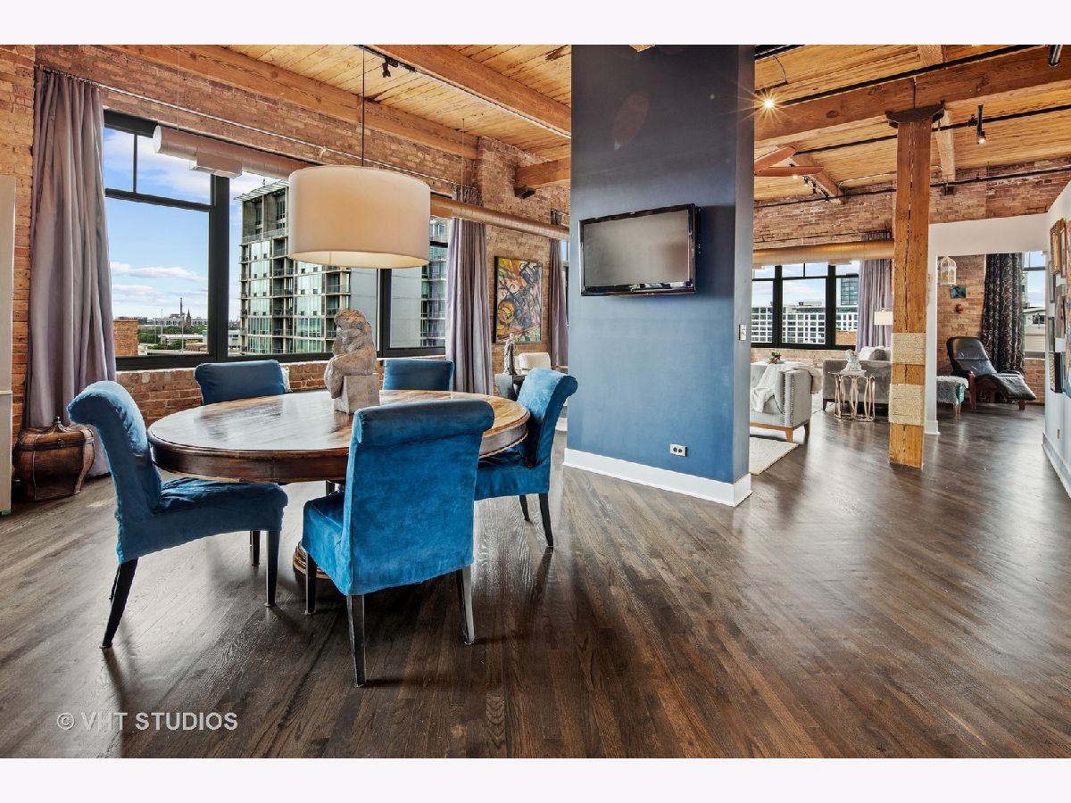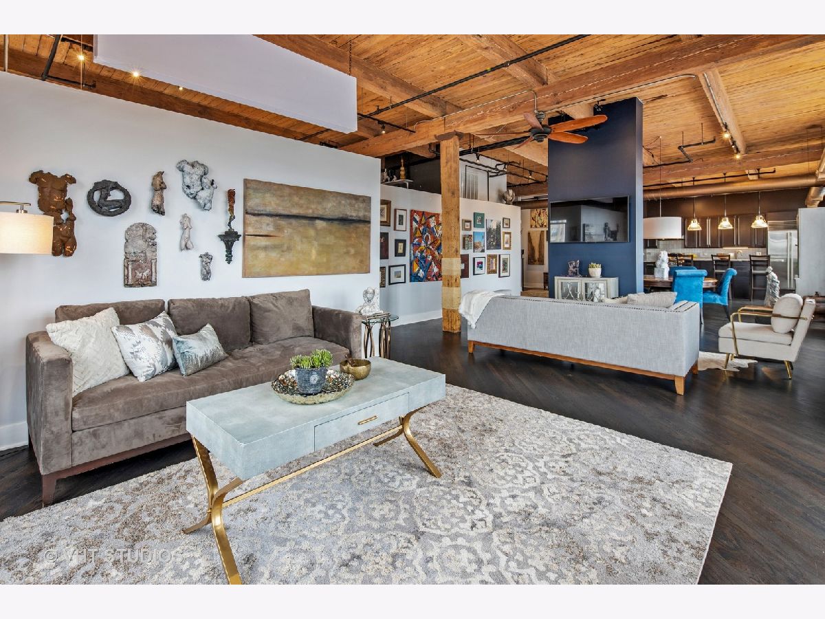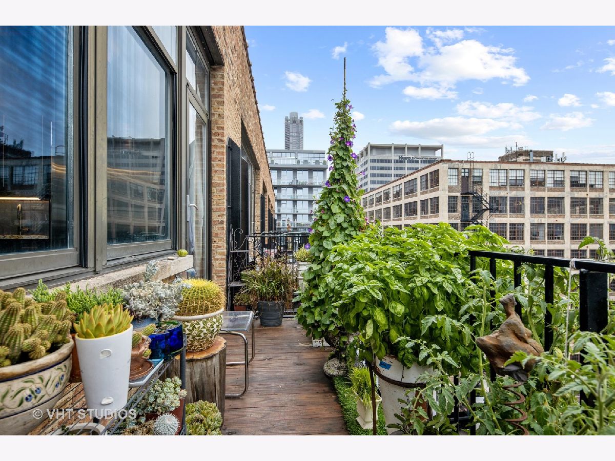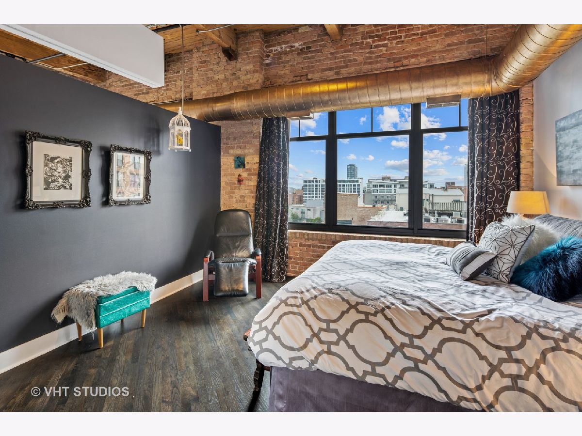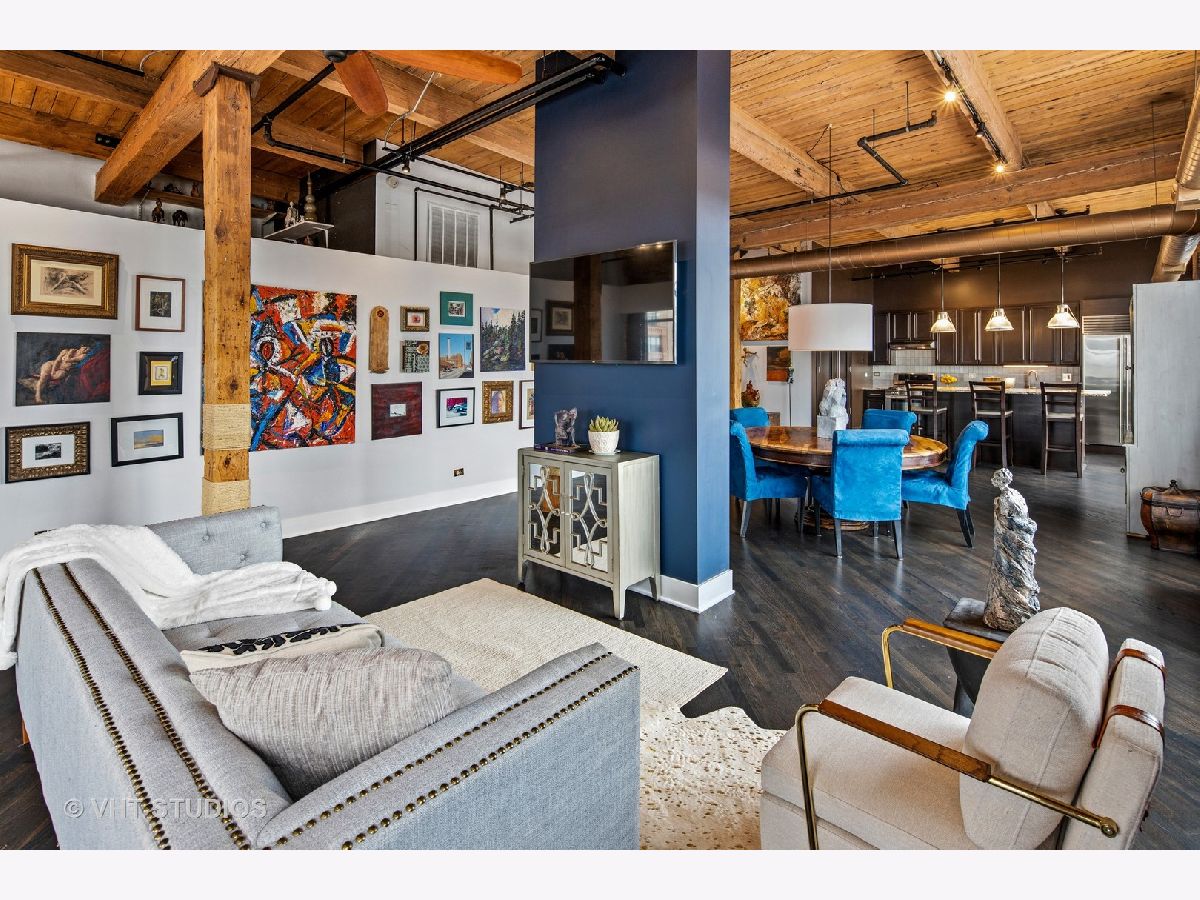 Beautiful penthouse loft filled with natural light in this one-of-a-kind South West corner timber loft at Capitol Hill Lofts in the West Loop that was two units combined from the developer (the top floor "04" two bed two bath with "05" one bed space) creating the largest loft in the building and only one like it with two 16'x5' balconies - one off kitchen for grilling and one off the living room. Filled with character this artist's loft offers exposed brick, soaring 13' timber ceilings, beams and columns, fifteen oversized 7' high loft windows, nearly 60' south-facing wall for all-day sunlight and almost 30' wall of west-facing light for incredible sunset views, and newly refinished, "aged barrel" dark stained hardwood floors throughout. The layout of this corner loft is ideal for the artist-owner who wanted huge open space filled with light in true open loft style with approximately 1,650 sq ft. Renovated chef's kitchen has a large island, quartzite countertops, stainless steel appliances including a SubZero 42" French door refrigerator, and a large walk-in pantry with chalkboard paint on the inside doors for your grocery list, to-do list or favorite recipes. Spacious primary bedroom has a wall of West windows, an organized walk-in closet, attached bathroom with double vanity, quartzite counters, and deep soaking tub with shower. The second full bathroom has a modern floating vanity, 18" Carrera white marble floors, white subway tiles on walls, ceiling and a frameless glass shower for a stylish, clean look. The large foyer is perfect for an art gallery wall and you have the conveniences of front-loading stackable washer/dryer, central air, and gas forced heat. A huge extra-wide attached garage parking space is included and can accommodate the largest SUV. Extra storage cage and bike room storage are included as well as a fitness center, Xfinity high-speed internet and cable, hot water, three elevators, package/mail room, onsite building engineer, and professional property management. Capitol Hill Lofts is a historic elevator building in hot West Loop neighborhood close to everything - transit, restaurants, shops and the Loop, gyms, Whole Foods, Mariano's, Target, Greek Town, Randolph and Fulton Market restaurant districts, 1 block from Heritage Green Park, Old St. Pat's Church, and short walk to Union Station, blue line train station, and more. Plus easy access to all highways for those who commute. A large artist's loft you don't want to miss!
