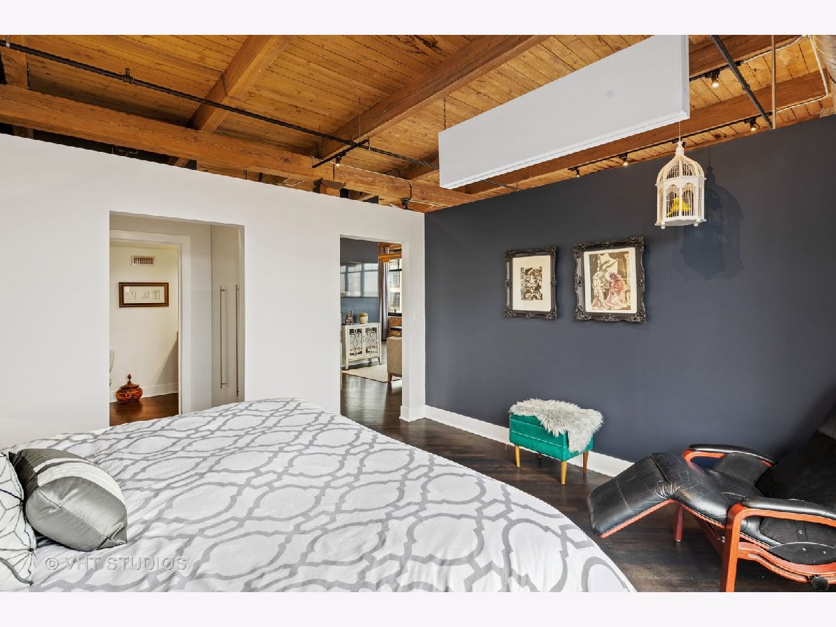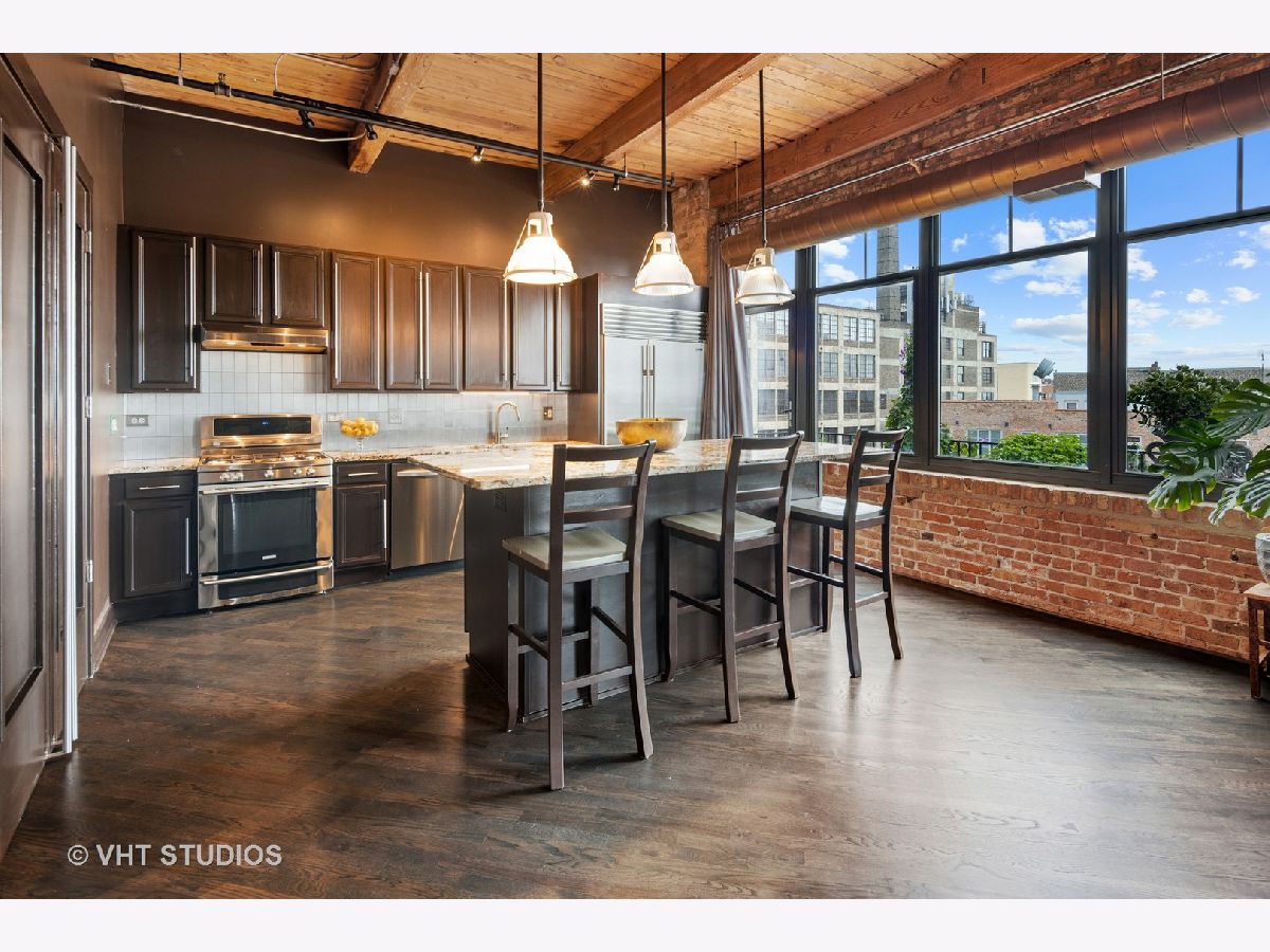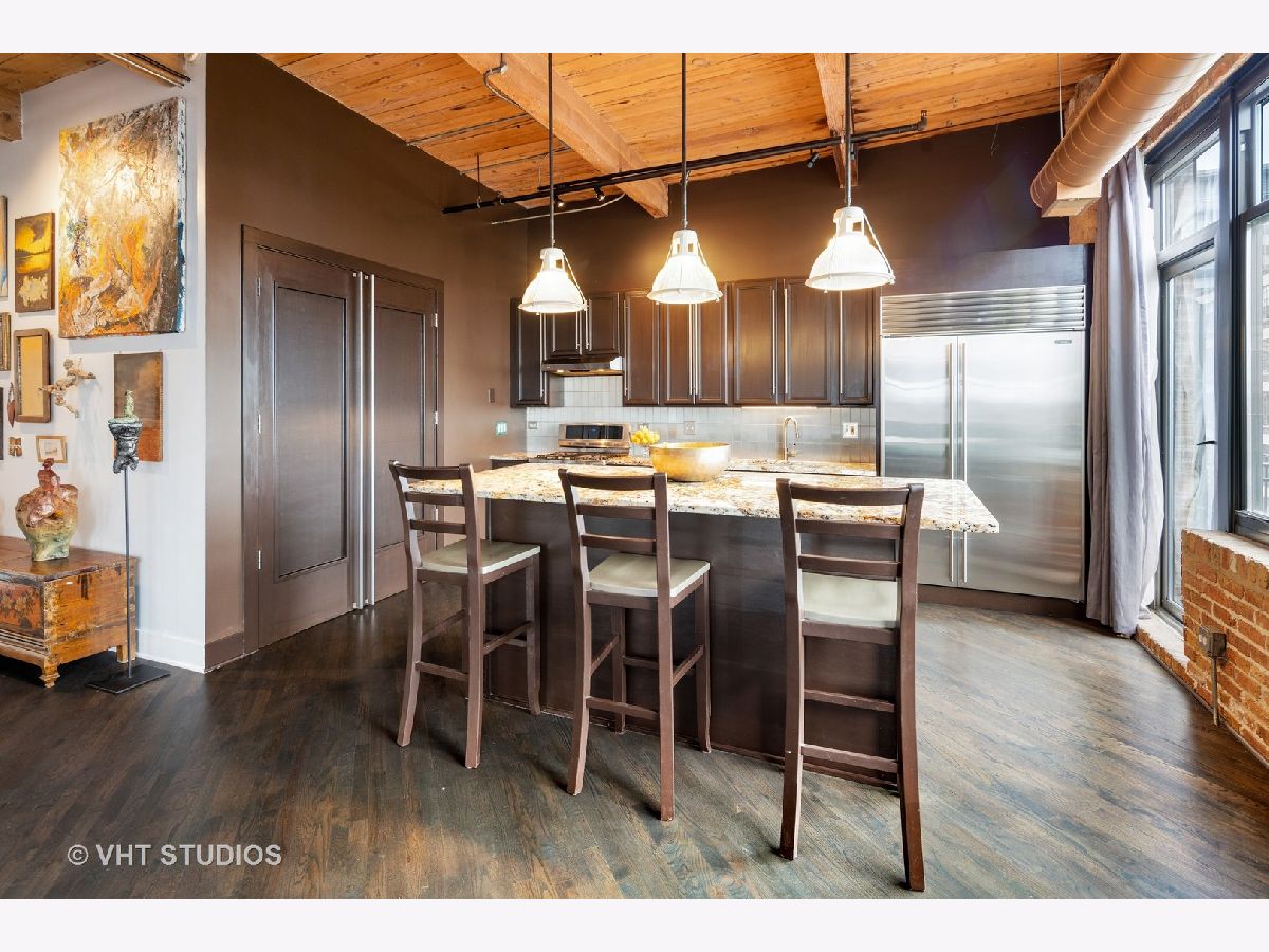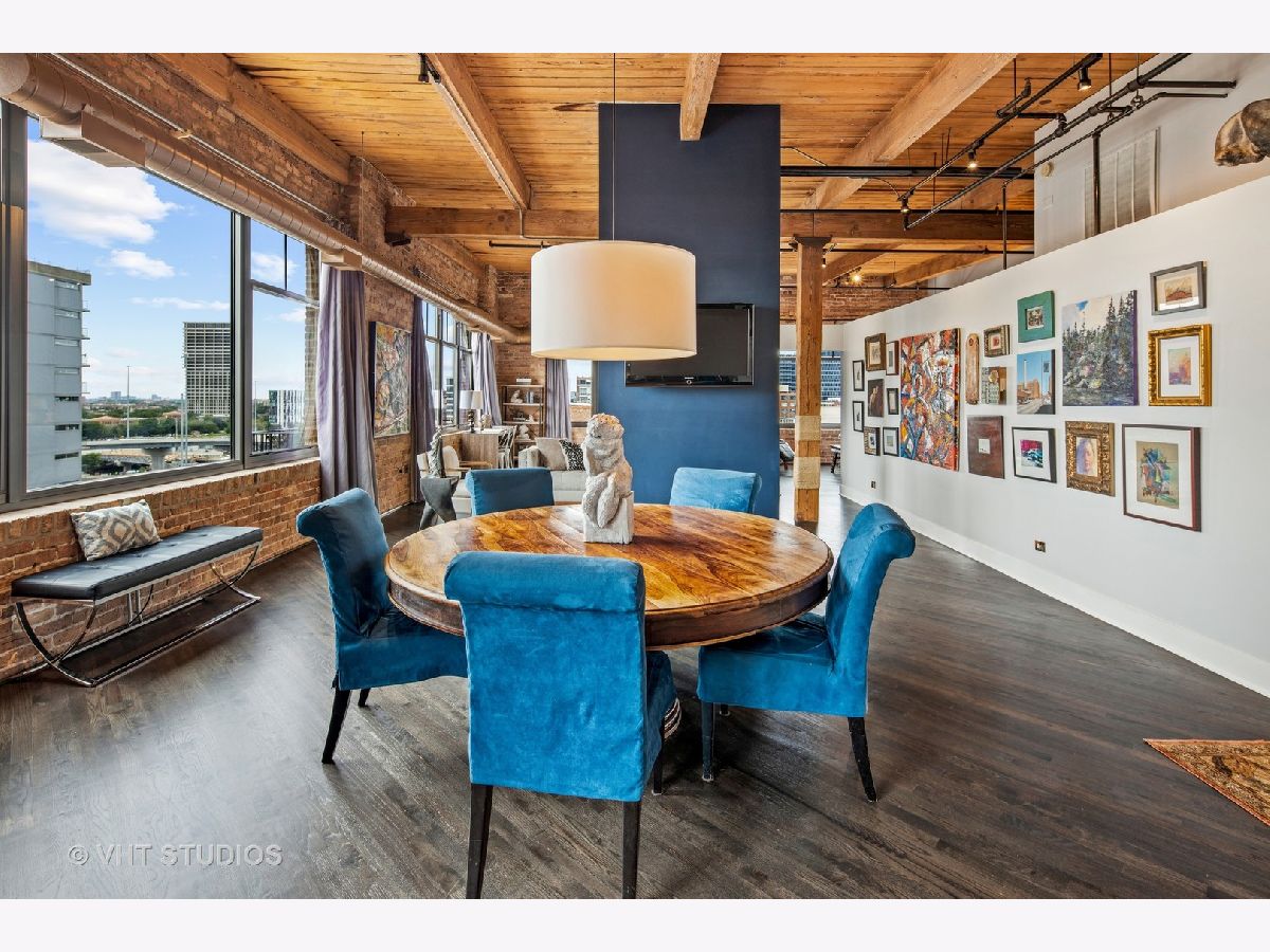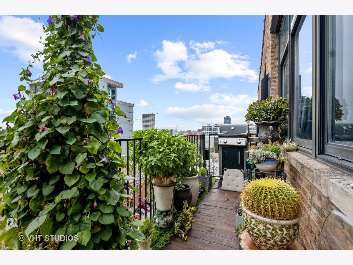 Beautiful penthouse loft filled with natural light in this one-of-a-kind South West corner timber loft at Capitol Hill Lofts in the West Loop that was two units combined from the developer (the top floor "04" two bed two bath with "05" one bed space) creating the largest loft in the building and only one like it with two 16'x5' balconies - one off kitchen for grilling and one off the living room. Filled with character this artist's loft offers exposed brick, soaring 13' timber ceilings, beams and columns, fifteen oversized 7' high loft windows, nearly 60' south-facing wall for all-day sunlight and almost 30' wall of west-facing light for incredible sunset views, and newly refinished, "aged barrel" dark stained hardwood floors throughout. The layout of this corner loft is ideal for the artist-owner who wanted huge open space filled with light in true open loft style with approximately 1,650 sq ft. Renovated chef's kitchen has a large island, quartzite countertops, stainless steel appliances including a SubZero 42" French door refrigerator, and a large walk-in pantry with chalkboard paint on the inside doors for your grocery list, to-do list or favorite recipes. Spacious primary bedroom has a wall of West windows, an organized walk-in closet, attached bathroom with double vanity, quartzite counters, and deep soaking tub with shower. The second full bathroom has a modern floating vanity, 18" Carrera white marble floors, white subway tiles on walls, ceiling and a frameless glass shower for a stylish, clean look. The large foyer is perfect for an art gallery wall and you have the conveniences of front-loading stackable washer/dryer, central air, and gas forced heat. A huge extra-wide attached garage parking space is included and can accommodate the largest SUV. Extra storage cage and bike room storage are included as well as a fitness center, Xfinity high-speed internet and cable, hot water, three elevators, package/mail room, onsite building engineer, and professional property management. Capitol Hill Lofts is a historic elevator building in hot West Loop neighborhood close to everything - transit, restaurants, shops and the Loop, gyms, Whole Foods, Mariano's, Target, Greek Town, Randolph and Fulton Market restaurant districts, 1 block from Heritage Green Park, Old St. Pat's Church, and short walk to Union Station, blue line train station, and more. Plus easy access to all highways for those who commute. A large artist's loft you don't want to miss!