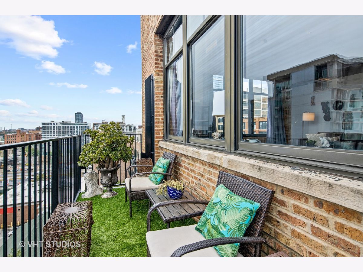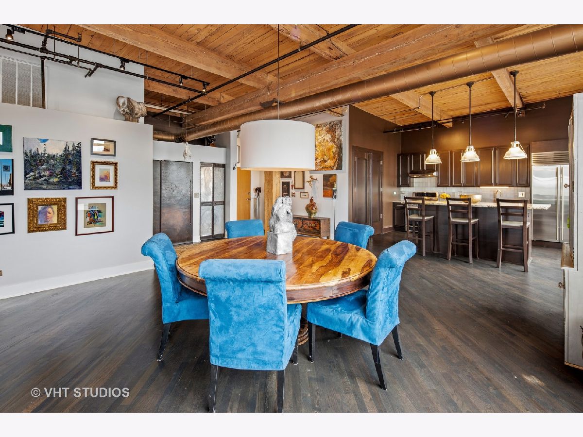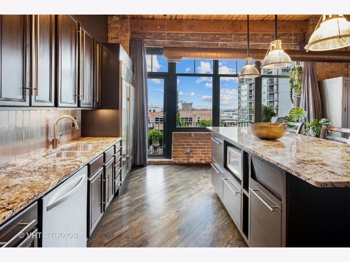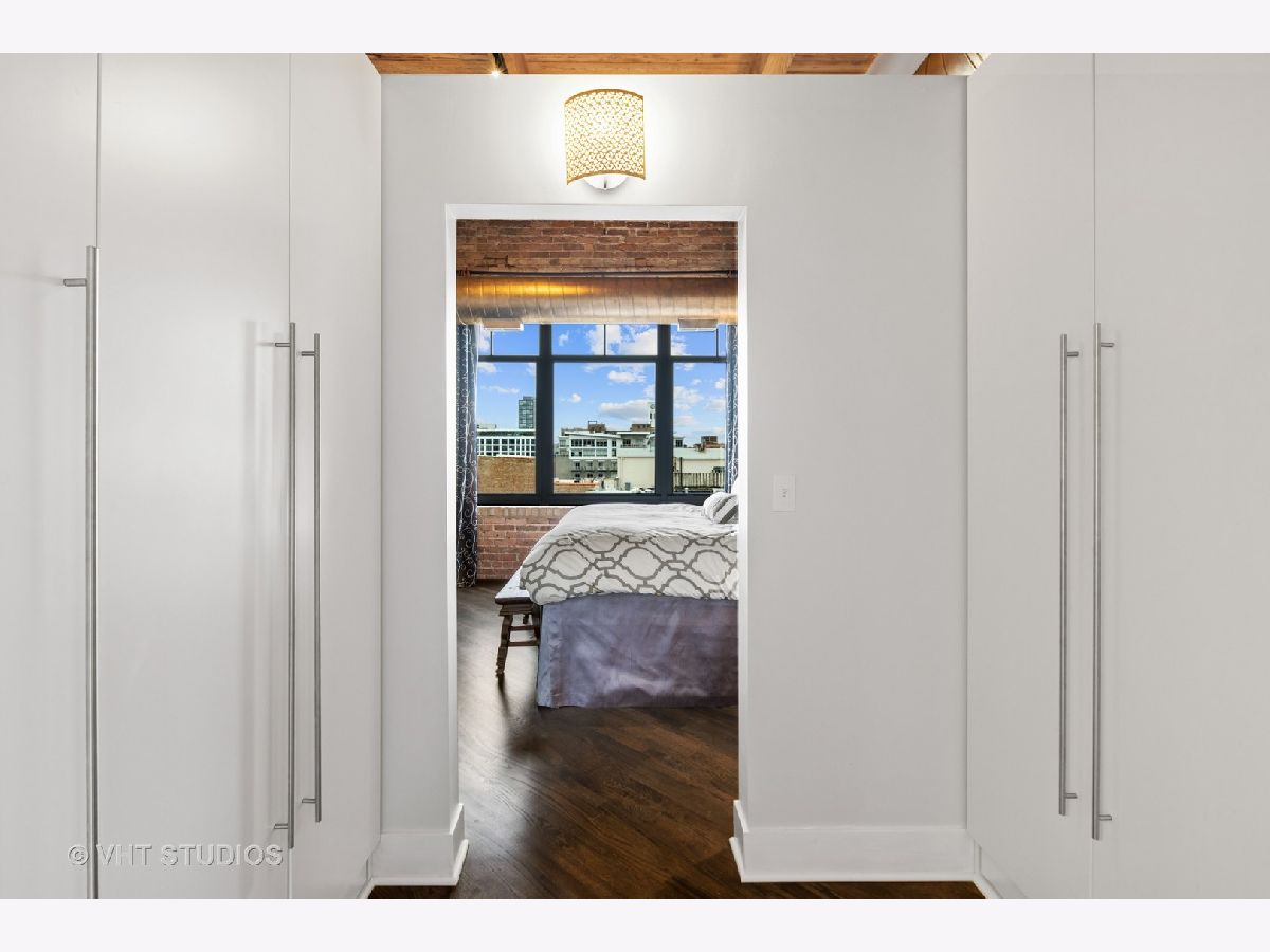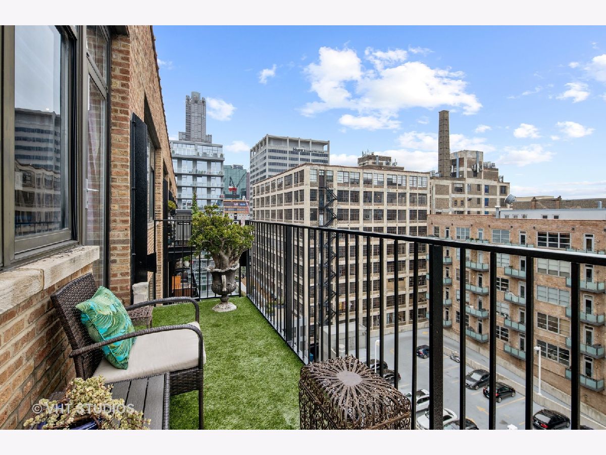 Beautiful penthouse loft filled with natural light in this one-of-a-kind South West corner timber loft at Capitol Hill Lofts in the West Loop that was two units combined from the developer (the top floor "04" two bed two bath with "05" one bed space) creating the largest loft in the building and only one like it with two 16'x5' balconies - one off kitchen for grilling and one off the living room. Filled with character this artist's loft offers exposed brick, soaring 13' timber ceilings, beams and columns, fifteen oversized 7' high loft windows, nearly 60' south-facing wall for all-day sunlight and almost 30' wall of west-facing light for incredible sunset views, and newly refinished, "aged barrel" dark stained hardwood floors throughout. The layout of this corner loft is ideal for the artist-owner who wanted huge open space filled with light in true open loft style with approximately 1,650 sq ft. Renovated chef's kitchen has a large island, quartzite countertops, stainless steel appliances including a SubZero 42" French door refrigerator, and a large walk-in pantry with chalkboard paint on the inside doors for your grocery list, to-do list or favorite recipes. Spacious primary bedroom has a wall of West windows, an organized walk-in closet, attached bathroom with double vanity, quartzite counters, and deep soaking tub with shower. The second full bathroom has a modern floating vanity, 18" Carrera white marble floors, white subway tiles on walls, ceiling and a frameless glass shower for a stylish, clean look. The large foyer is perfect for an art gallery wall and you have the conveniences of front-loading stackable washer/dryer, central air, and gas forced heat. A huge extra-wide attached garage parking space is included and can accommodate the largest SUV. Extra storage cage and bike room storage are included as well as a fitness center, Xfinity high-speed internet and cable, hot water, three elevators, package/mail room, onsite building engineer, and professional property management. Capitol Hill Lofts is a historic elevator building in hot West Loop neighborhood close to everything - transit, restaurants, shops and the Loop, gyms, Whole Foods, Mariano's, Target, Greek Town, Randolph and Fulton Market restaurant districts, 1 block from Heritage Green Park, Old St. Pat's Church, and short walk to Union Station, blue line train station, and more. Plus easy access to all highways for those who commute. A large artist's loft you don't want to miss!