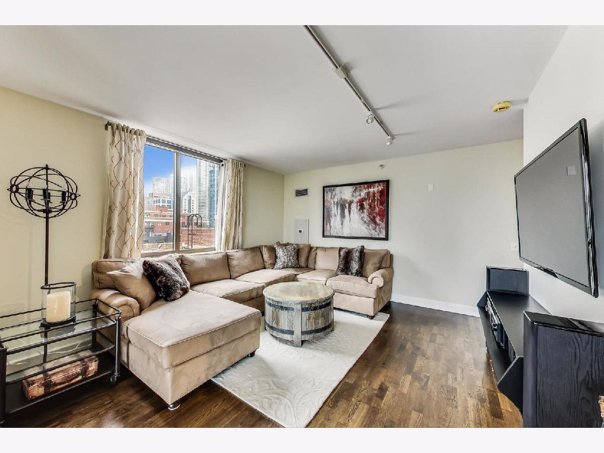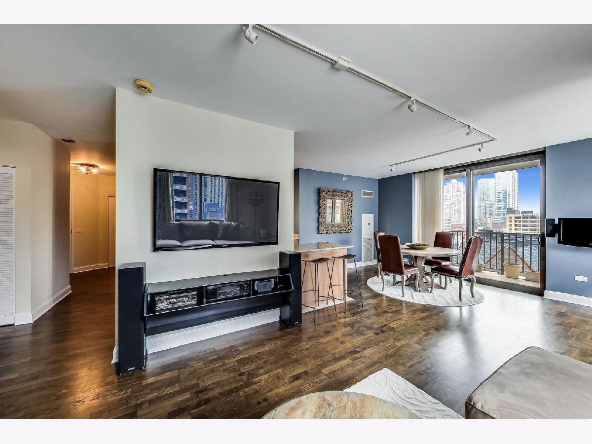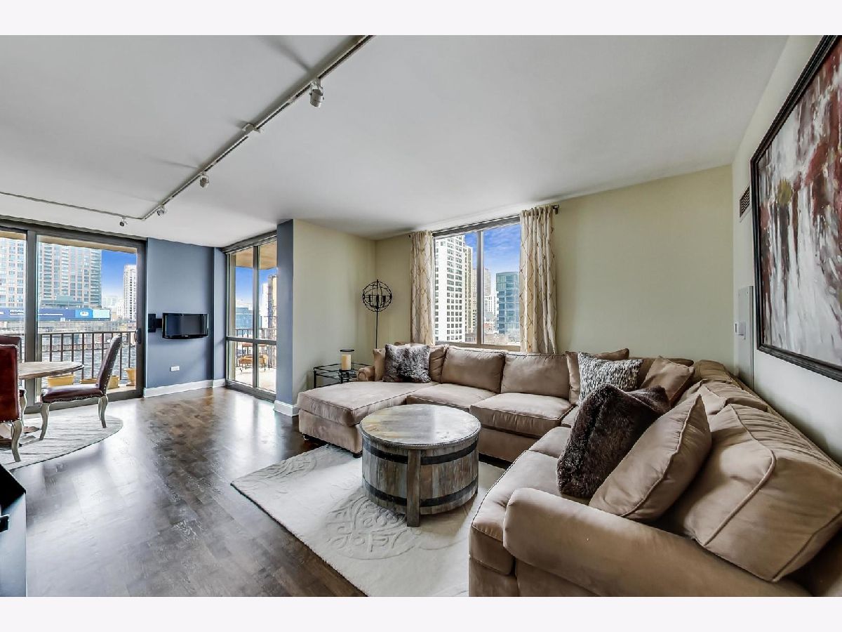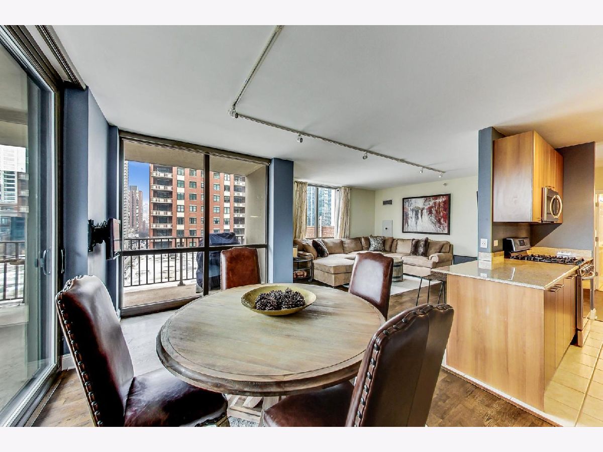 Come see this sleek home boasting city views in the heart of River North! This 2 bed, 2 bath home features a massive private balcony, and an amazing primary suite. Enter into an inviting proper foyer with a coat closet, direct access to your primary suite, and a hallway that expands to your main living area. The spacious living+dining area with track lighting, floor-to-ceiling windows, and direct access to a wraparound private balcony off of the dining area encourages year around hosting. Beautiful semi-closed kitchen with modern backsplash, breakfast bar (seating for 2), stainless steel appliances, granite countertops, and ample cabinet & meal prep space. Impressive primary suite boasting a walk-in closet, TWO additional closets, unique light fixture, and soothing ensuite bath with a separate shower & tub and dual vanity with an oversized mirror. Top it off with another full-sized bedroom with ample closet space, and easy access to your 2nd full bath & in-unit laundry. Great building amenities such as 24/7 doorman, fitness center, guest suite, and community room. Assessments include heat, a/c, gas, water, and cable. Just a stroll away from grocery stores (Whole Foods, Trader Joe's), Mag Mile, public transportation, and delicious dining restaurants at your fingertips. Make this your home before it's too late!