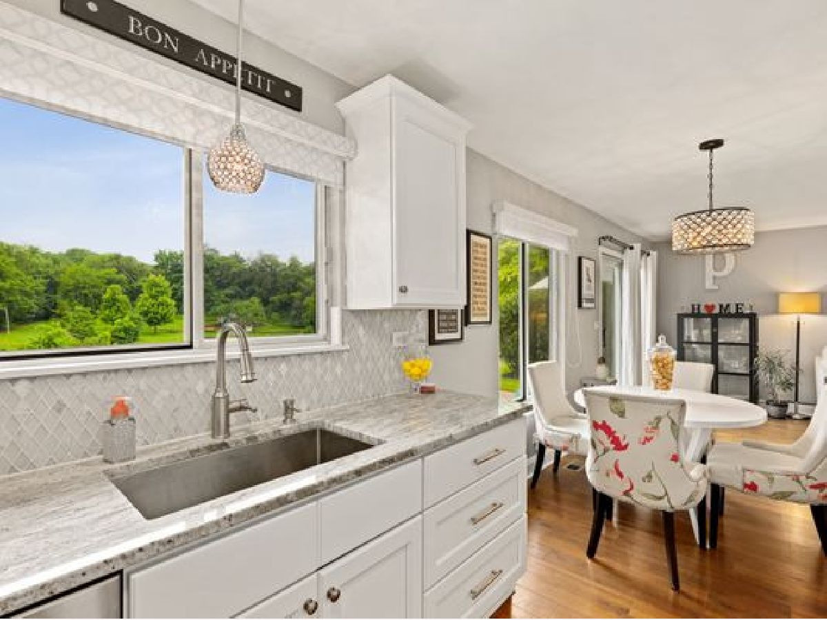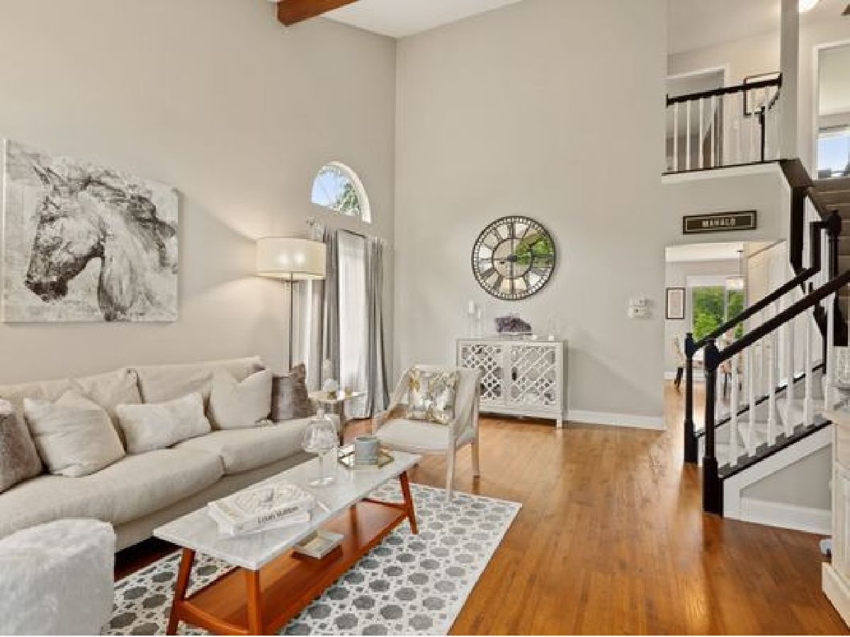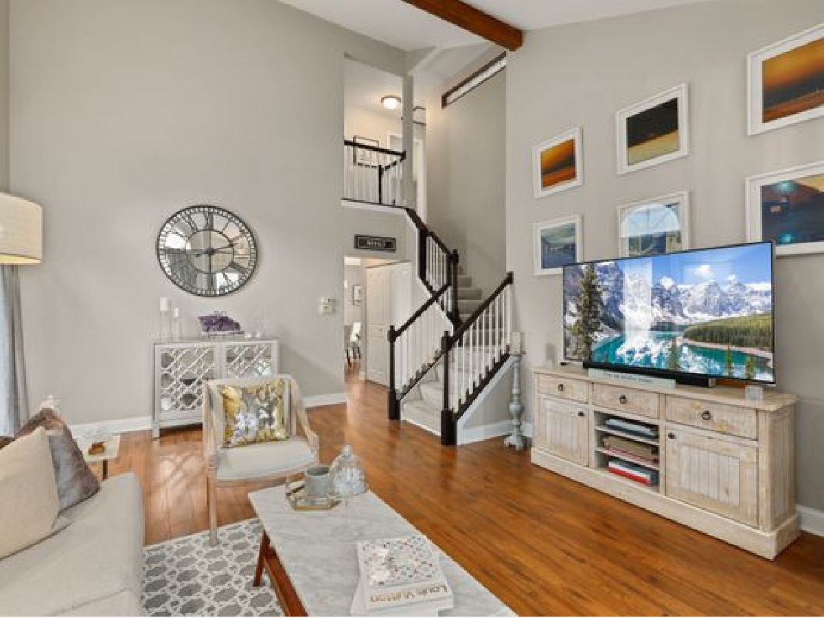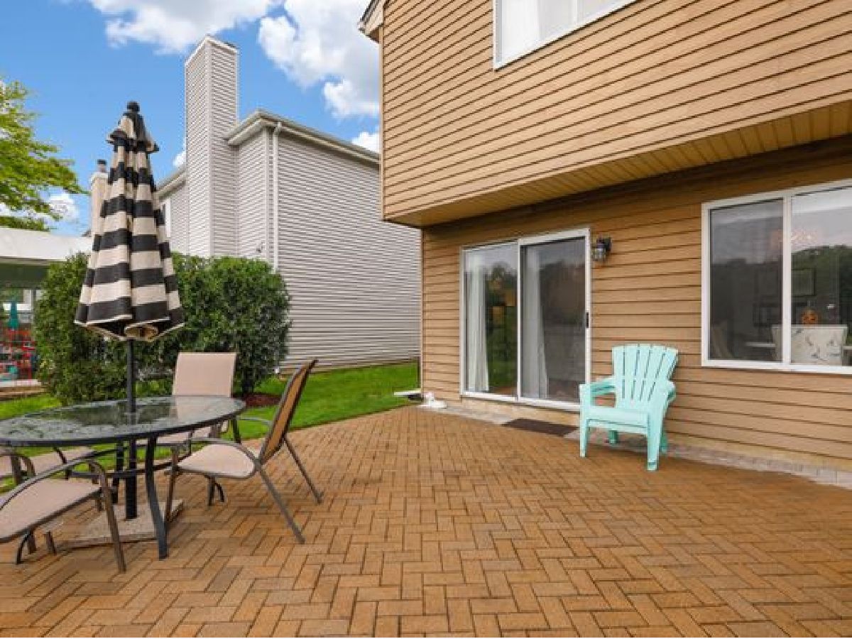 Delightful updates are found in this modern 3 bedroom 1.5 bath home with water views in desired Green Trails Subdivision!! Today's colors showcase the high beamed ceilings in the living room, the tall windows let abundant streams of natural light flow seamlessly throughout the well appointed first floor which features a functional and beautiful kitchen with SS appliances, white cabinetry with coordinating backsplash and granite countertops. Additional clever use of space allows for a pantry and washer/dryer closet plus utility area. Updated powder room with loads of cabinet space is conveniently located in the first floor too. Sip your favorite drink overlooking the green space and water from the dinette, the open concept family room or outdoors in the newly installed paver patio. Durable and stylish wood laminate flooring throughout the main floor complete the look and add to the enjoyment. Elegant staircase leads to upper floor bedrooms and full bath. Owner's suite has double closets and has private access to the bathroom. Water views from bedrooms!! This home also has an attached two car garage. Backyard with large brick paver patio, walking path that leads straight to College Road Park. Top rated Naperville schools and proximity to main roads for easy access to shopping, dining, entertainment venues and plenty more!