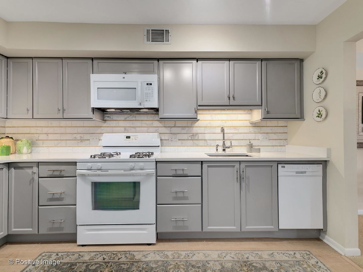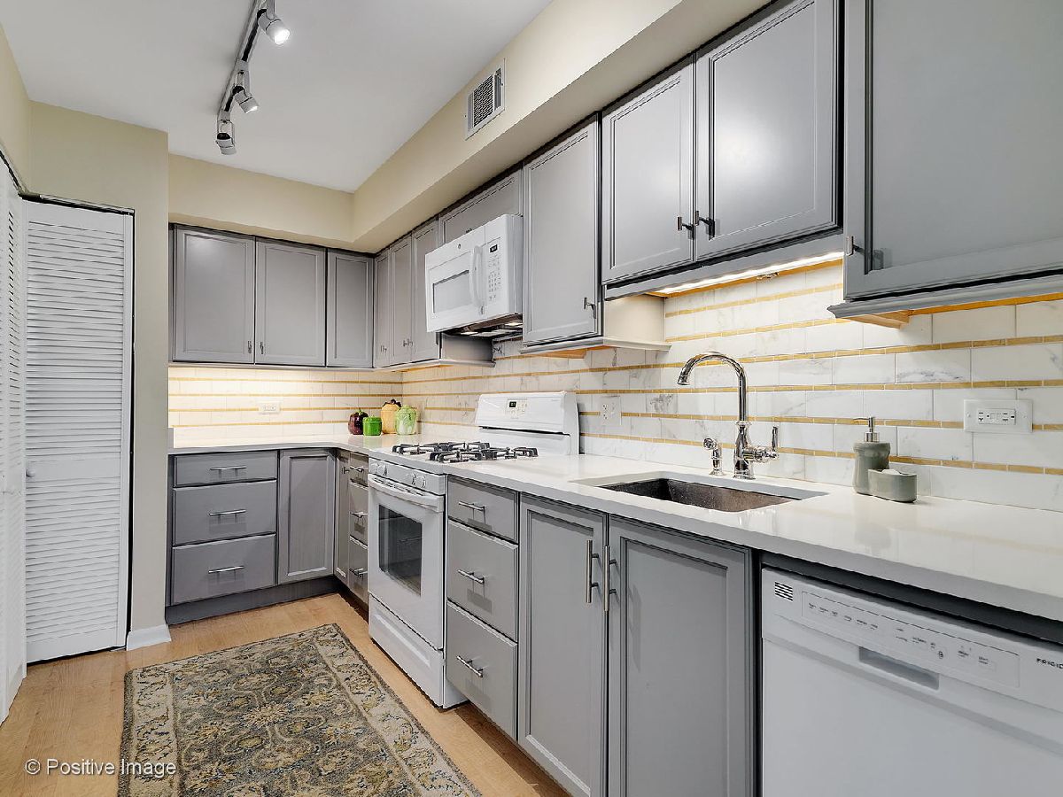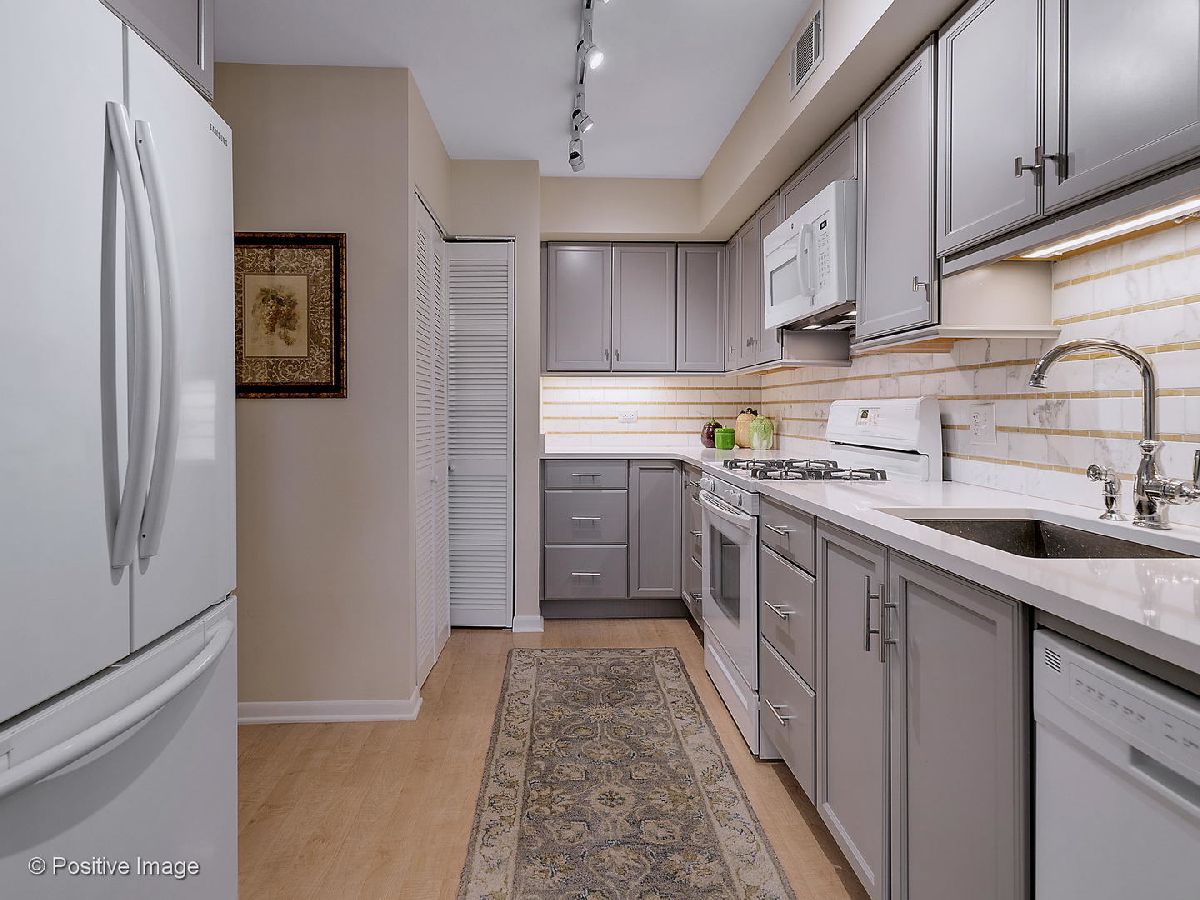 Impressive two bedroom and two full bath unit renovated and move in ready. Desirable third floor location in an elevator building. Pretty kitchen 2015 with shaker style cabinetry and gorgeous Calcutta Gold marble backsplash, quartz counters, Kohler stainless steel sink, Samsung refrigerator, Frigidaire dishwasher, Whirlpool gas stove. In unit laundry with GE full size stackable washer and dryer included. Open design for the dining room and generous living room allows for the flexibility for entertaining. Sliding door off the living room lead to the private balcony. Master suite has walk-in closet with organized shelving and private bath. Second bedroom with closet including organized shelving and opens to hall as well as living room. Both full baths have been updated. Storage unit on this floor for easy access. New CAC 2015, new roof 2015, In building parking (space #44). Great complex with pool, tennis courts, easy access to Whole Foods and other shops.