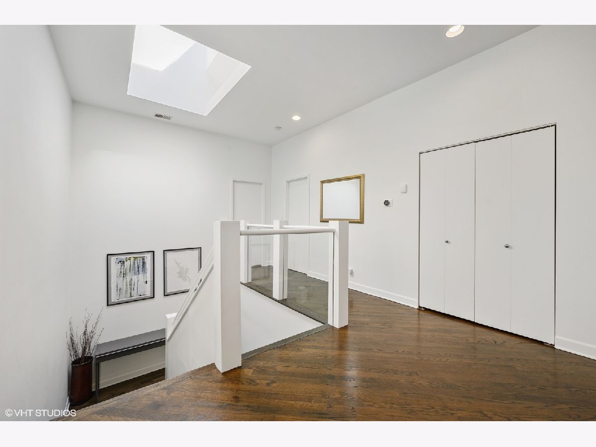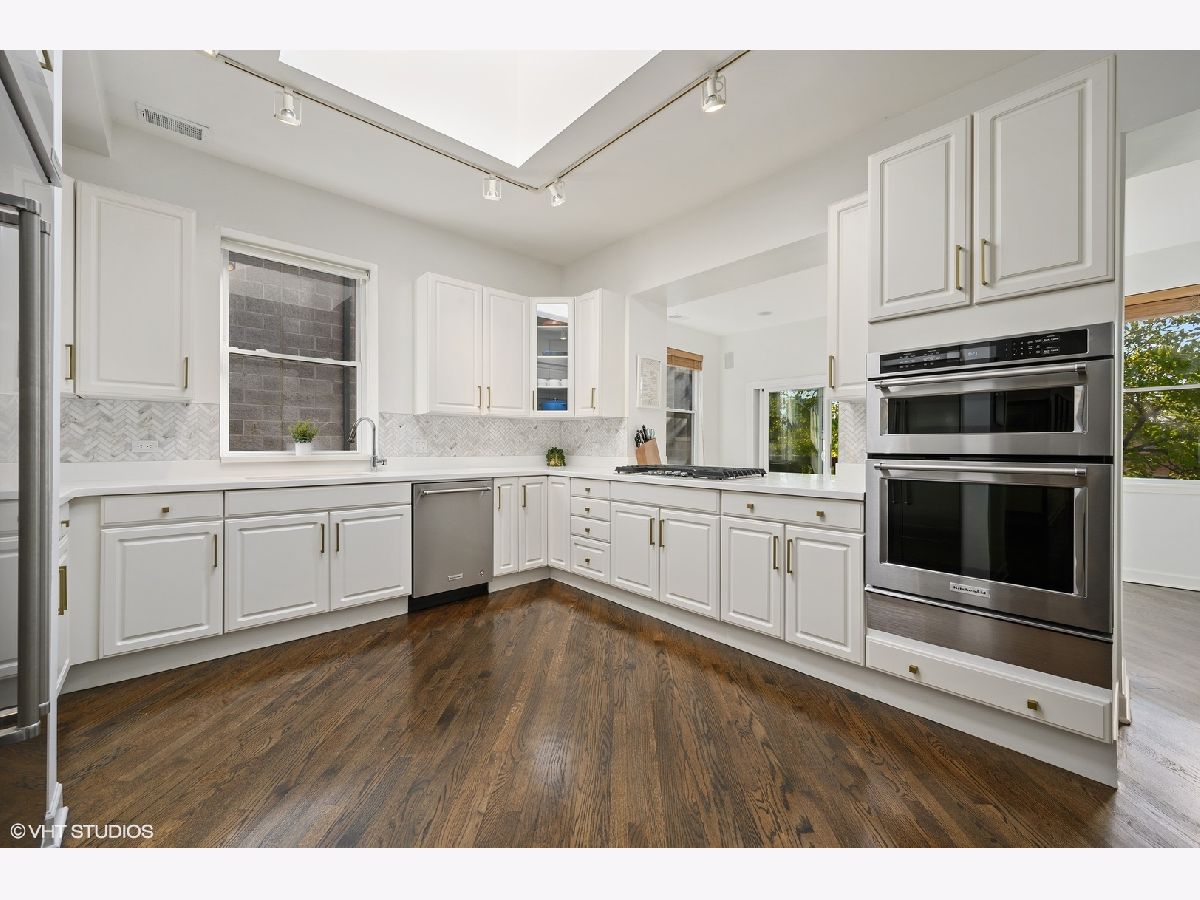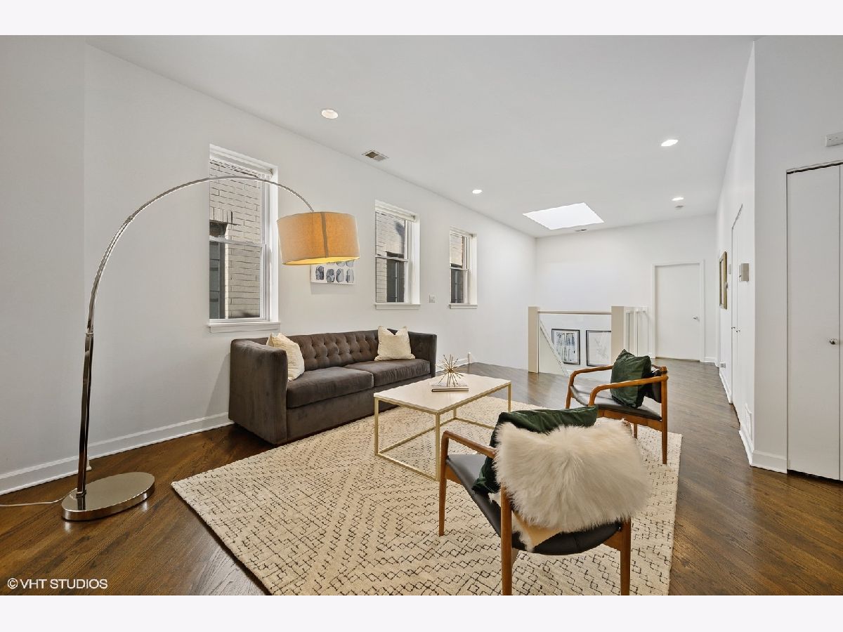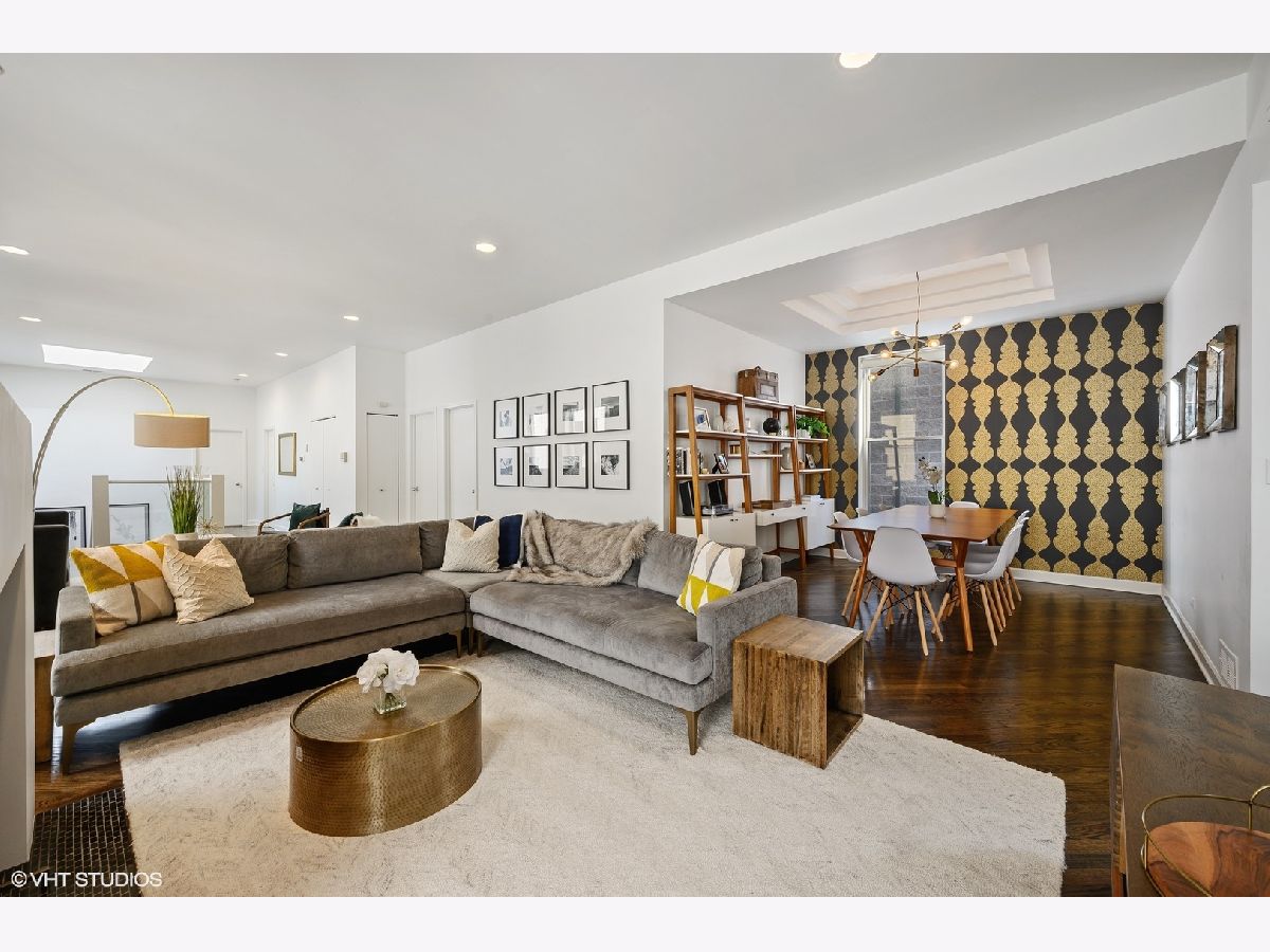 Striking magazine caliber East Lakeview penthouse in a circa 1900 Greystone in highly desirable NETTELHORST school district! With over 2400 sqft of living space, this EXTRA-WIDE and meticulously designed vintage renovation boasts an ideal and expansive layout that will wow you upon entry with a wall of windows and skylight drenching this home with natural light. Oversized living room can be split into living and family room or play zone, features a wood burning fireplace with gas starter, refinished hardwood floors, stunning formal dining room with triple tray ceilings and designer chandelier. Gourmet kitchen offers stainless steel appliances and designer tile backsplash, all wrapped around a skylight so you are drenched in sunlight in every inch of this home! Large breakfast room off of the kitchen opens directly to a private deck overlooking a 60 ft tree. Huge primary suite features a tray ceiling and charming bay window with treetop views making the area perfect for a reading nook or home office. Primary bath boasts a skylight illuminating the oversized jacuzzi, glass shower, and floating dual vanity. Spacious second and third bedrooms, second bath, and huge laundry room with tons of storage complete this exceptional home. TWO parking spots, one garage and one exterior. Roof rights to this unit. Located on one of the most charming blocks in Lakeview, steps from restaurants, gyms, and shops such as Maison Marcel, Lakeview Athletic Club, Intelligentsia, Starbucks, Mortar & Pestle, Target, Jewel Osco, Marianos, gyms, lakefront, Belmont brown, purple, and red line. If you are looking for a one-of-a-kind, spacious, and custom home with charming vintage details in A++ East Lakeview location, look no further! Welcome home!