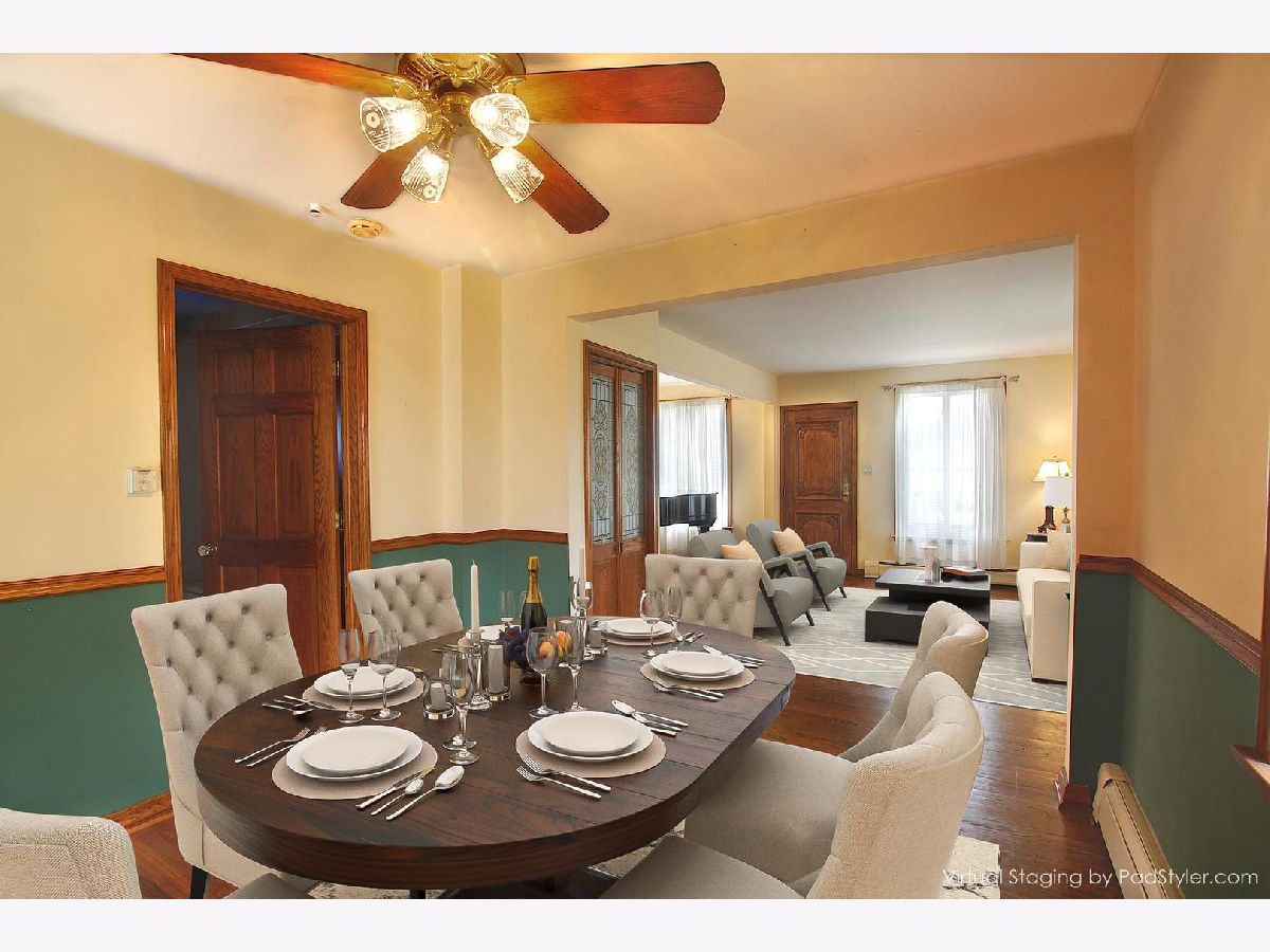 Move-in ready Victorian with beautiful stained-glass windows designed for the home on both main and upstairs levels awaits a new family to call home. An intricate solid wood raised panel front door leads into a spacious living room that flows into a separate dining area both with hardwood flooring perfect for large family gatherings. There is a full size eat-in kitchen with wood cabinetry, pantry, beverage center and large windows which allows plenty of natural light perfect for casual dining overlooking the yard. The main level finishes out with an artistry hand painted full bath. A newly carpeted upstairs finds a large primary bedroom with two double walk-in closets along with 2 additional bedrooms all with solid core panel doors and an additional 1/2 bath. This home comes with a Utica gas-pac boiler and baseboard heat, a finished basement with wet bar and another 1/2 bath. The 60' wide lot offers a gardeners dream with a rear and side yard in need of some TLC. When in bloom it is a pollinator garden and monarch habitat also designed to provide a habitat for birds and some pollinators. A large deck overlooks a fenced in backyard and brick side drive leading to a 19' x 15' garage. Walking distance to both downtown Tinley Park and the Metra station. This home provides both convenience and character. Home is being sold in AS IS condition.