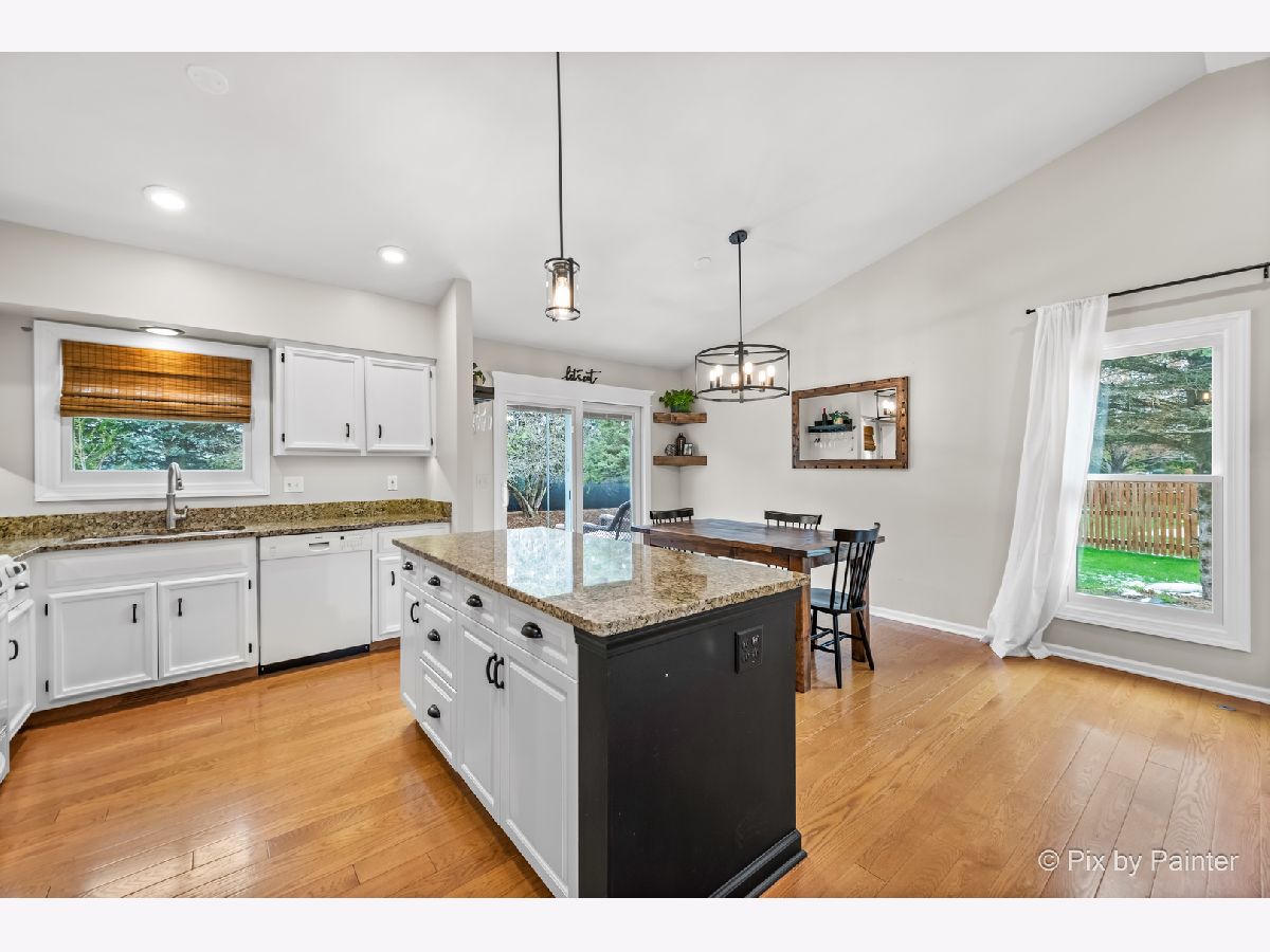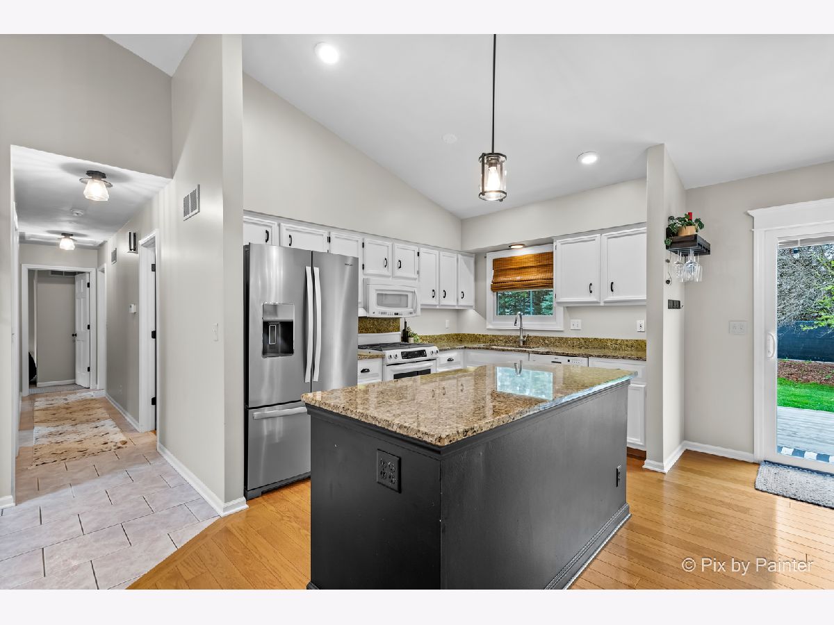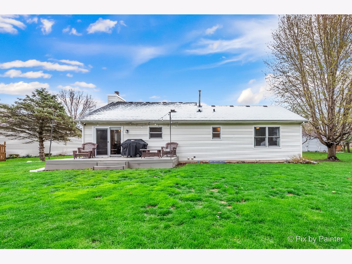 Beautifully updated and move-in ready 4 bed, 2 bath ranch home with full finished basement. Vaulted ceilings throughout the main level living areas including the updated kitchen with white cabinetry, granite counters, sizable island and hardwood flooring that continues into the dining room and living room with a dramatic floor to ceiling fireplace. Sliders off the dining room lead to a maintenance free deck and one of the largest and most private yards in the neighborhood. Sizeable master with walk-in closet and ensuite full bath. Two additional bedrooms and another full bath complete the main level. The finished lower level has a generously sized family room with adjacent bar area, another bedroom, laundry room, and tons of storage including a separate storage area that is rough plumbed for another bathroom. Attached 2 car heated garage with epoxied flooring. Updated lighting and recently painted throughout. Walking distance to Lions Park and up and coming downtown Elburn.