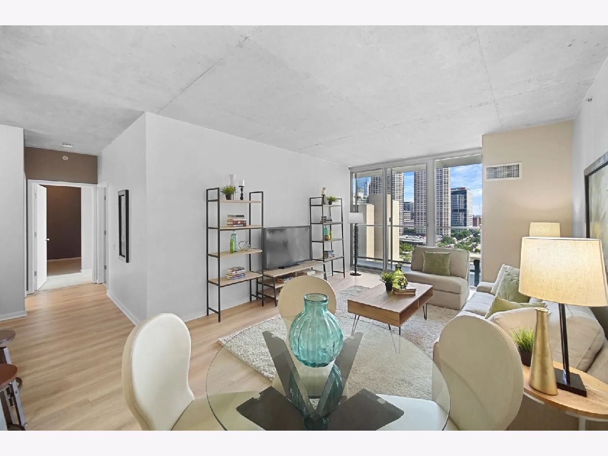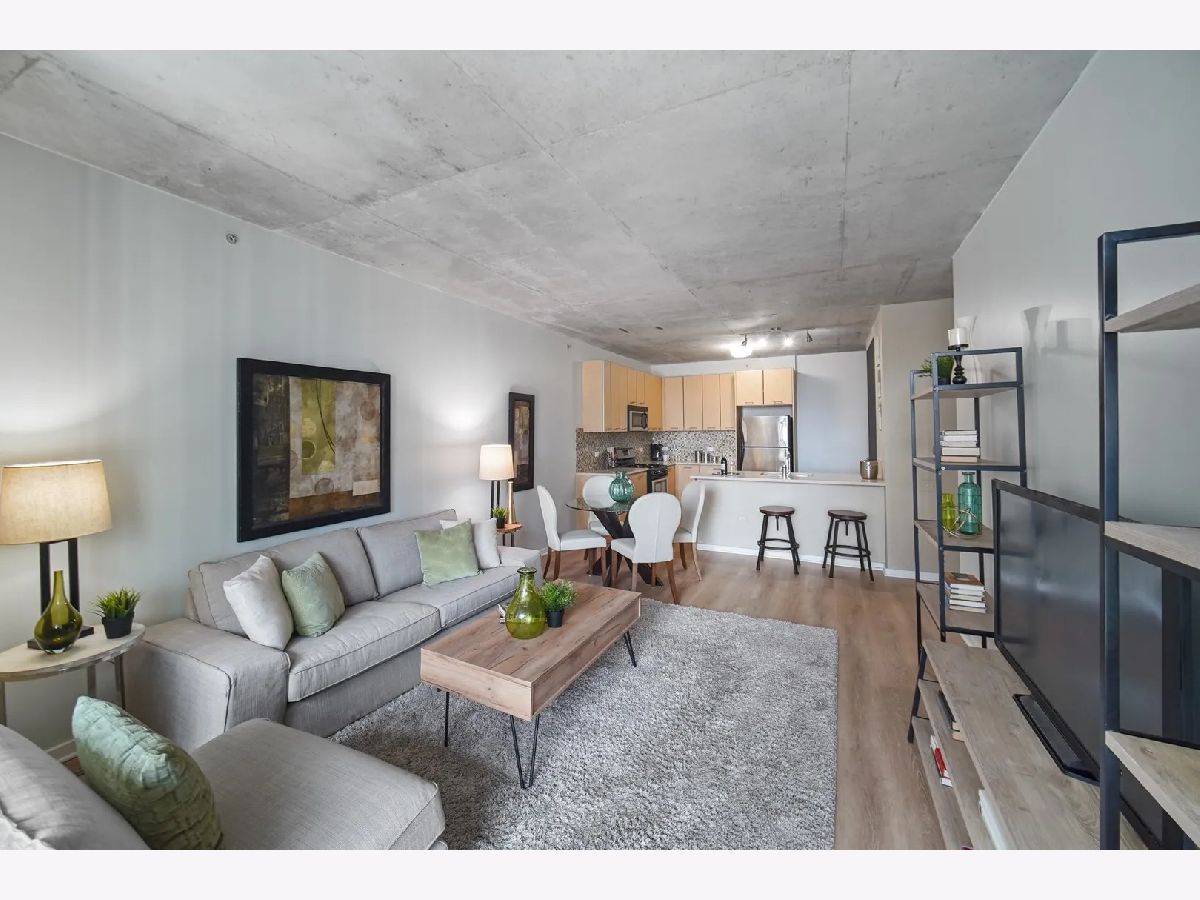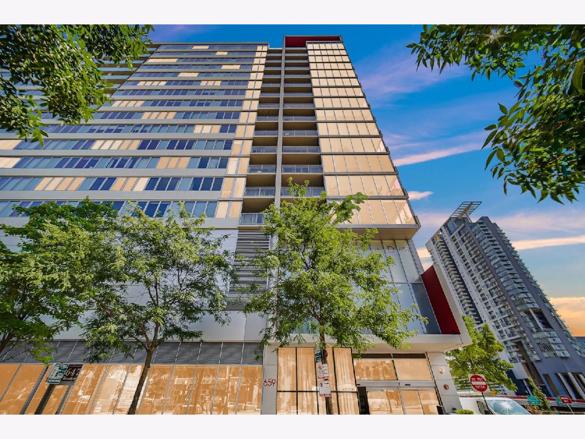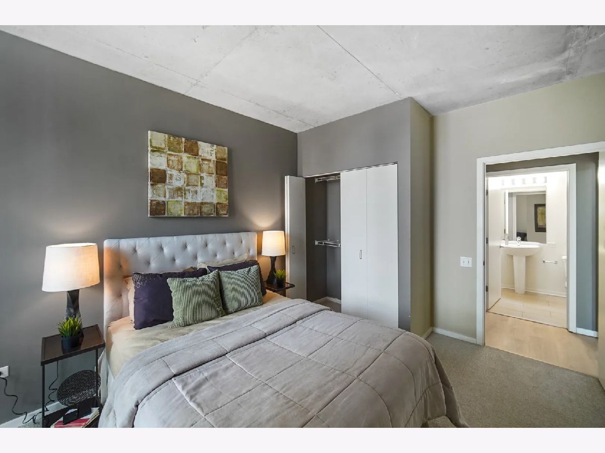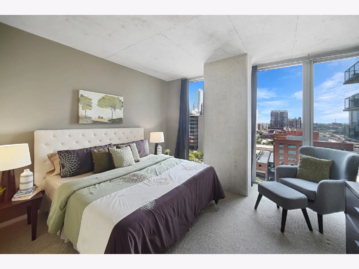 Sundrenched 2 bed 2 bath condo in popular West Loop R+D659. This beautiful concrete loft has it all! The bedrooms are fully enclosed and have floor to ceiling south facing windows. The kitchen features 42" cabinets, blonde stone counter tops, stainless steel appliances and a breakfast bar for dining. The primary suite has plenty of space for a king size bed, a huge walk-in closet, and spa bath with separate soaking tub, shower, and a double bowl vanity. Sunlight streams through the south facing floor to ceiling windows with city views. Enjoy the balcony for dining and a view of the outdoor pool. This home features New Luxury Vinyl flooring 2024, In unit washer dryer, Freshly painted, and a tech nook for your home office. This full amenity building features 24 hour door staff, pool, workout room, and bike storage. Assessment includes basic cable, internet, pool, gym, dog run and 24/7 door staff (everything except electric). Indoor heated garage parking for one car additional $30K. Walk to all the amazing West Loop and Fulton Market bars, coffee shops, gyms and restaurants, shopping, CTA, and have easy access to the highway and the Chicago Loop!