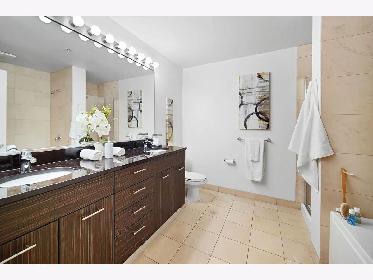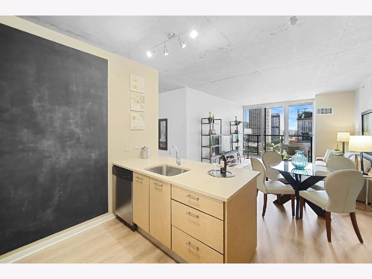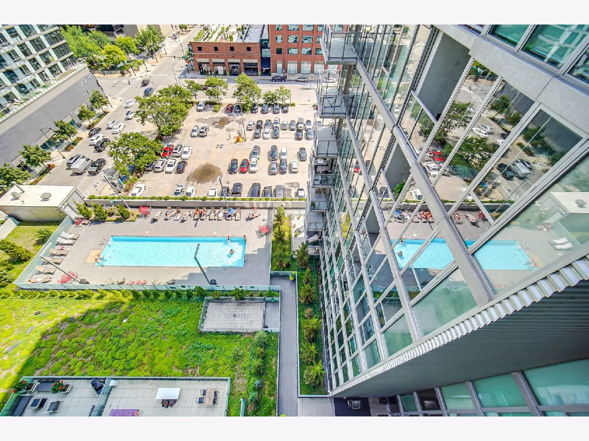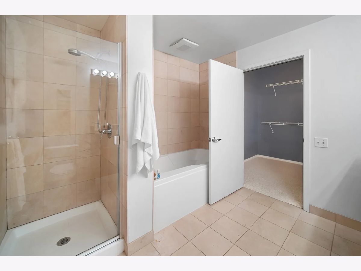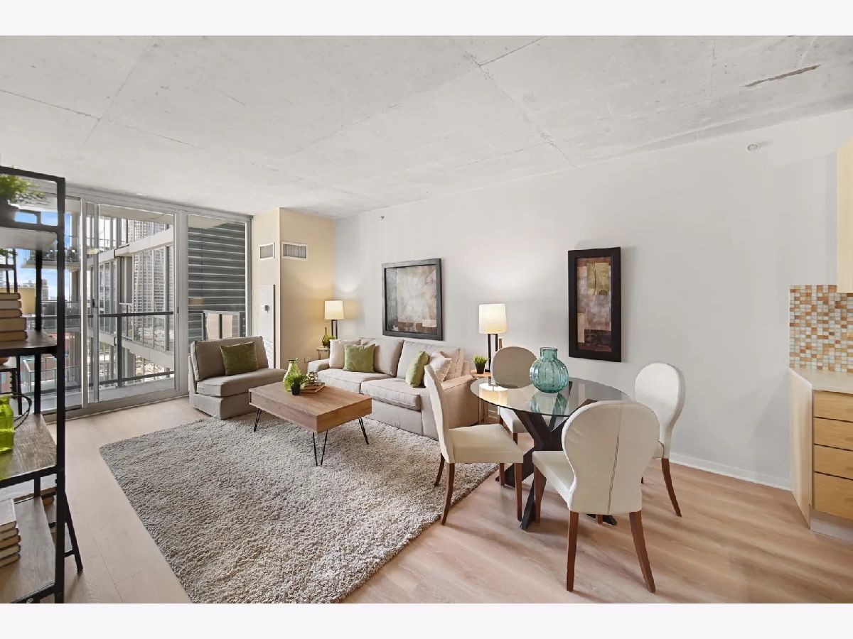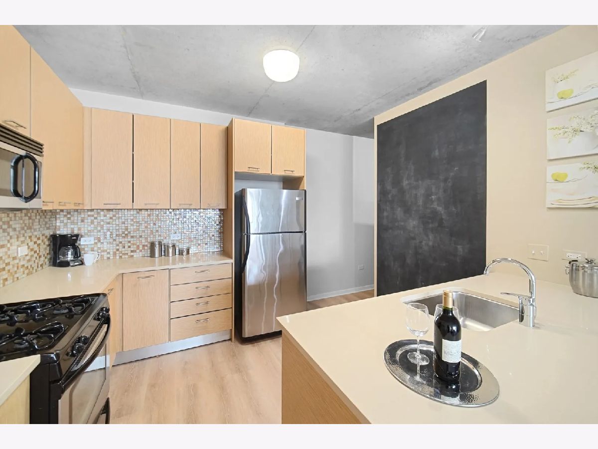 Sundrenched 2 bed 2 bath condo in popular West Loop R+D659. This beautiful concrete loft has it all! The bedrooms are fully enclosed and have floor to ceiling south facing windows. The kitchen features 42" cabinets, blonde stone counter tops, stainless steel appliances and a breakfast bar for dining. The primary suite has plenty of space for a king size bed, a huge walk-in closet, and spa bath with separate soaking tub, shower, and a double bowl vanity. Sunlight streams through the south facing floor to ceiling windows with city views. Enjoy the balcony for dining and a view of the outdoor pool. This home features New Luxury Vinyl flooring 2024, In unit washer dryer, Freshly painted, and a tech nook for your home office. This full amenity building features 24 hour door staff, pool, workout room, and bike storage. Assessment includes basic cable, internet, pool, gym, dog run and 24/7 door staff (everything except electric). Indoor heated garage parking for one car additional $30K. Walk to all the amazing West Loop and Fulton Market bars, coffee shops, gyms and restaurants, shopping, CTA, and have easy access to the highway and the Chicago Loop!