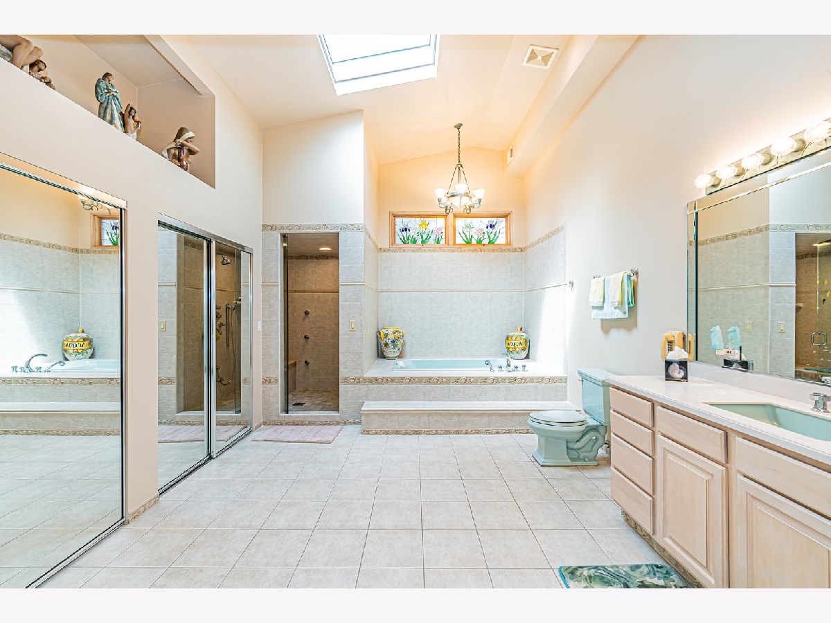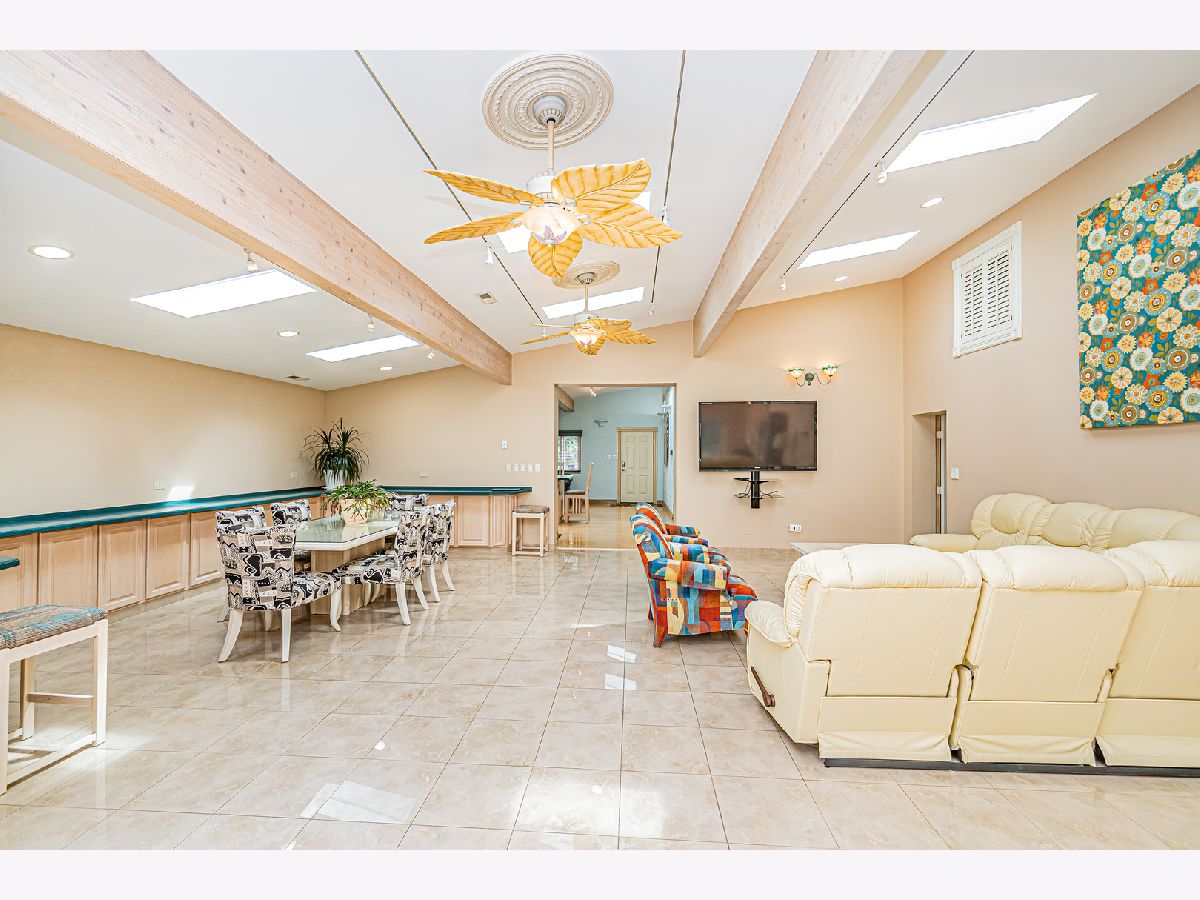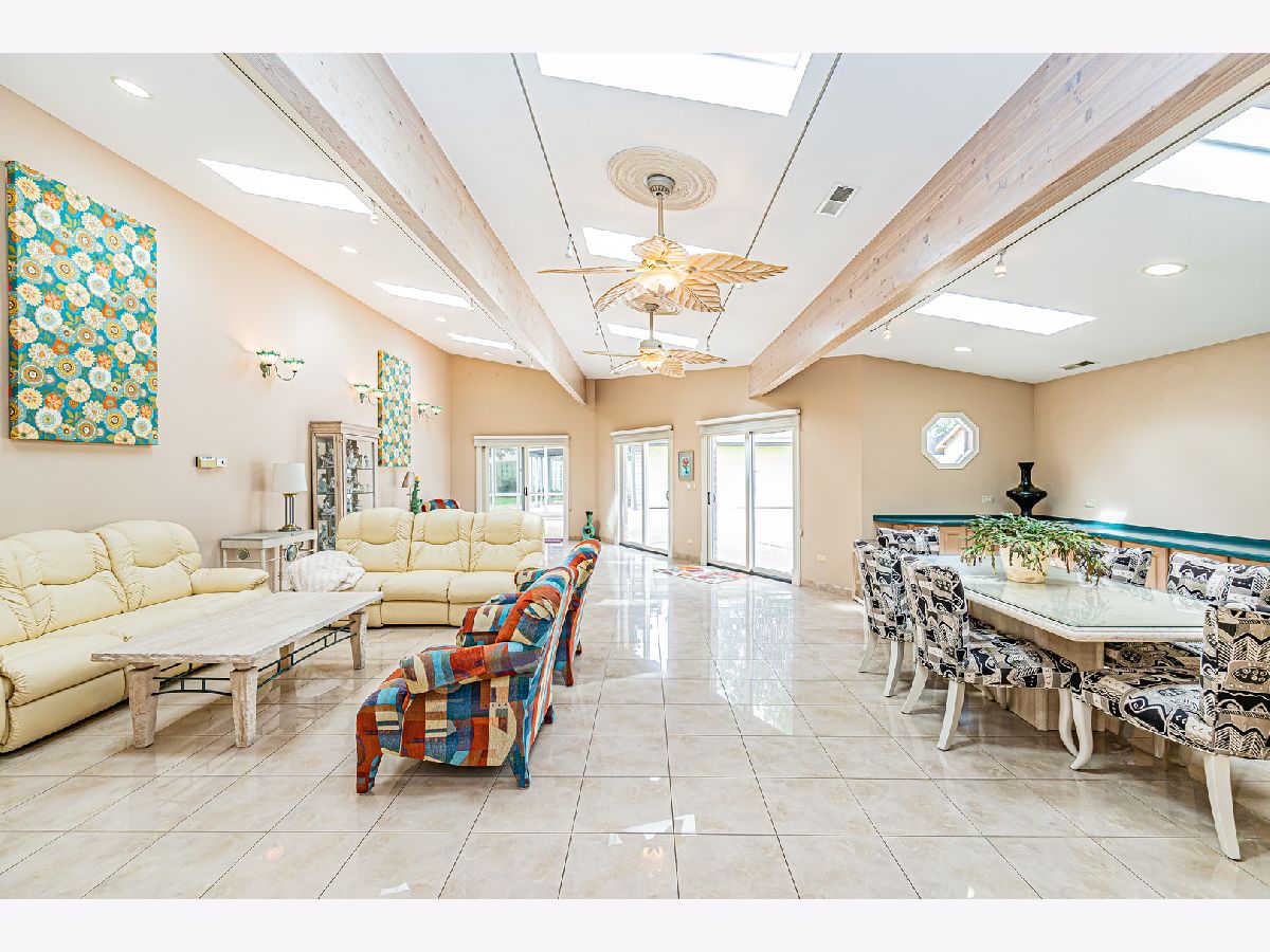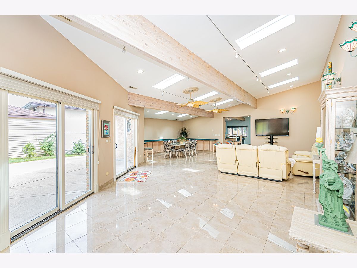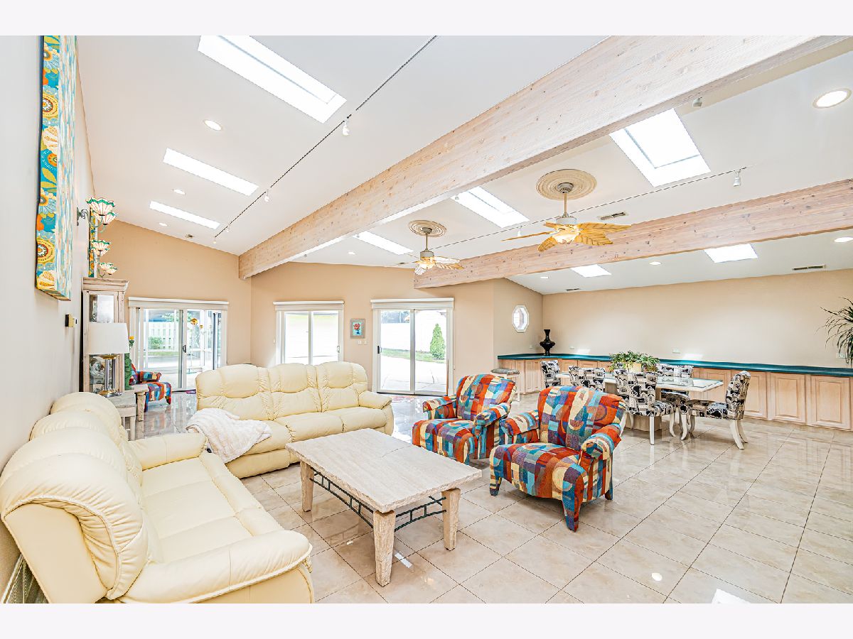 Estate Sale "As Is". Original owner & meticulously maintained. NEW roof in 2019. 2342 SQF + 526 SQF rec room. Beautiful tree lined street. **Enormous great room with vaulted ceilings, beams & skylights, perfect for entertaining. **Main level master bedroom featuring luxurious spa bath. **Finished rec room with full bath. **Upper level originally 3 bedroom converted to two bdrm. **Kitchen features double oven and island. Enjoy a fire in the enclosed sunroom during snowfalls. Covered outdoor patio & fenced yard. Near shopping, I-294, parks, Metra train & more!