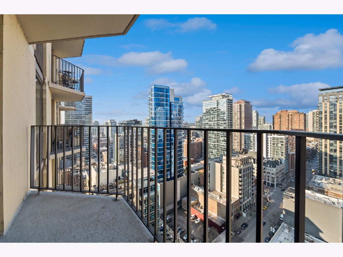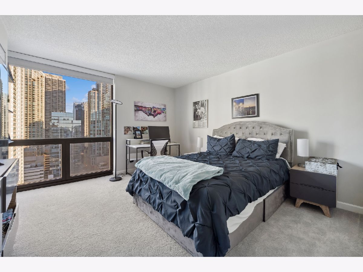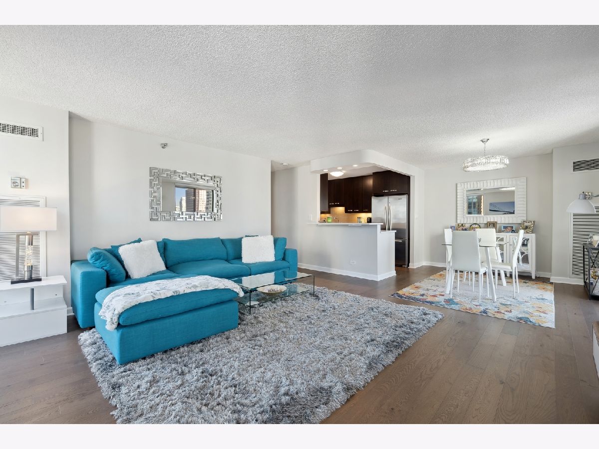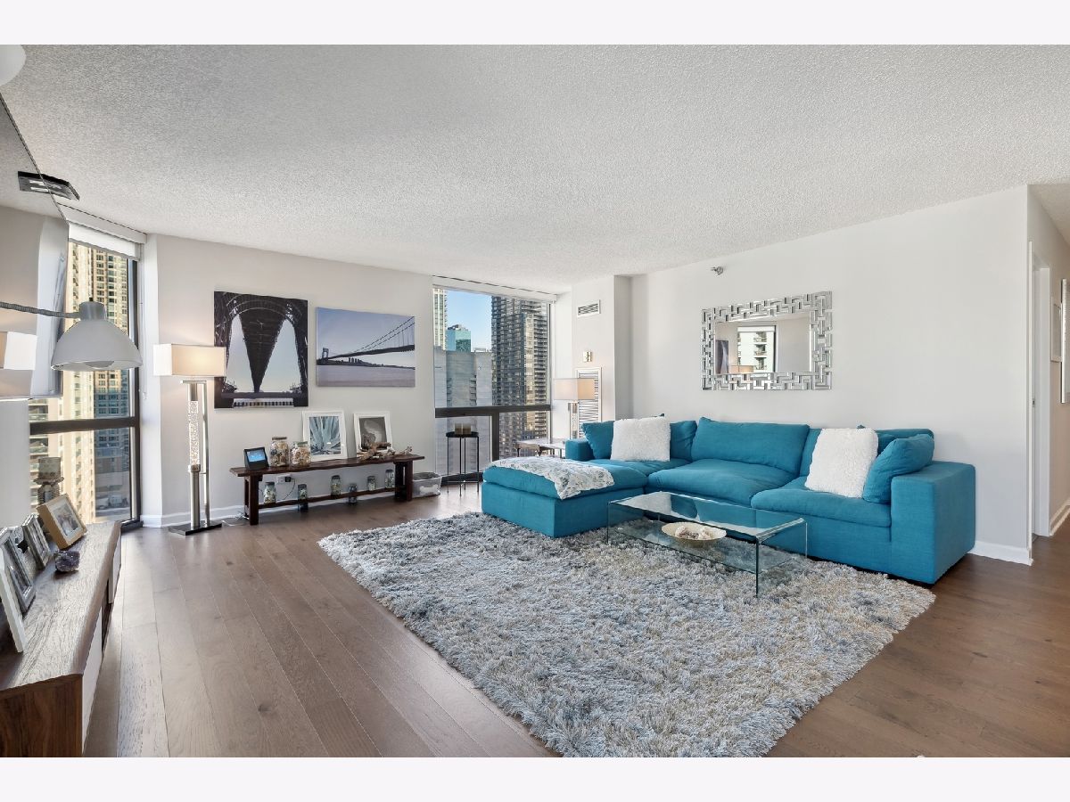 Check out this recently renovated and generously proportioned split 2BR/2BA condo on a high floor in the coveted NE corner of River North. Enjoy the expansive views through floor-to-ceiling windows and the inviting balcony, flooding the space with natural light. The unit features spacious bedrooms, including a master bedroom with a walk-in shower in the primary bathroom and a tub in the second bathroom. The open kitchen showcases new quartz countertops and Kitchen Aid stainless steel appliances, complemented by a separate dining area adjacent to the living space. Recently installed hardwood flooring throughout except for carpet in bedrooms. Generous closet space and an additional storage locker conveniently located on the second floor. The building boasts a full range of amenities, including a shared laundry room, fitness center with sauna, a large hospitality room with a full kitchen, and a spacious outdoor deck. A 24-hour door staff ensures security and convenience. Situated just one block from Whole Foods and in close proximity to Trader Joe's, restaurants, Michigan Ave, and more, this residence offers a prime location for urban living. Wifi and Cable included in HOA. A deeded parking space is available for an additional 30k.