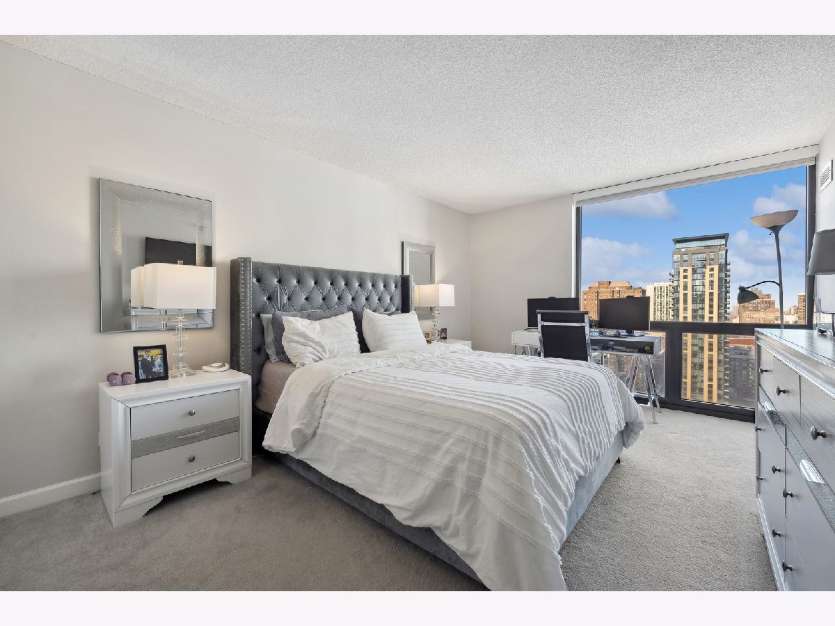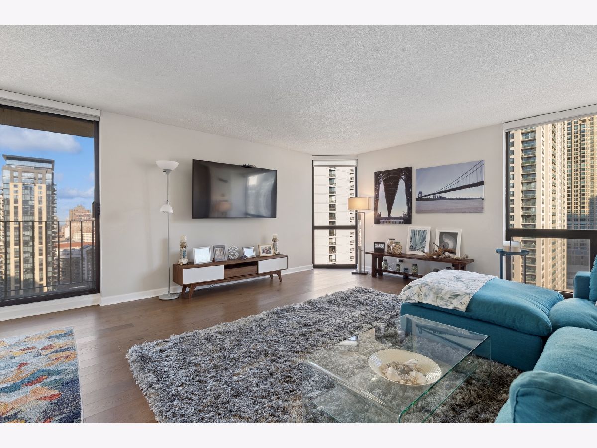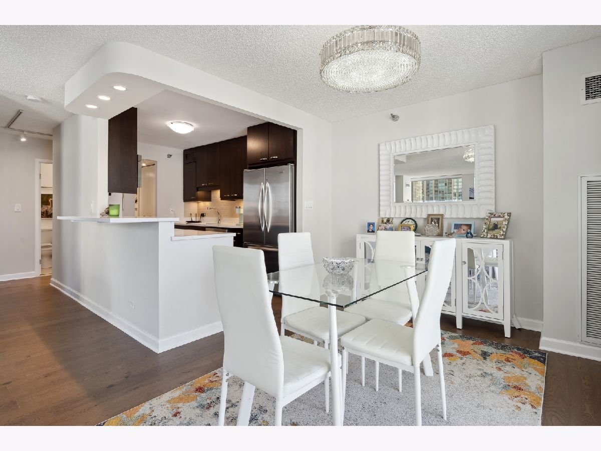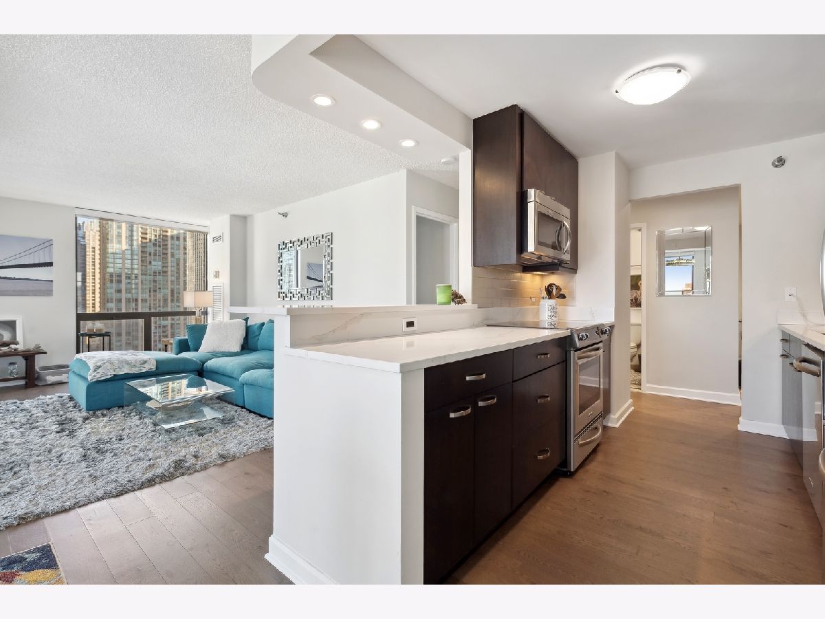 Check out this recently renovated and generously proportioned split 2BR/2BA condo on a high floor in the coveted NE corner of River North. Enjoy the expansive views through floor-to-ceiling windows and the inviting balcony, flooding the space with natural light. The unit features spacious bedrooms, including a master bedroom with a walk-in shower in the primary bathroom and a tub in the second bathroom. The open kitchen showcases new quartz countertops and Kitchen Aid stainless steel appliances, complemented by a separate dining area adjacent to the living space. Recently installed hardwood flooring throughout except for carpet in bedrooms. Generous closet space and an additional storage locker conveniently located on the second floor. The building boasts a full range of amenities, including a shared laundry room, fitness center with sauna, a large hospitality room with a full kitchen, and a spacious outdoor deck. A 24-hour door staff ensures security and convenience. Situated just one block from Whole Foods and in close proximity to Trader Joe's, restaurants, Michigan Ave, and more, this residence offers a prime location for urban living. Wifi and Cable included in HOA. A deeded parking space is available for an additional 30k.