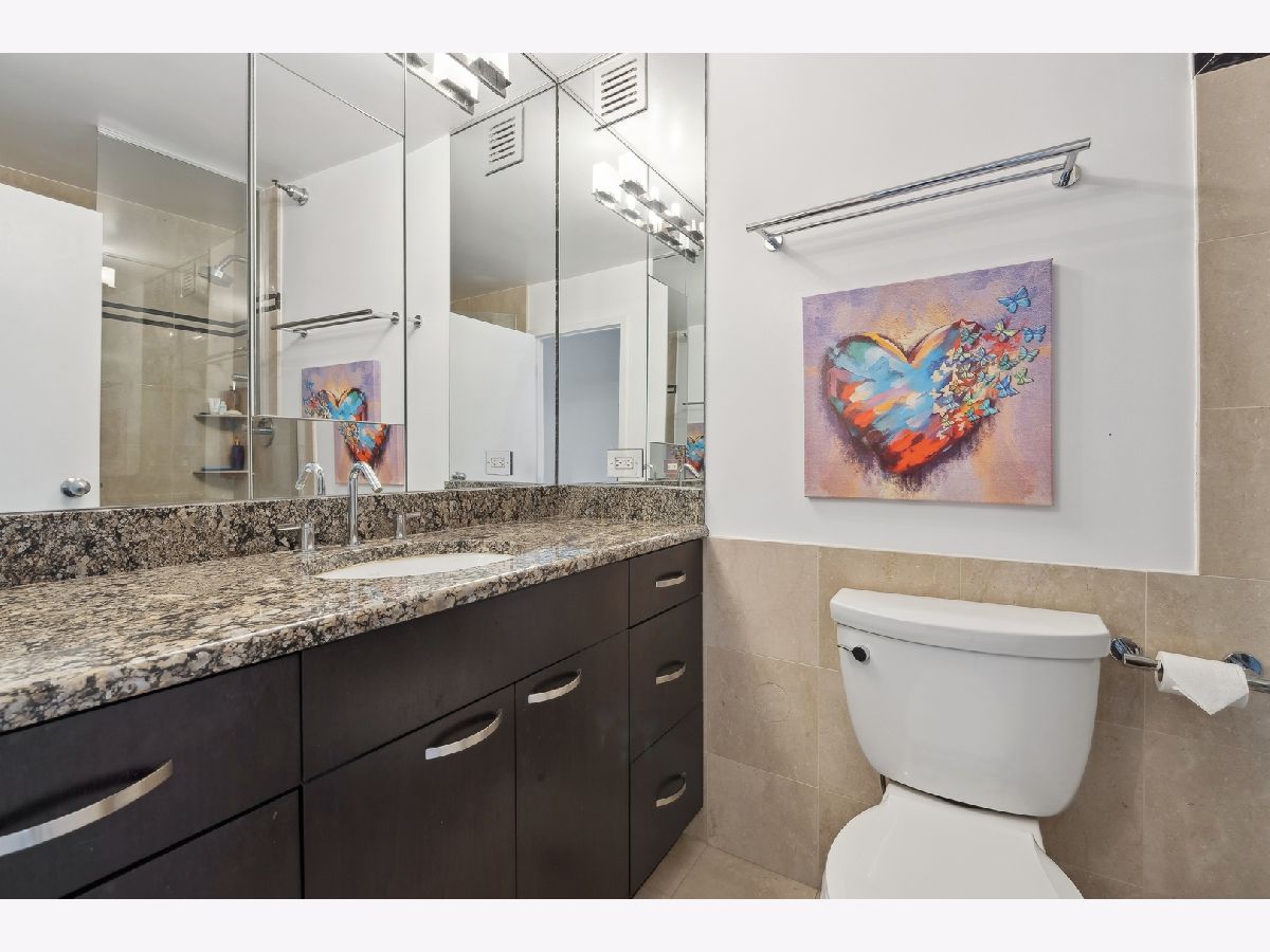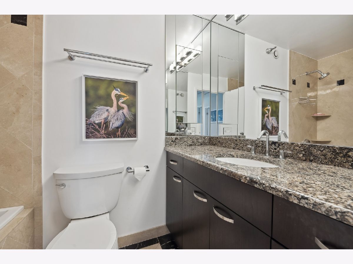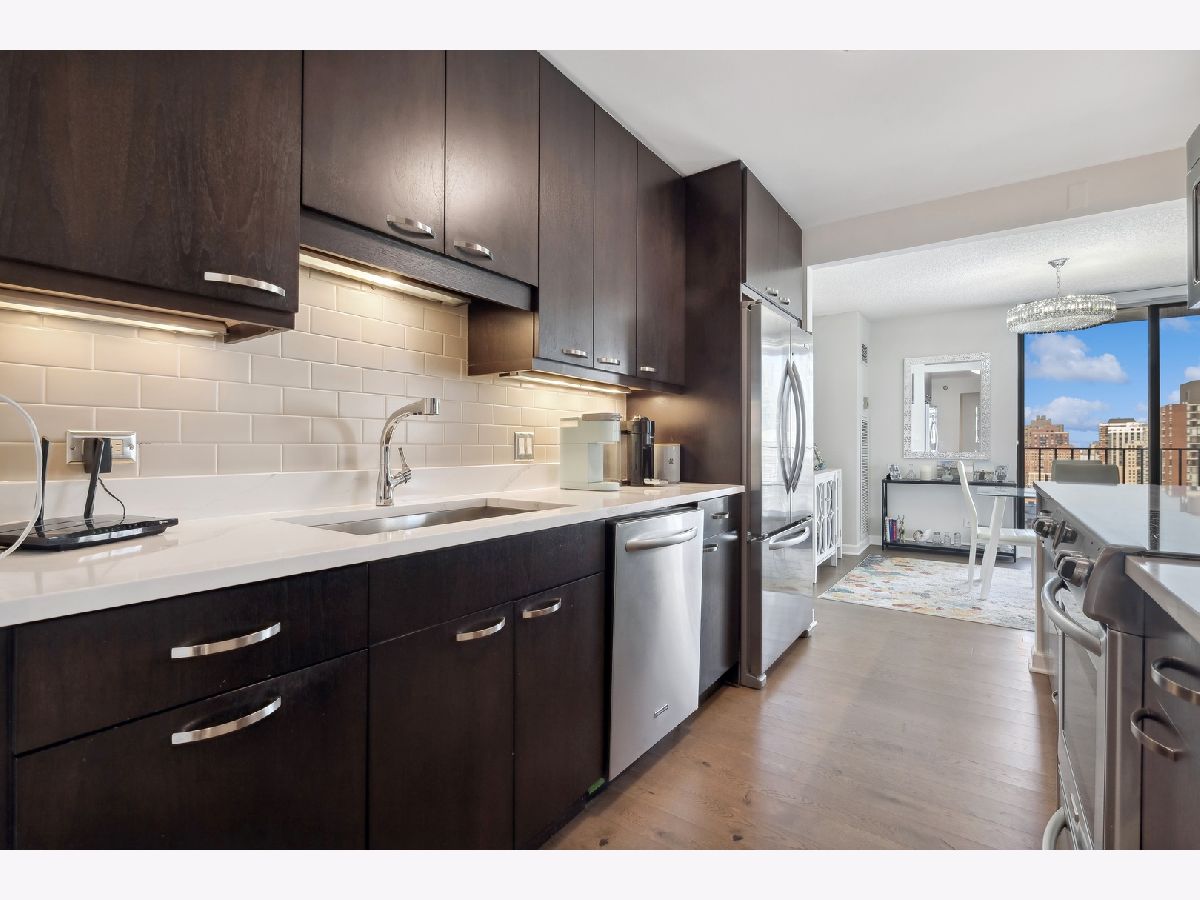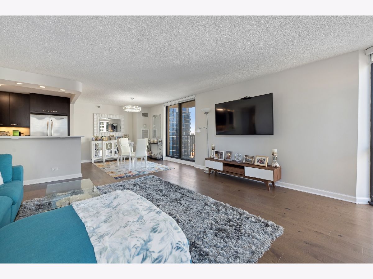 Check out this recently renovated and generously proportioned split 2BR/2BA condo on a high floor in the coveted NE corner of River North. Enjoy the expansive views through floor-to-ceiling windows and the inviting balcony, flooding the space with natural light. The unit features spacious bedrooms, including a master bedroom with a walk-in shower in the primary bathroom and a tub in the second bathroom. The open kitchen showcases new quartz countertops and Kitchen Aid stainless steel appliances, complemented by a separate dining area adjacent to the living space. Recently installed hardwood flooring throughout except for carpet in bedrooms. Generous closet space and an additional storage locker conveniently located on the second floor. The building boasts a full range of amenities, including a shared laundry room, fitness center with sauna, a large hospitality room with a full kitchen, and a spacious outdoor deck. A 24-hour door staff ensures security and convenience. Situated just one block from Whole Foods and in close proximity to Trader Joe's, restaurants, Michigan Ave, and more, this residence offers a prime location for urban living. Wifi and Cable included in HOA. A deeded parking space is available for an additional 30k.