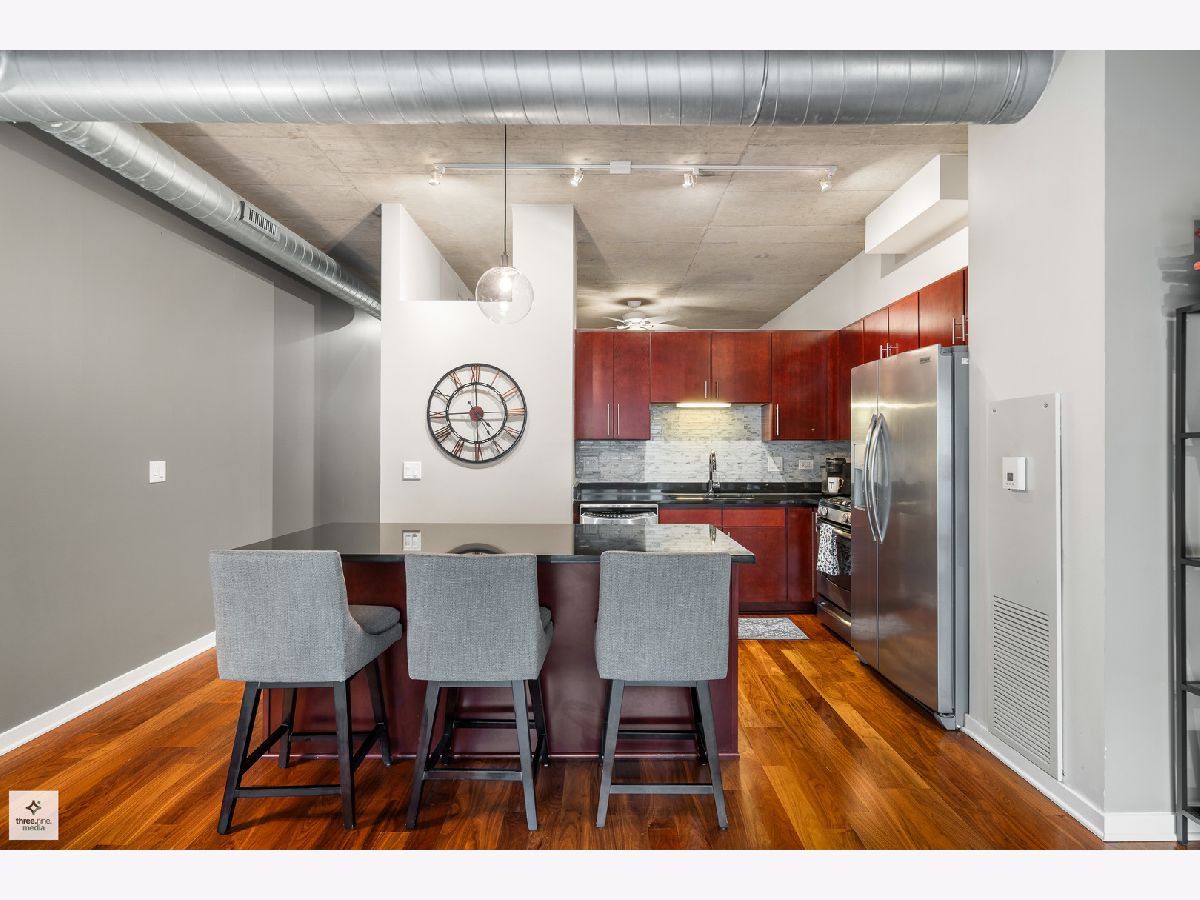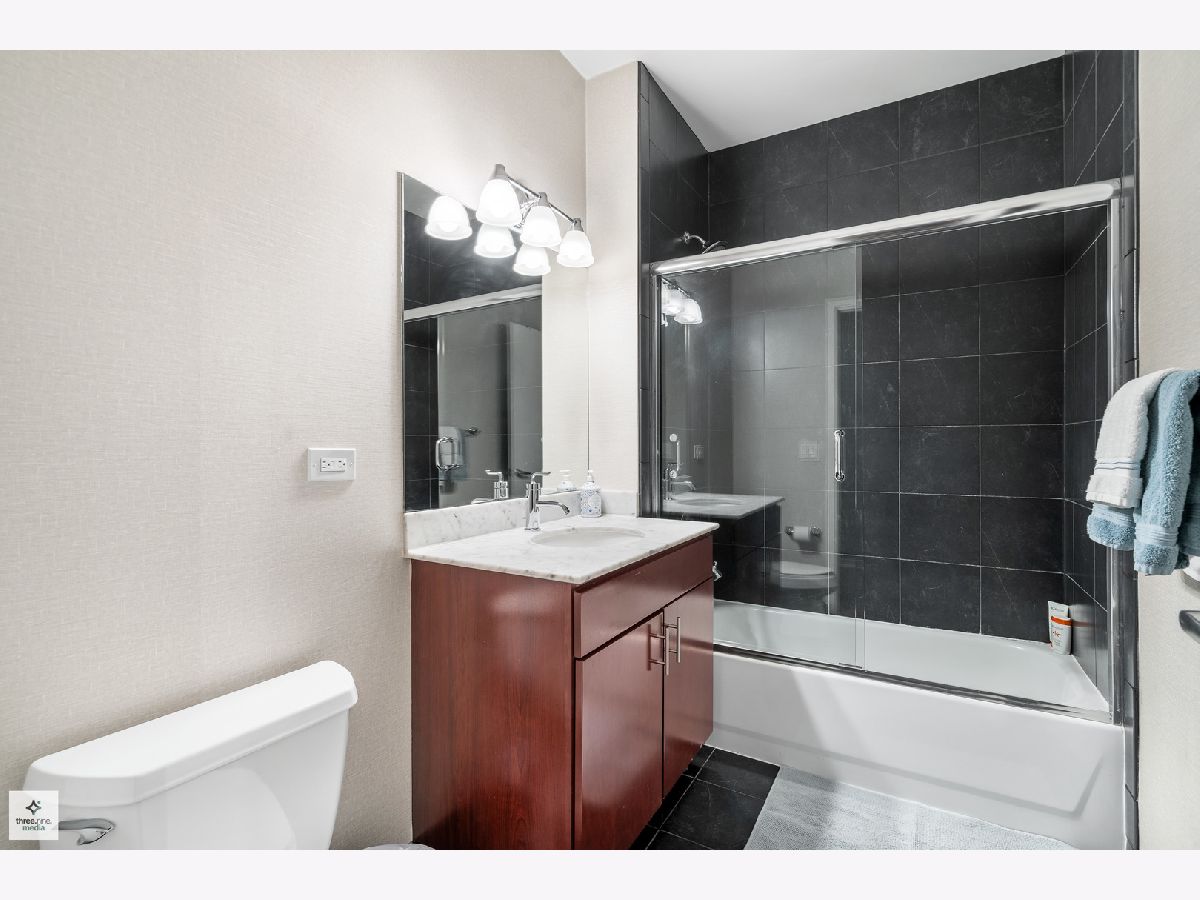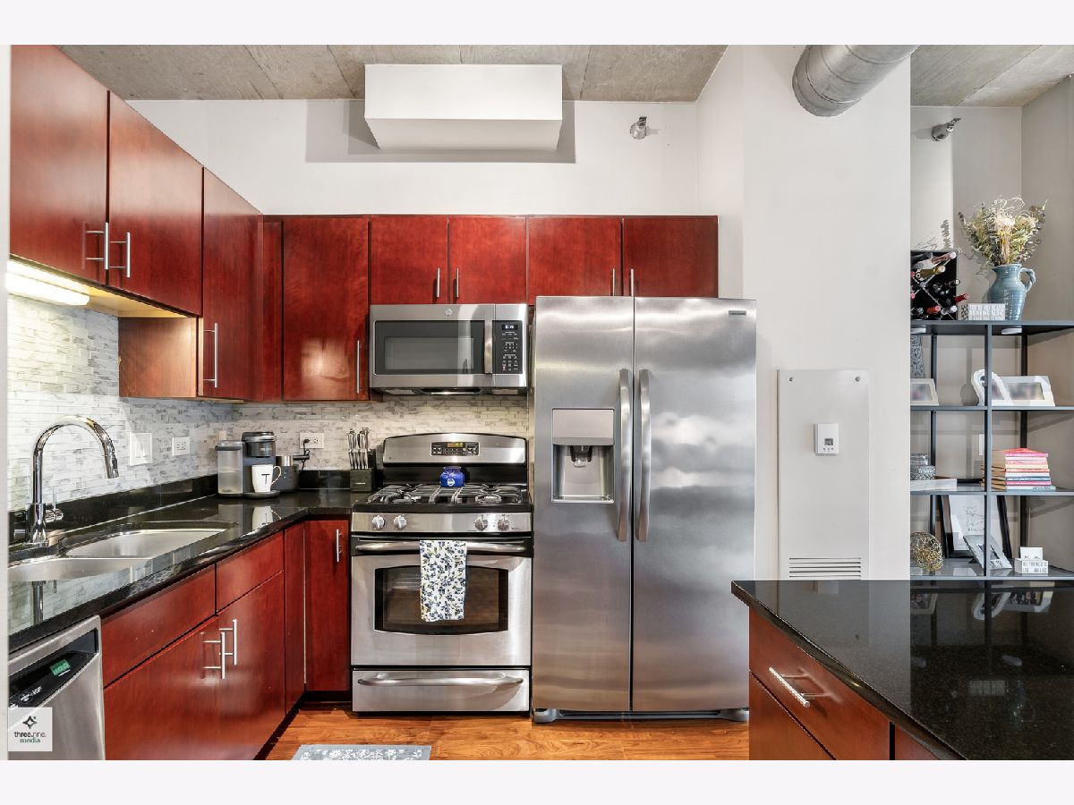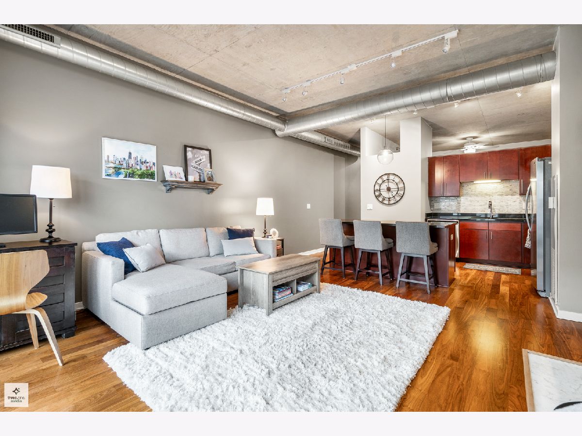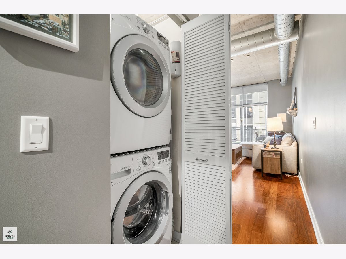 Nestled directly next to Montgomery Ward Park and the Dog Park, this North-facing gem in a highly sought-after building offers an abundance of natural light and breathtaking east and west views from an oversized balcony. Step inside to find a kitchen that's perfect for both cooking and entertaining. It boasts black granite, an oversized island with ample storage, and 36" cherry custom cabinetry. Stainless steel appliances and an in-unit washer/dryer complete the space. The living room features floor-to-ceiling windows, a glass sliding door to the balcony, and a Carrera marble fireplace-ideal for cozy nights in. The spacious bedroom is upgraded with new carpet and a custom closet to maximize storage. The sleek bathroom showcases Carrera marble countertops, black slate tile, Kohler and Moen fixtures, custom wallpaper, and stylish sconces. This dog-friendly building is just a short walk from Starbucks, the Brown Line (Chicago & Franklin), Whole Foods, the West Loop, Old Town, and everything River North has to offer. Parking & storage locker are included!