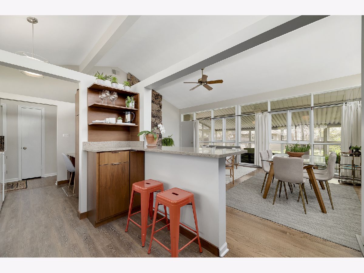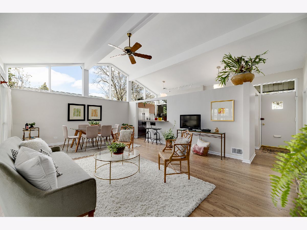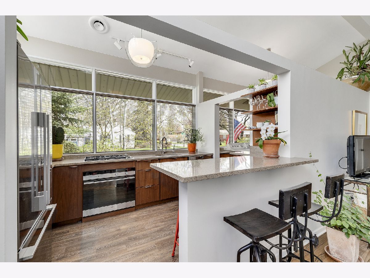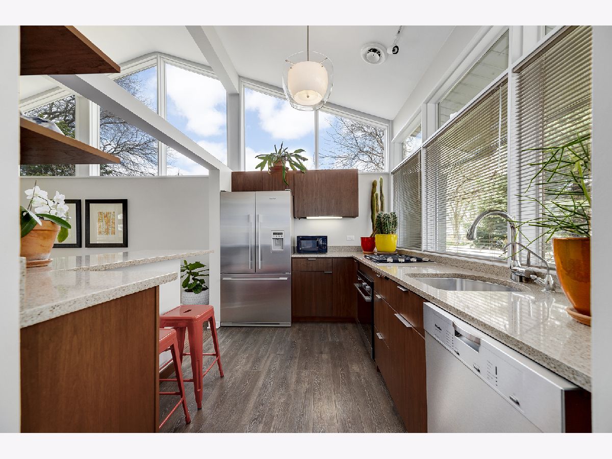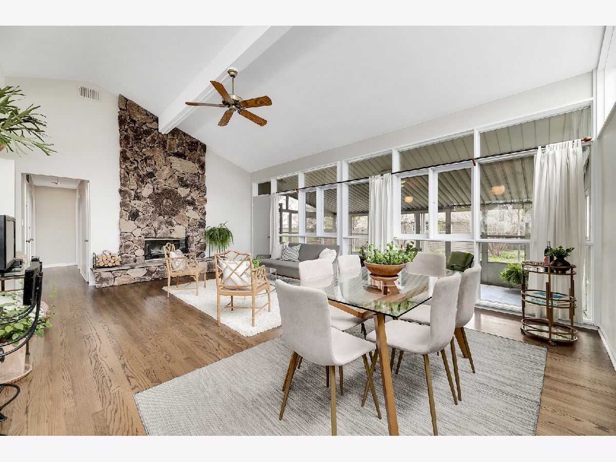 This admired Mid-Century Modern brick ranch on an over-sized corner lot is captivating! Aesthetically pleasing both inside and out, the current owners have painstakingly cared for and improved this special home. The transition of space from inside to outside disappears in the open architecture of the homes design. The incredible natural light, open space and varied ceiling height with walls of windows in some areas gives way to the perfect backdrop for showcasing artwork of all varieties. The recently renovated kitchen with contemporary cabinetry, peninsula and high-end stainless-steel appliances is a focal point of the home. The great room is anchored by a floor-to-ceiling wood-burning fireplace and this space is extended to the outdoor living space in the large enclosed porch that provides wonderful space for entertaining. The hardwood floors in the home were refinished in 2022 and two of the three bedrooms have views of the backyard. The bathrooms have been renovated, the majority of the interior of the home has been recently painted and all bedrooms have Hunter Douglas wood blinds. The earthen color palette on the exterior highlights the landscaping surrounding the home. Guests are transported to a private oasis in the fully fenced backyard with meticulously designed landscaping featuring winding flagstone and bluestone pathways, unique, mature shrubs and flowering trees including Quaking Aspen, Redbud, Serviceberry and Witchhazel plus many flowering perennials including cacti and grape vines. The detached garage can also be used as a dream workshop as its fully drywalled with air conditioning and heating. This stunning home will satisfy anyone with an appreciation for natural light, open space and nature.