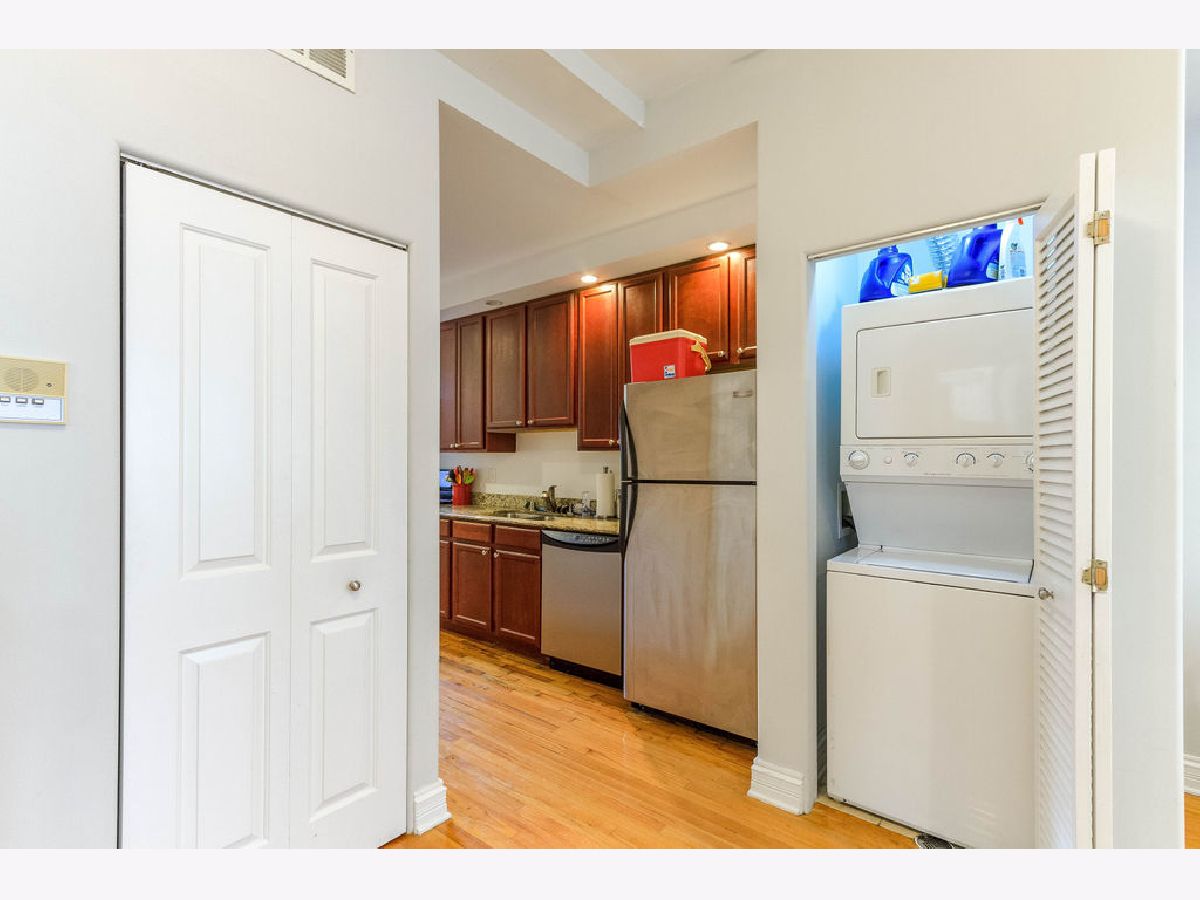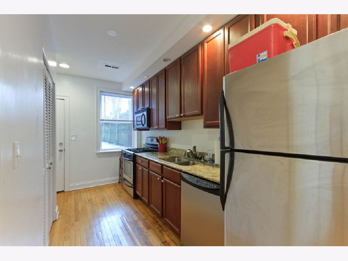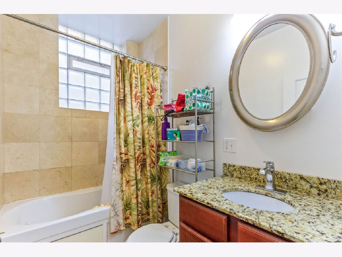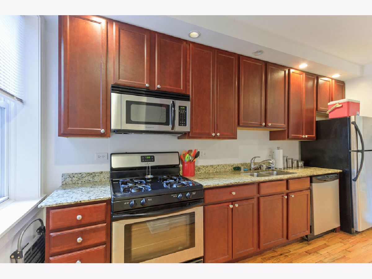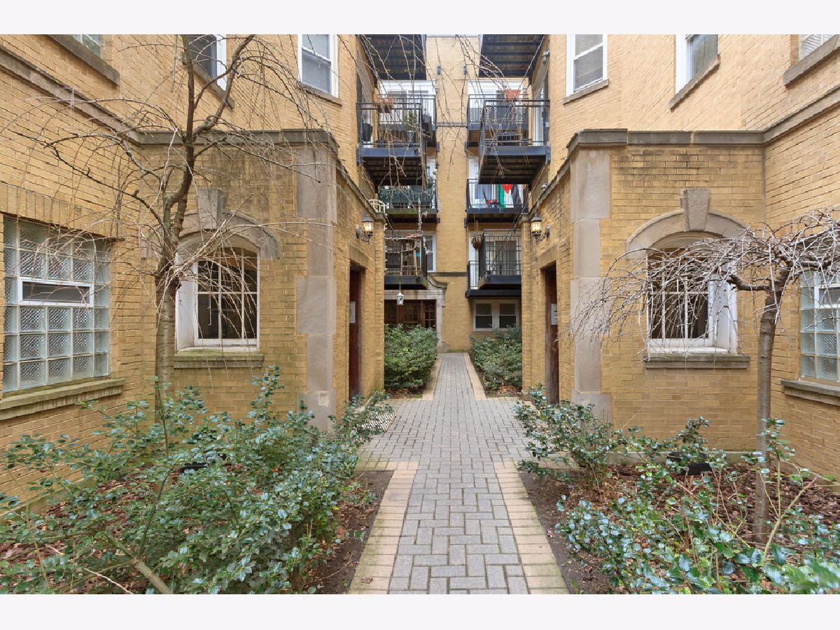This garden unit, just three steps down, boasts full-size windows that provide natural light from all four exposures. With 9-foot ceilings, it offers an open floor plan. The kitchen features 42-inch cherry cabinets, granite countertops, and stainless steel appliances. The luxurious marble bathroom includes a whirlpool tub. Conveniently located two blocks from the Metra. In unit washer and dryer. Rooms sizes are estimated. Last picture shows the floor plan.
