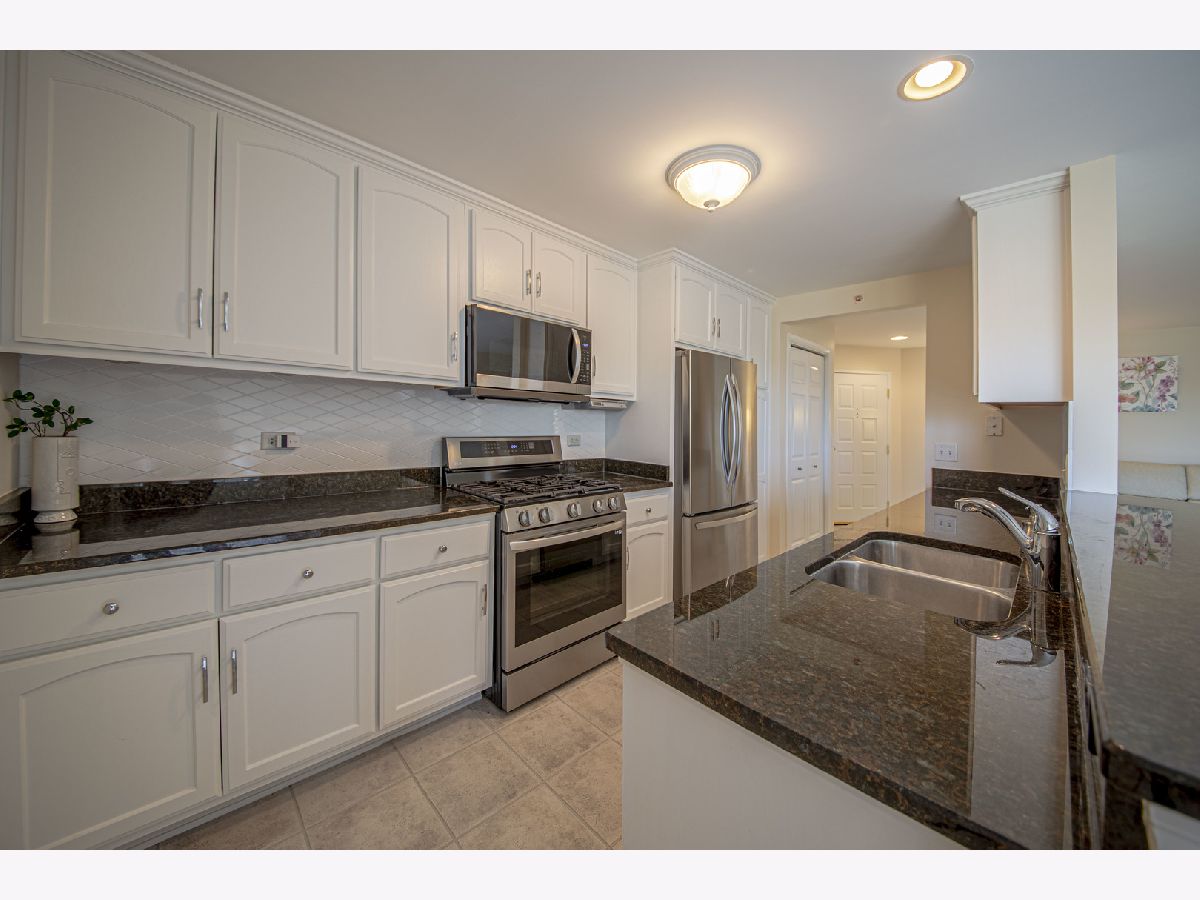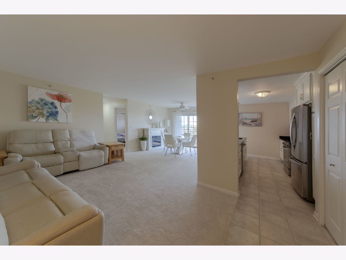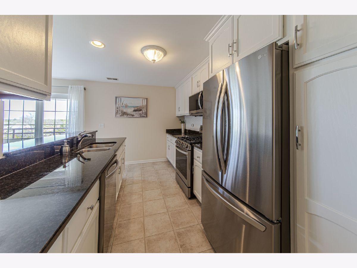 Top floor in an elevator building! Everything is fresh and updated. White cabinetry throughout, solid surface counters in most places. All new stainless appliances in the kitchen. New carpet throughout. Just beautiful, like new! Morning sun on the balcony. Great closet space! Heated two car garage with door opener is 1 wide and two deep (see pic) with a lockable storage unit.