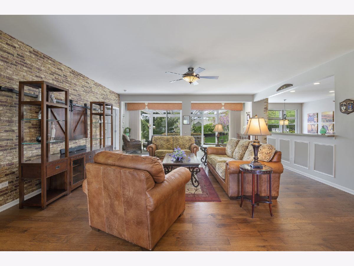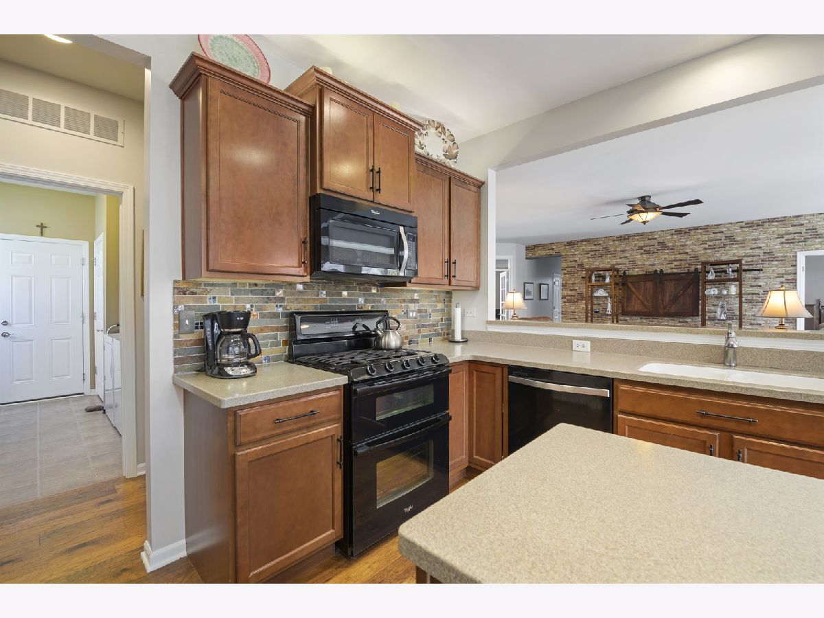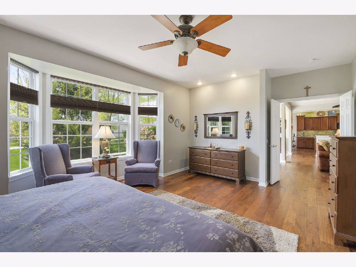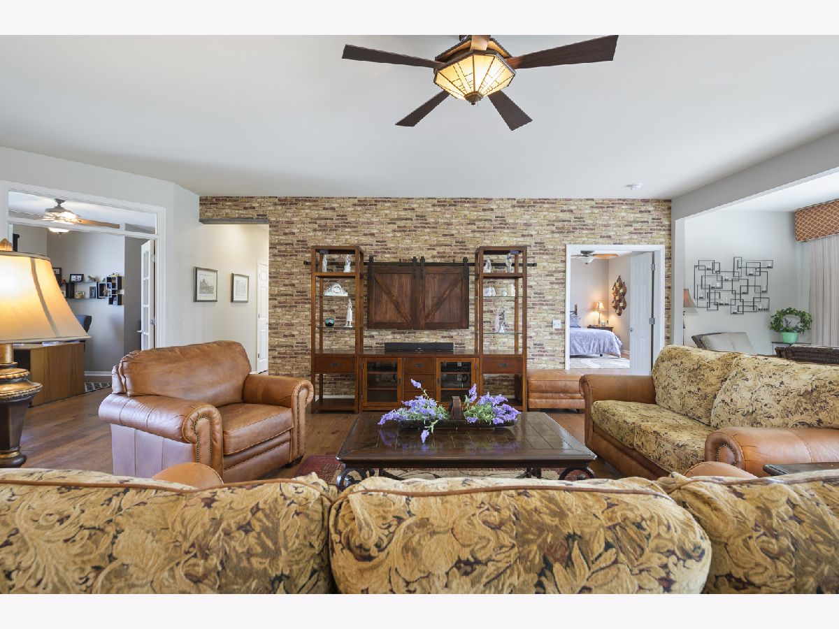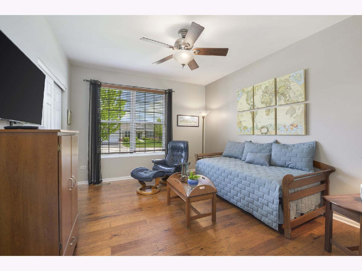 Stunning home in Shorewood Glen Del Webb! This beautiful Charleston model home has many upgrades and features! Upon entering this spectacular home you are welcomed by the Tuscany inspired great room with a panoramic view of the 12 ft wide brick paver patio with waterfall and pergola. 2 bedrooms (with option to use 2 other rooms as bedroom), 3 full bathrooms (2 of them walk-in showers), office/den with french doors, FULL FINISHED basement has 9 ft ceilings, full bathroom with a walk-in shower, popular double barn doors for separate room for privacy/bedroom, wet bar, VERY OPEN for whatever suits you. Gorgeous engineered hand scraped wood on main level except for ceramic tile in bathrooms, foyer, sunroom and laundry. The master bathroom has a custom wrap around walk in shower, heated towel bar, double sink Corian vanity, private toilet. Eat in kitchen with island, Corian tops, custom backsplash, staggered height cherry cabinets with lighting above and beneath. Garage floor has been tarp protected. Owners have taken great care of this special property.