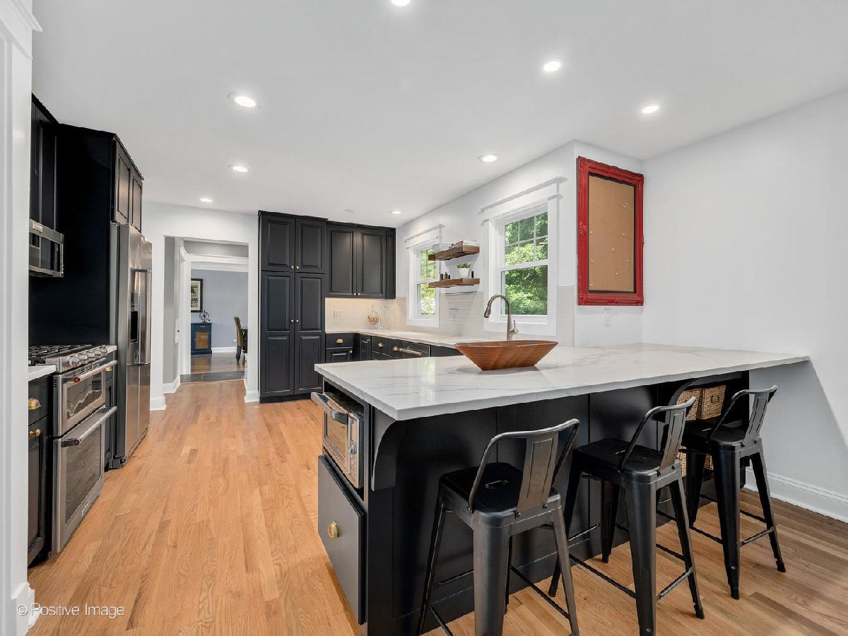 Seller will review all offers at 7pm Sunday, Aug. 7th. This home WILL BRING YOU JOY! Every part of this home has been upgraded. Exterior wrapped in maintenance-free, new, Hardie Board siding. Newly remodeled kitchen boasts sleek, black cabinetry, new quartz counters, subway tile backsplash & stainless steel appliances. Convenient breakfast bar seating overlooks cozy family room. Whimsical touches throughout the home delight...live edge bar top, custom millwork & built-in's, extensive hardwood flooring. All 3 & 1/2 baths have been completely remodeled. Private 1st floor office with custom built-in's can be converted back to a formal dining room if desired. Living Room/Dining Room combo boasts hardwood floors, new fireplace, and access to a new, oversized deck. 2nd floor boasts Primary bedroom with renovated bath, 3 additional bedrooms with renovated, full bath & abundant storage. UNBELIEVABLE WALK-OUT basement with full bath, rec room, AMAZING bar (full kitchen), family room with fireplace & generous laundry room. DEEP, lush yard has 3 outdoor living areas, sip coffee on the bricked, covered front porch, or entertain on the oversized deck & patio. Storage shed provides additional room for mower & lawn equipment. If this isn't enough home for you, expansion is a breeze, build out over the garage. Featuring new roof (2019) and furnace (2019), this home is truly MOVE-IN READY! Highly coveted Ben Franklin Elementary School. Steps to vibrant downtown, restaurants, boutiques, commuter train & nostalgic movie theater.