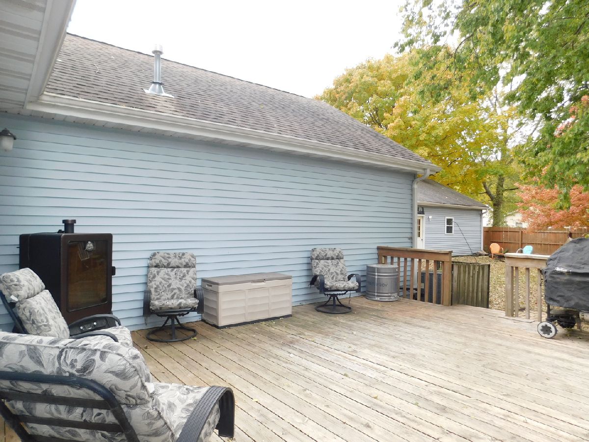 QUAINT RANCH HOME, NEWLY PAINTED IN TODAY'S LIGHT GRAY COLOR SCHEME WITH SOLID WOOD DOORS AND WOOD CASEMENT WINDOWS! Front yard babbling creek, covered front porch, 9' ceiling and open floorplan welcome you. Living Room is open to the kitchen featuring a breakfast bar, crown molding on oak cabinetry, pullout drawers with direct access to the outside wrap-around decking! Master Suite boasts vaulted ceiling with ceiling light fan, desk cubby with wall mirror and walk-in closet! Bedrooms have double wide closets. 12'x7' full bath presents 5' vanity, linen closet and white decorative wall cabinet. First level laundry with washer and dryer are a bonus. 2-car garage comes equipped with an electric heater! Asphalt driveway, fenced-in backyard and huge deck are additional features of the exterior. HURD wood casement windows and Agreeable Gray newly painted interior add warmth and charm to this home. Pull down attic stairs and window blinds complete this Sycamore treasure!