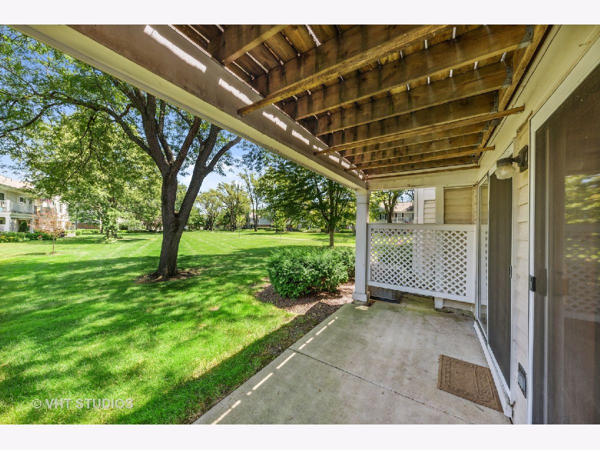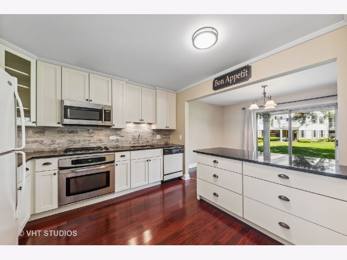 Highly sought after first floor unit in the coveted Rob Roy community. This updated two bedroom, two full bath model has everything complete and ready to move in. You will certainly enjoy all the natural light that shines through the wide sliding glass doors that lead to a large patio overlooking relaxing green courtyard space. This dream kitchen features 42" custom cabinetry, a stone tiled backsplash, under cabinet lighting, additional eat-in island breakfast bar with storage space (6 drawers) and granite countertops. Both bathrooms were beautifully rehabbed with new marble top vanities, toilets and porcelain neutral toned modern tile. There is hardwood flooring throughout both bedrooms and main living areas along with TV wall mounts already installed and ready to go. Tons of natural light in the bedrooms with the windows. Primary bedroom features an expansive walk in closet. In unit full sized washer and dryer with extra storage space. Nest thermostat. Engulf yourself in the Rob Roy lifestyle... golf, tennis, pools, clubhouse, monthly activities, walking trails, landscaping, and snow removal. Close to all major shopping. Welcome home!