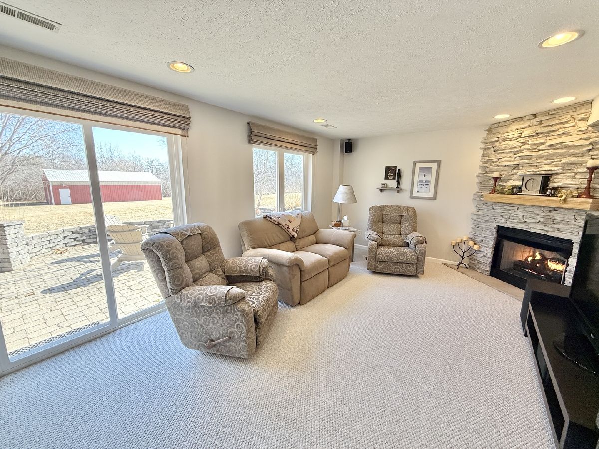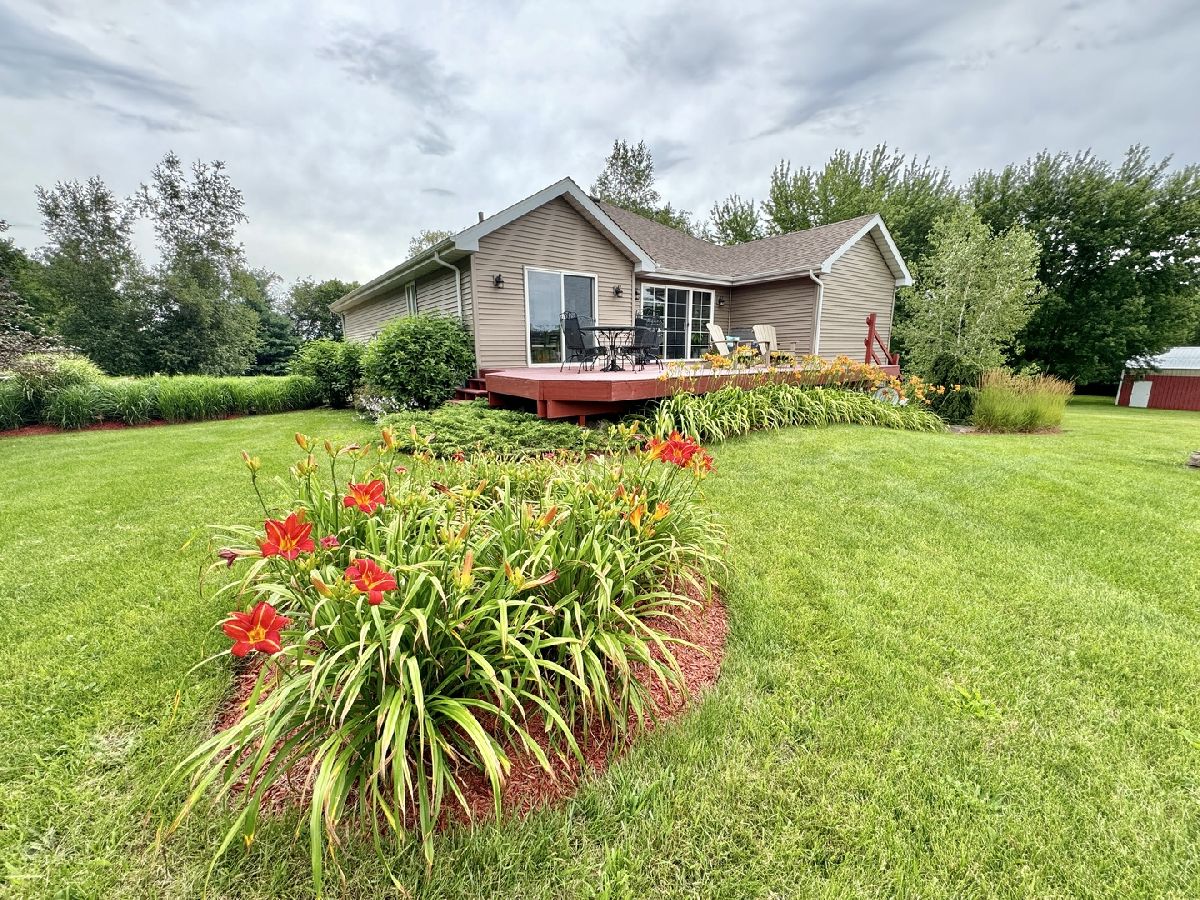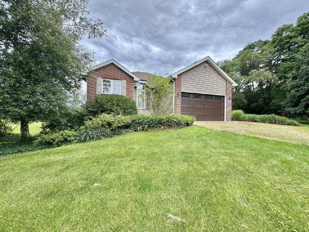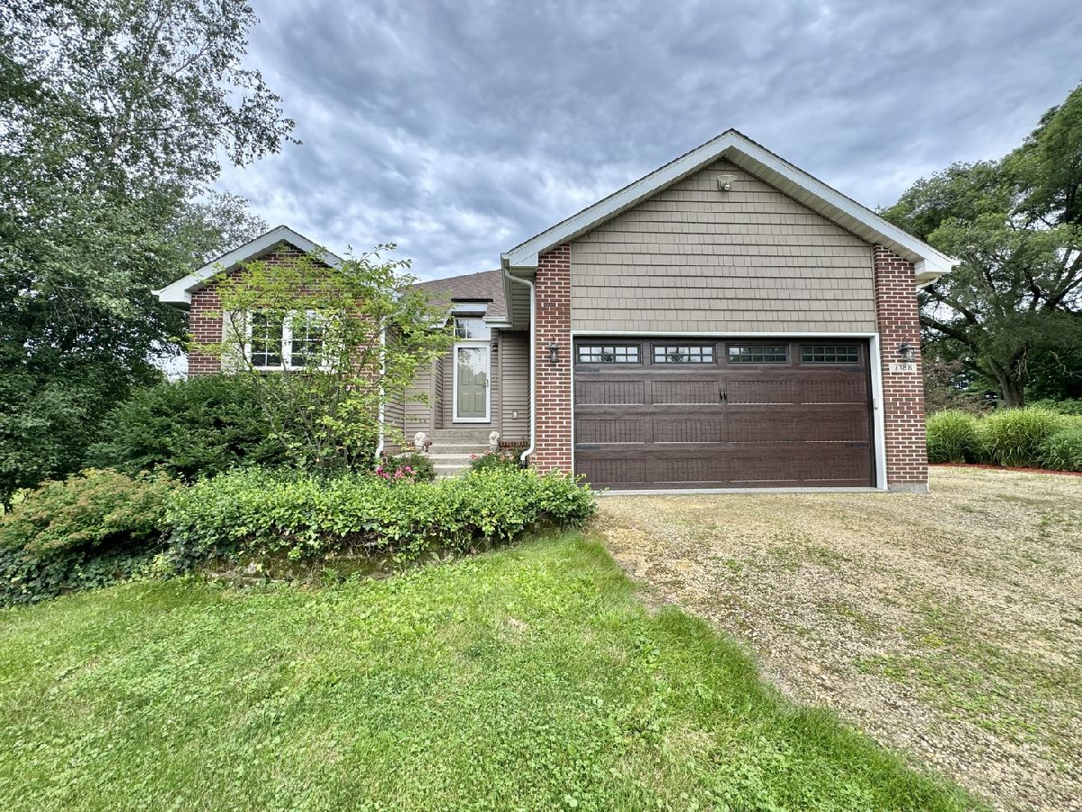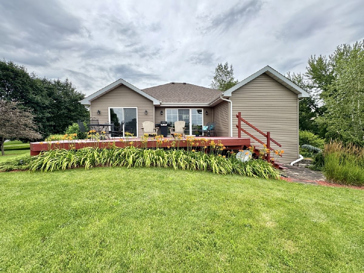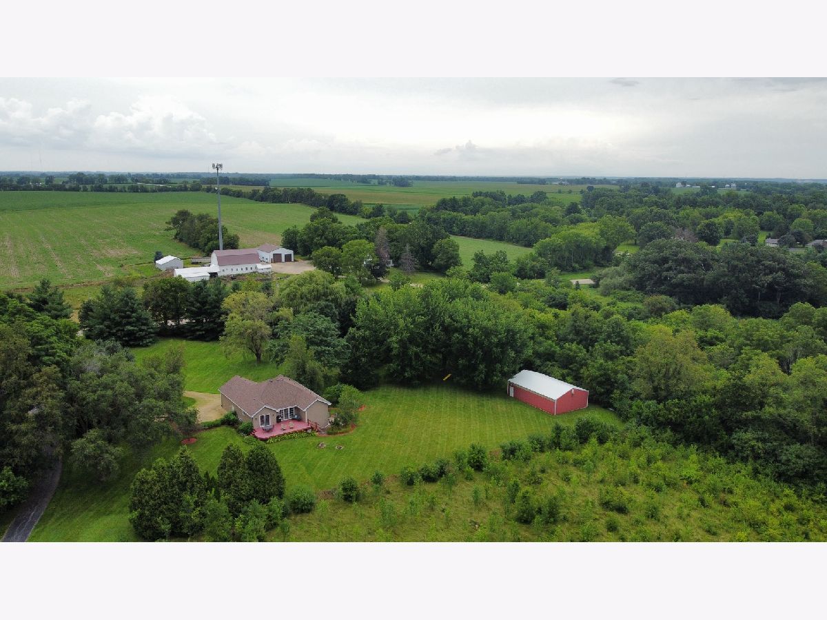 Escape to peaceful country living in this beautiful one-owner 4- bedroom, 3-bath ranch home set on 8 picturesque acres. A winding creek with a natural spring & mature trees creates a serene backdrop for this inviting property. Upon entering the tiled foyer, you are greeted with a bright & airy floor plan showcasing a slice of nature through the oversized windows/sliding door in the living room with white-washed hardwood flooring & a vaulted ceiling. Large eat-in kitchen with white cabinetry, granite countertops, breakfast bar, SS appliances, tile backsplash, a walk-in pantry & sliders out to the 27' x 16' deck with new top boards. 2 bedrooms on the main floor + a bonus room with French doors that could be an office, formal dining or 3rd bedroom. Primary bedroom with vaulted ceiling, walk-in closet private bathroom with Jacuzzi tub, separate shower, vanity with Quartz top & skylight to let in lots of natural light. The fully exposed lower level with 9' ft ceiling boasts 2 bedrooms, a game area with wet bar, full bath with Quartz top & a family room with a stacked stone gas fireplace with patio doors that lead out to a brick paver patio, perfect for entertaining or relaxing. 2.5 car garage with insulated finished drywall, epoxy flooring and even an 8' ft garage door to fit your oversized vehicles. Outside you have a 30' x 45' outbuilding with electricity providing ample space for storage, hobbies, or a workshop. Roof on house & building, siding, gutters, insulated garage door new in 2021, furnace with April Aire 2020, AC 2021, 50-gallon water heater 2016, water softener 2020. Portion of the property has AG zoning for your animals, low county taxes, Winnebago school district within minutes to the highway for easy access to local amenities.