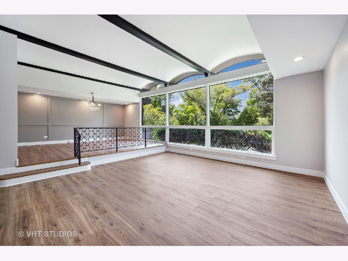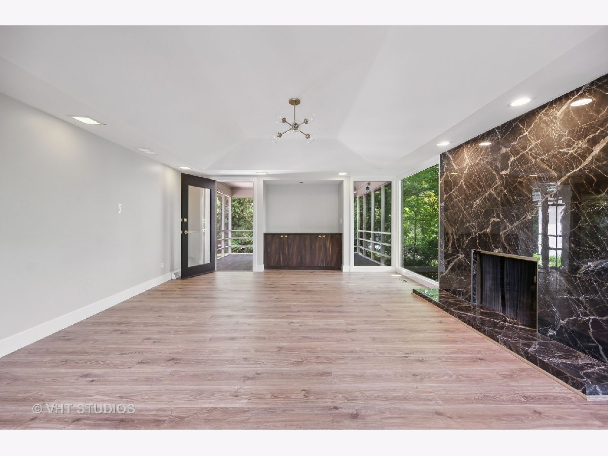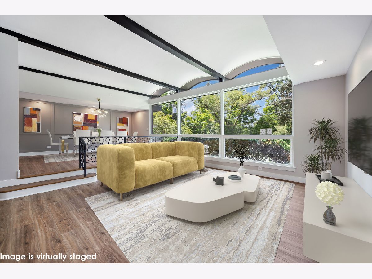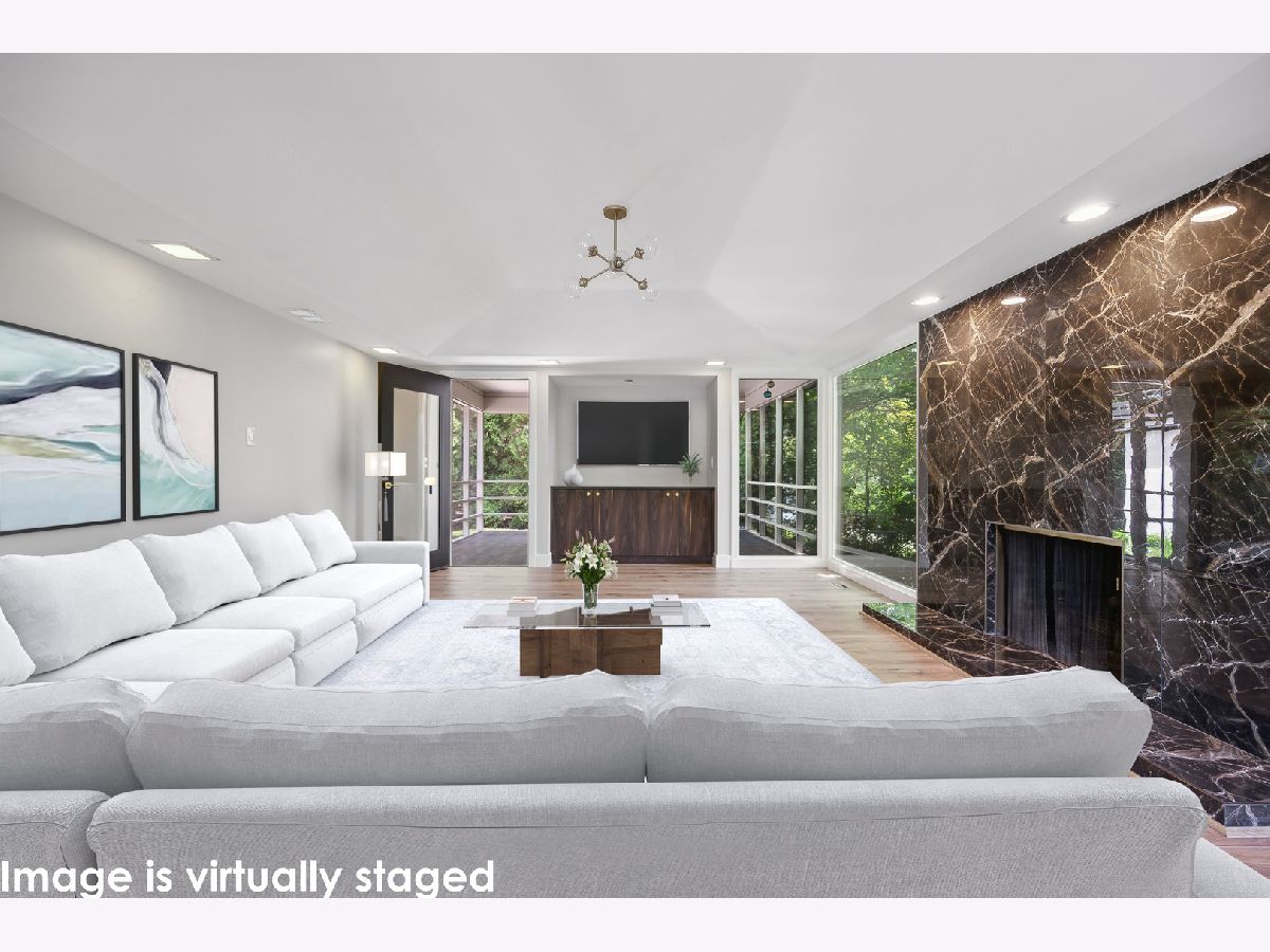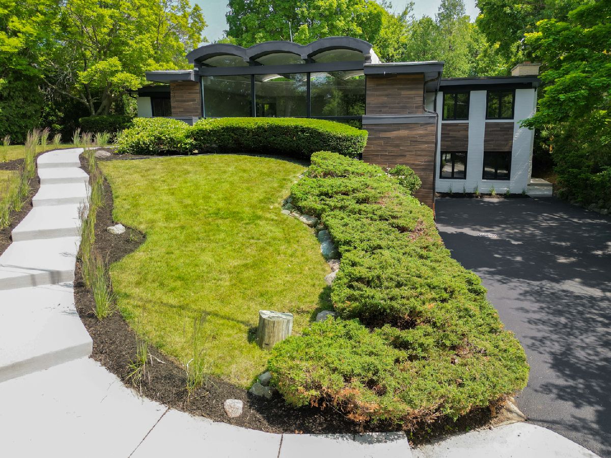This stunning mid-century modern home is nestled on a picturesque residential street in Highland Park. Perfectly positioned near downtown Ravinia and the festival ground, this magnificent home spans 5,200 square feet, including five bedrooms, four and a half bathrooms, and an oversized two-car garage. The formal living room and raised dining room is bathed in lots of natural light pouring through its magnificent floor-to-ceiling windows. The stylish chefs kitchen, with beautiful walnut finish cabinets, accented by gold hardware is equipped with brand new stainless steel KitchenAid appliances. For a completely different vibe, relax in the family room, where a wood-burning fireplace creates a cozy atmosphere and the large windows overlooking the yard make you feel like you're amongst the trees outside. From here, step in to the screened three-season room, offering warm summer breezes and serene views of the mature backyard. The luxurious primary bedroom suite, features an incredible bathroom equipped with a freestanding tub, double vanity, and an expansive shower. The grandeur continues with a spacious master dressing room. The remainder of the main floor offers two additional bedrooms, a bathroom, laundry facilities, and a powder room. The versatile lower level presents an ensuite guest bedroom, 1 more bedroom and bathroom, an office, a workout room, and an incredible recreation room complete with a dry bar and wine fridge. Outside, a generous patio extends from the three-season room, creating an ideal setting for summer gatherings. Updates include a brand new 2-zone HVAC system, a new water heater, updated electric, plumbing and recent roof replacement. Don't miss this exceptional opportunity to own a contemporary mid-century modern masterpiece in the coveted neighborhood of Highland Park.