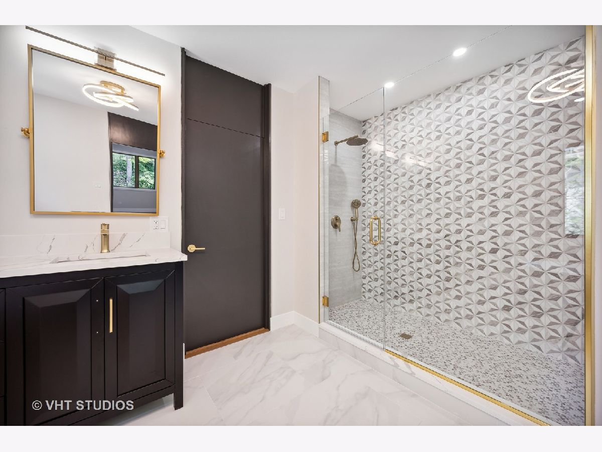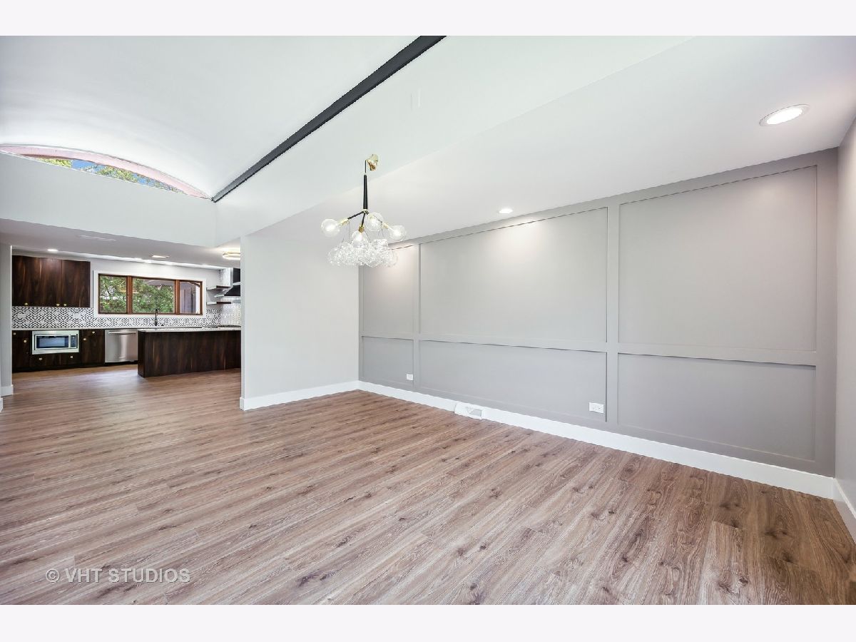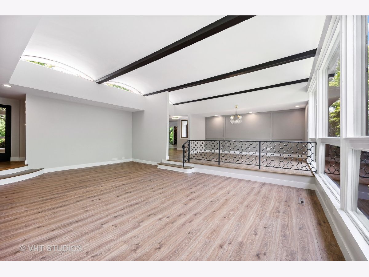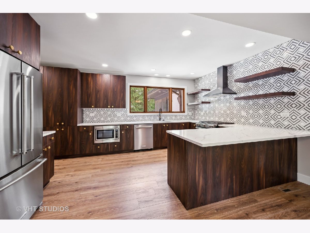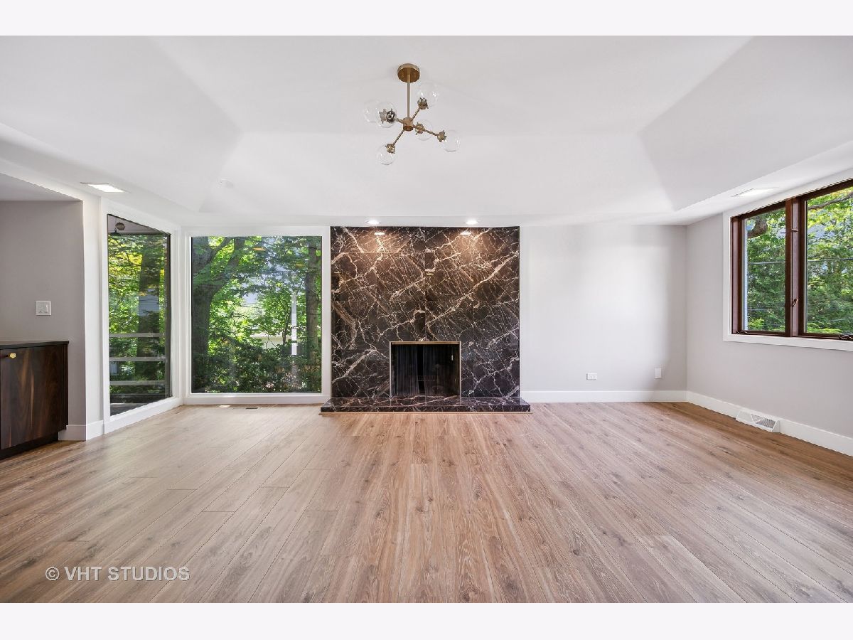 This stunning mid-century modern home is nestled on a picturesque residential street in Highland Park. Perfectly positioned near downtown Ravinia and the festival ground, this magnificent home spans 5,200 square feet, including five bedrooms, four and a half bathrooms, and an oversized two-car garage. The formal living room and raised dining room is bathed in lots of natural light pouring through its magnificent floor-to-ceiling windows. The stylish chefs kitchen, with beautiful walnut finish cabinets, accented by gold hardware is equipped with brand new stainless steel KitchenAid appliances. For a completely different vibe, relax in the family room, where a wood-burning fireplace creates a cozy atmosphere and the large windows overlooking the yard make you feel like you're amongst the trees outside. From here, step in to the screened three-season room, offering warm summer breezes and serene views of the mature backyard. The luxurious primary bedroom suite, features an incredible bathroom equipped with a freestanding tub, double vanity, and an expansive shower. The grandeur continues with a spacious master dressing room. The remainder of the main floor offers two additional bedrooms, a bathroom, laundry facilities, and a powder room. The versatile lower level presents an ensuite guest bedroom, 1 more bedroom and bathroom, an office, a workout room, and an incredible recreation room complete with a dry bar and wine fridge. Outside, a generous patio extends from the three-season room, creating an ideal setting for summer gatherings. Updates include a brand new 2-zone HVAC system, a new water heater, updated electric, plumbing and recent roof replacement. Don't miss this exceptional opportunity to own a contemporary mid-century modern masterpiece in the coveted neighborhood of Highland Park.