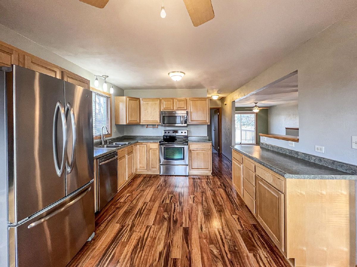 Sharp Bi-Level with 4 Bedrooms, 2 Bathrooms and a Large Stall Attached Garage. Features Include: Surveillance with Private Monitoring, Heat with Central Air, Gutter Guards, Remodeled Kitchen (Peninsula, Pantry & Appliances Included) and Bathrooms, Laundry Room with Storage, Concrete Driveway, Replacement Windows in 2019, 16 x 20 Deck, Patio and Play set.