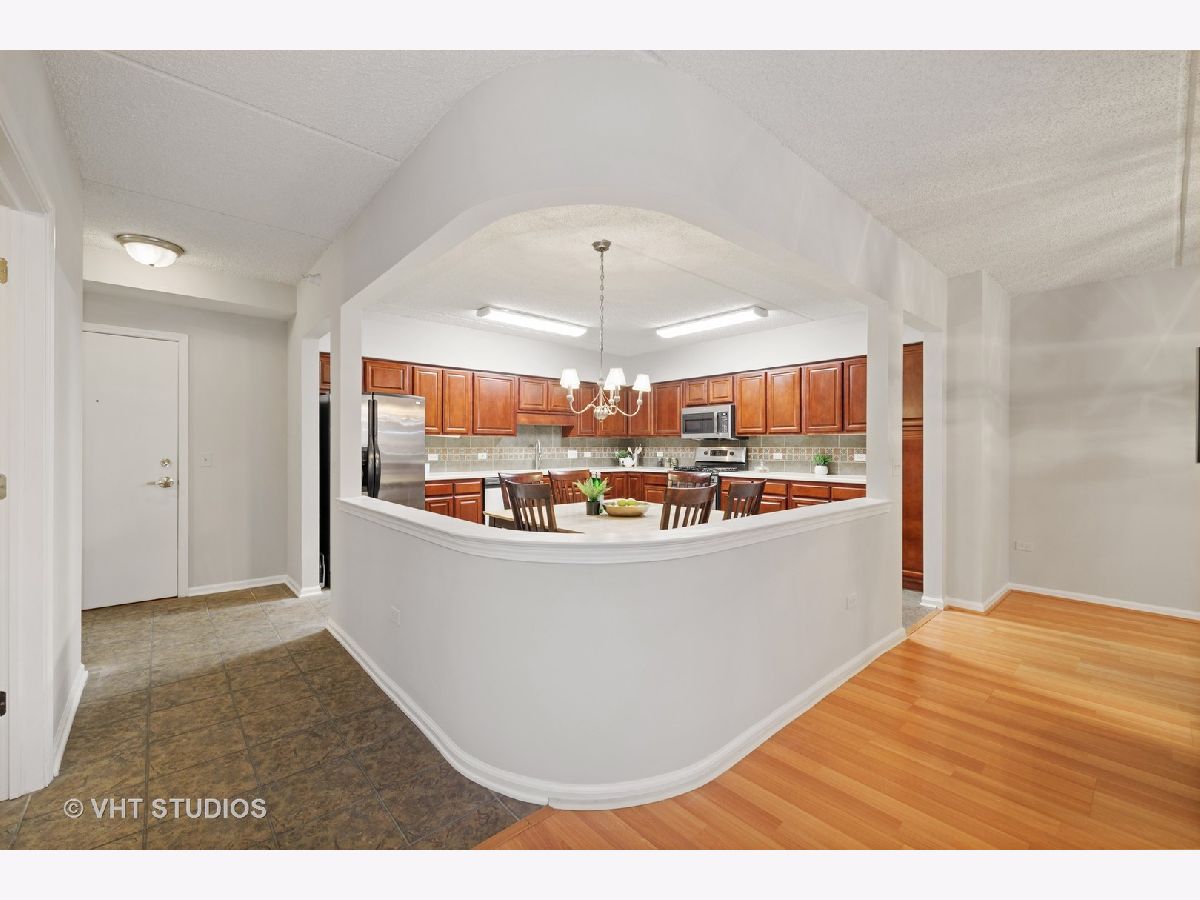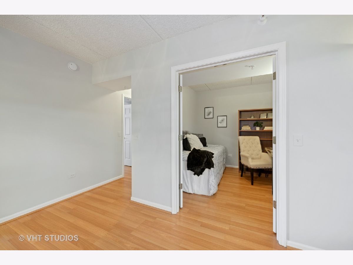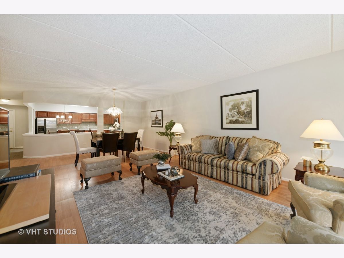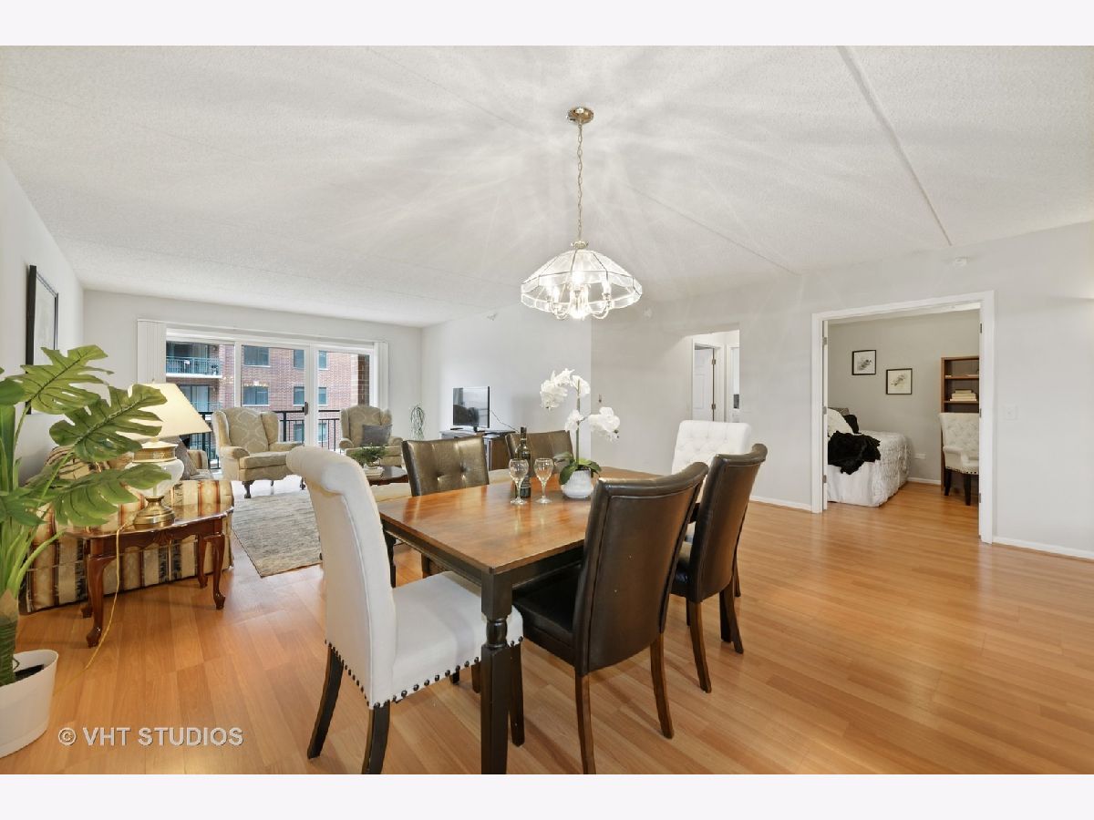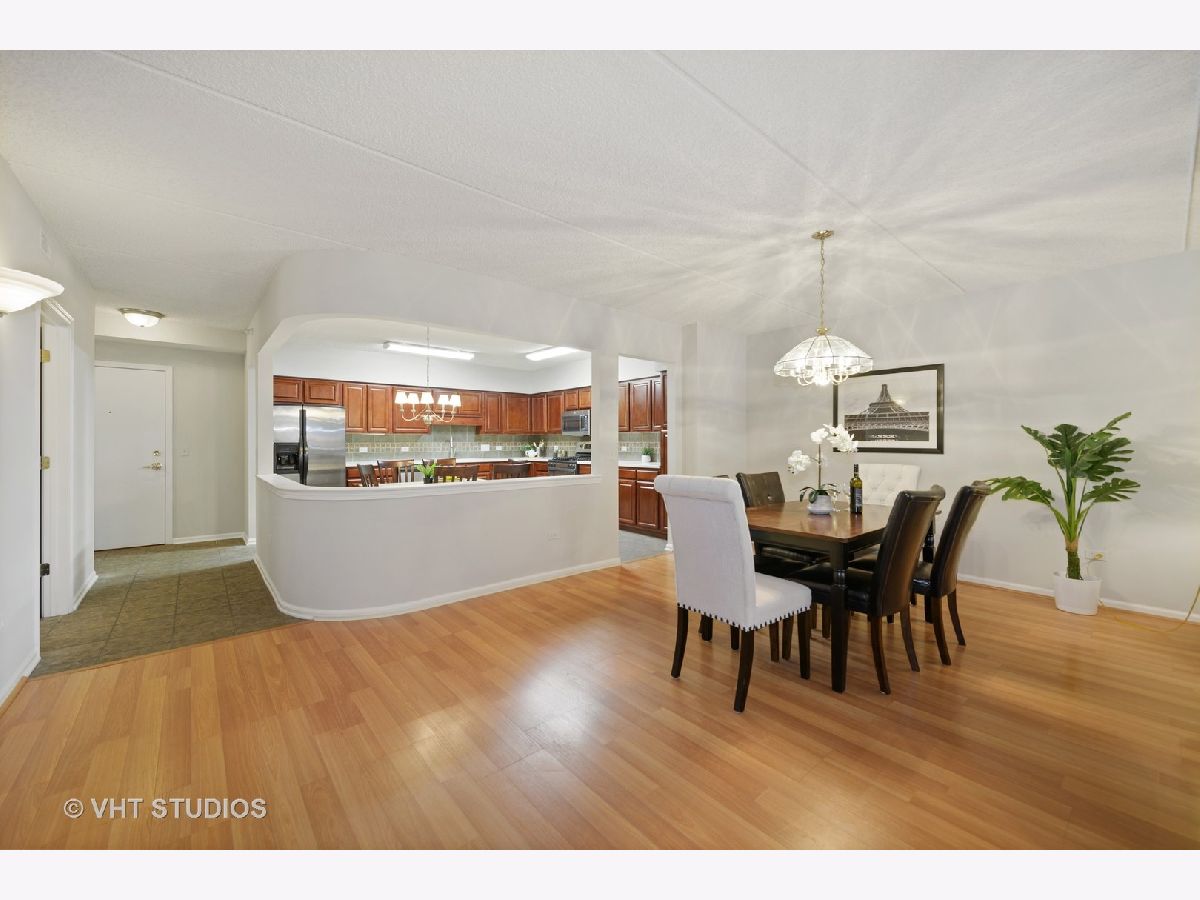 Beautiful bright & large condo at Library Courte in the heart of Des Plaines! This immense 2-bedroom + den/2-bath features an updated Cherry kitchen w/ stainless-steel appliances, Corian counters, and a large eat-in big enough for a dining table. Huge living & dining spaces that leads to a large covered balcony that overlooks the courtyard. Light laminate floors throughout & Freshly painted with neutral colors. A very large master suite and spacious spa-like master bath feature a separate walk-in shower and jetted tub. Large separate laundry room and plenty of storage too! 2 car (tandem) heated parking space with a very large storage room in front of the parking spots. 1 block to the Metra line to downtown Chicago, Pace bus and easy access to highway and minutes to Rosemont CTA and O'Hare. Walk to all the downtown area restaurants, shopping and more!! **Heat included in monthly assessments**