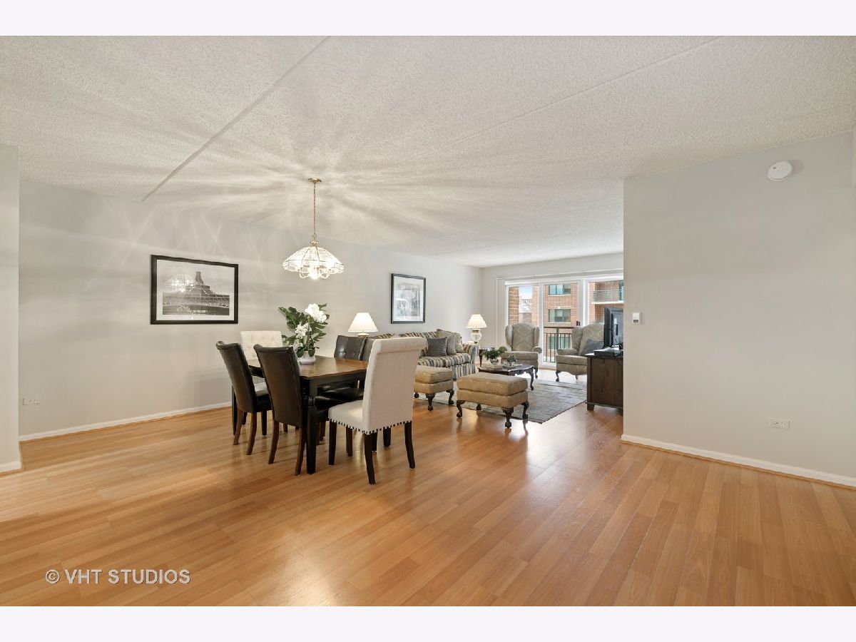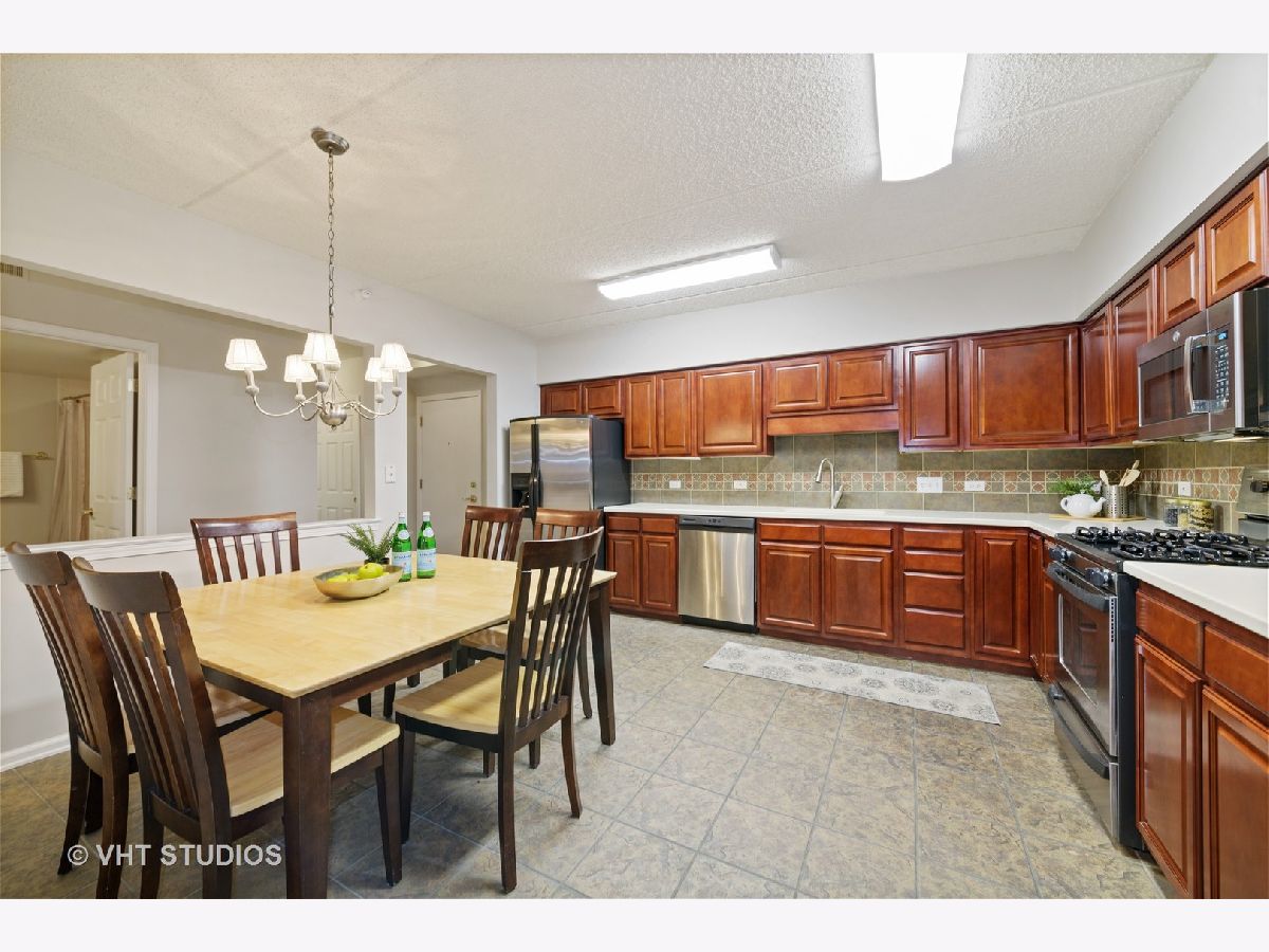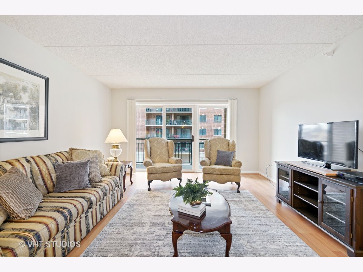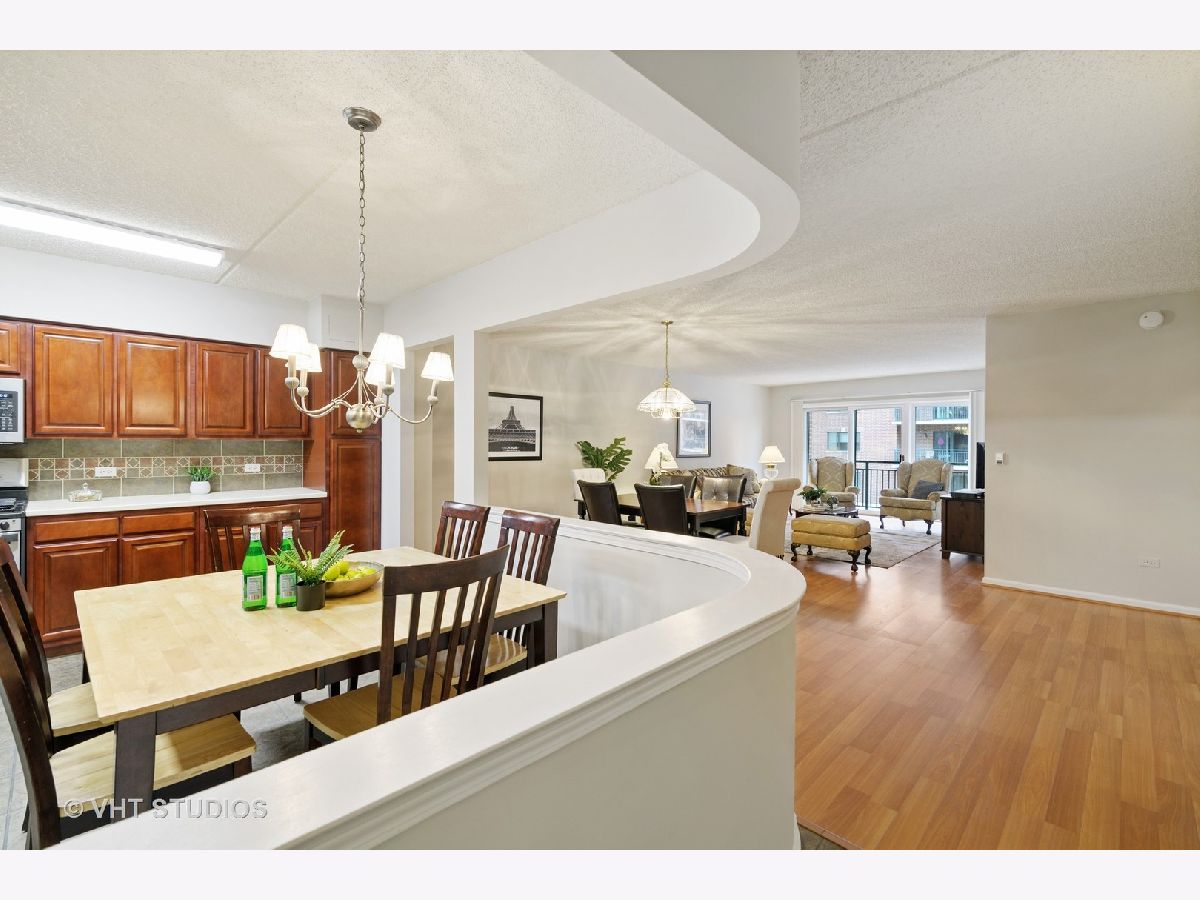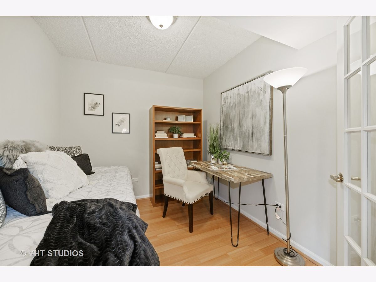 Beautiful bright & large condo at Library Courte in the heart of Des Plaines! This immense 2-bedroom + den/2-bath features an updated Cherry kitchen w/ stainless-steel appliances, Corian counters, and a large eat-in big enough for a dining table. Huge living & dining spaces that leads to a large covered balcony that overlooks the courtyard. Light laminate floors throughout & Freshly painted with neutral colors. A very large master suite and spacious spa-like master bath feature a separate walk-in shower and jetted tub. Large separate laundry room and plenty of storage too! 2 car (tandem) heated parking space with a very large storage room in front of the parking spots. 1 block to the Metra line to downtown Chicago, Pace bus and easy access to highway and minutes to Rosemont CTA and O'Hare. Walk to all the downtown area restaurants, shopping and more!! **Heat included in monthly assessments**