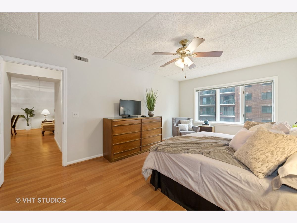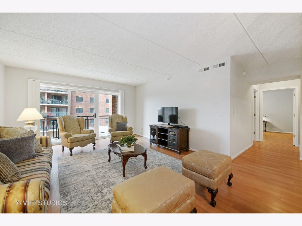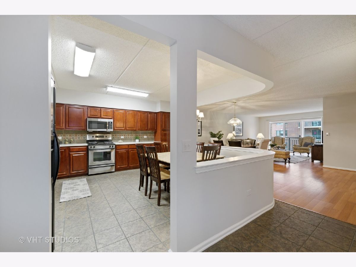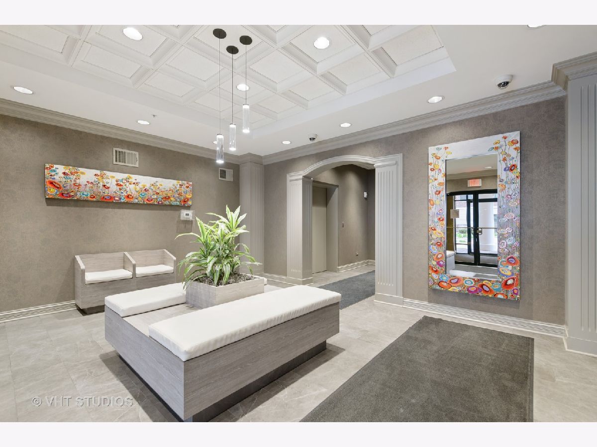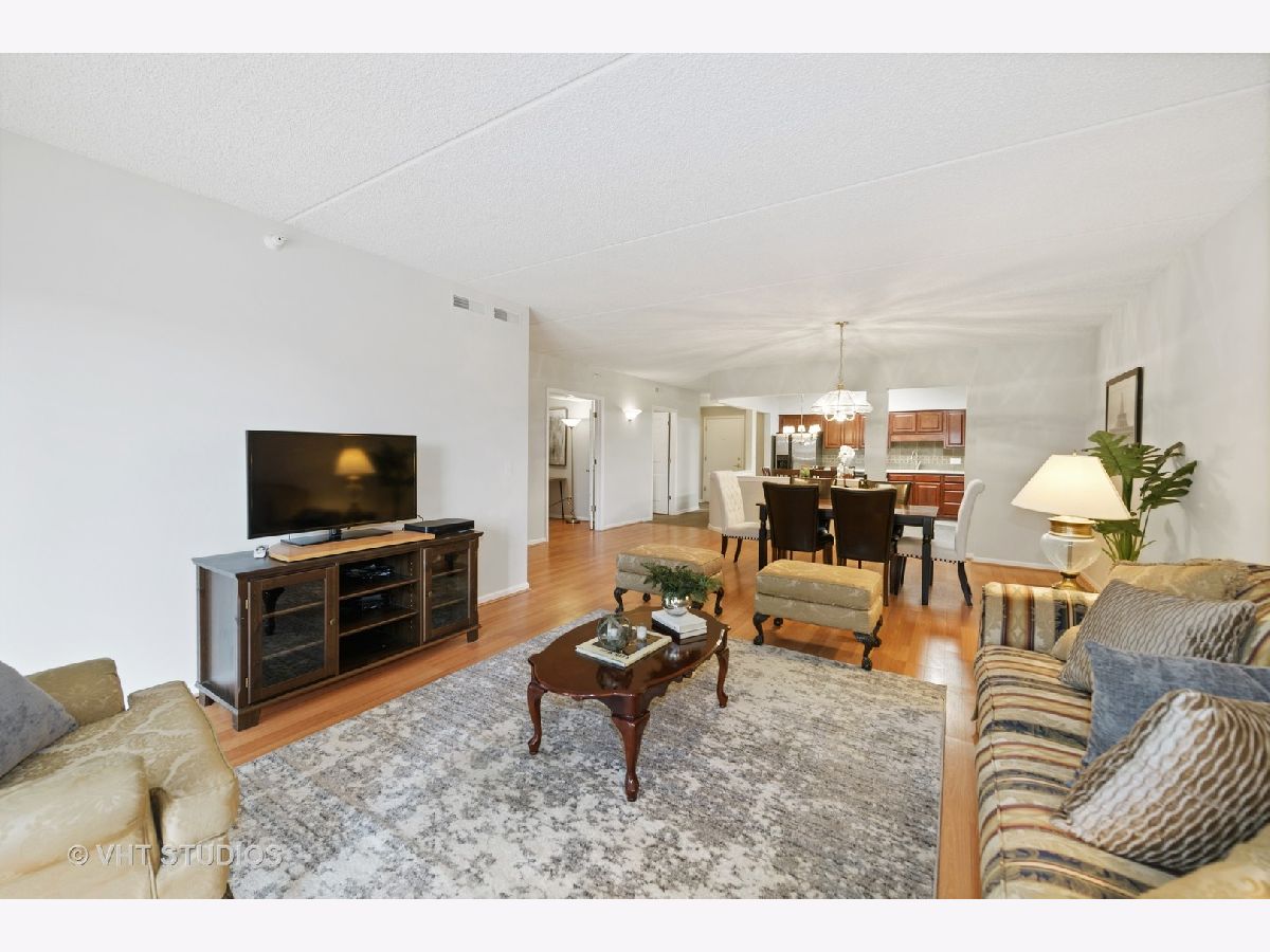 Beautiful bright & large condo at Library Courte in the heart of Des Plaines! This immense 2-bedroom + den/2-bath features an updated Cherry kitchen w/ stainless-steel appliances, Corian counters, and a large eat-in big enough for a dining table. Huge living & dining spaces that leads to a large covered balcony that overlooks the courtyard. Light laminate floors throughout & Freshly painted with neutral colors. A very large master suite and spacious spa-like master bath feature a separate walk-in shower and jetted tub. Large separate laundry room and plenty of storage too! 2 car (tandem) heated parking space with a very large storage room in front of the parking spots. 1 block to the Metra line to downtown Chicago, Pace bus and easy access to highway and minutes to Rosemont CTA and O'Hare. Walk to all the downtown area restaurants, shopping and more!! **Heat included in monthly assessments**
