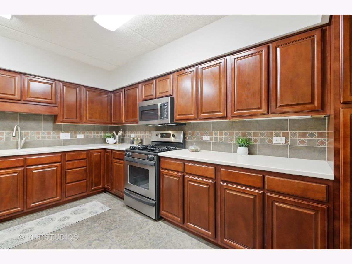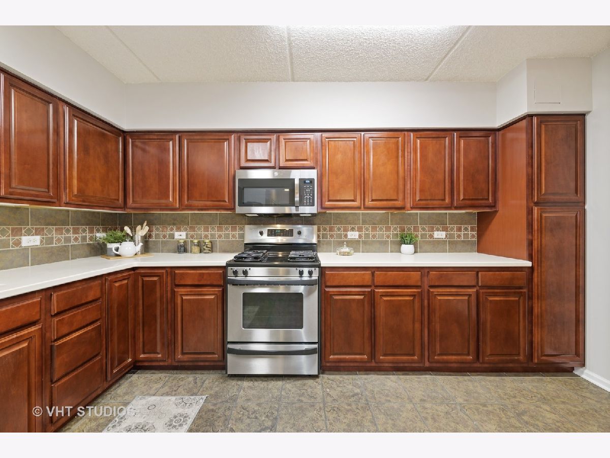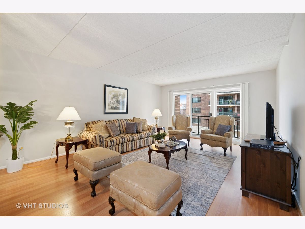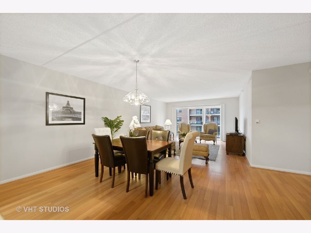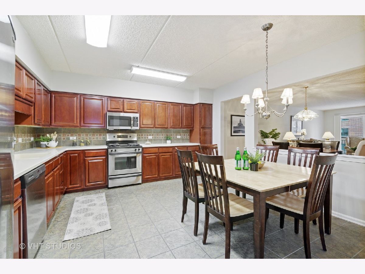 Beautiful bright & large condo at Library Courte in the heart of Des Plaines! This immense 2-bedroom + den/2-bath features an updated Cherry kitchen w/ stainless-steel appliances, Corian counters, and a large eat-in big enough for a dining table. Huge living & dining spaces that leads to a large covered balcony that overlooks the courtyard. Light laminate floors throughout & Freshly painted with neutral colors. A very large master suite and spacious spa-like master bath feature a separate walk-in shower and jetted tub. Large separate laundry room and plenty of storage too! 2 car (tandem) heated parking space with a very large storage room in front of the parking spots. 1 block to the Metra line to downtown Chicago, Pace bus and easy access to highway and minutes to Rosemont CTA and O'Hare. Walk to all the downtown area restaurants, shopping and more!! **Heat included in monthly assessments**