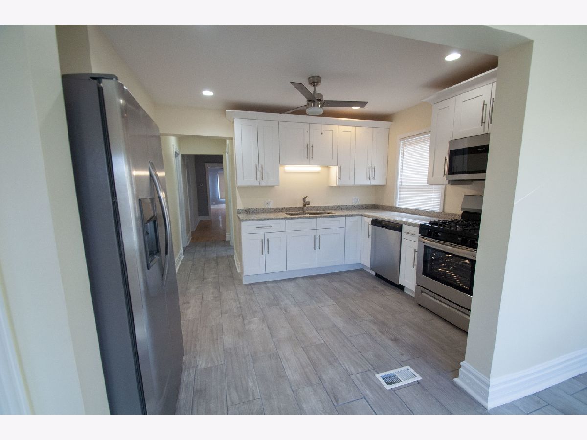 Lovely stucco bungalow on quiet South Shore block. Totally rehabbed - new electric, plumbing, mechanicals and central air - Spacious living room with sunporch and decorative fireplace, separate dining room, brand new luxurious kitchen featuring white shaker cabinets, stainless appliances and granite counters that opens to a sunny and bright breakfast room or office/den area. Three bedrooms and one stone and glass bath with double bowl sinks, deep soaking tub and linen storage completes the first floor. Basement is totally finished with another great stone bath, laundry room and enormous family room (4th bedroom could be created in lower level). Room to build garage in the back of the lot. Welcome!