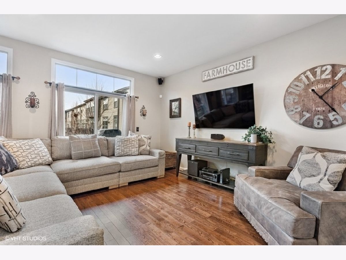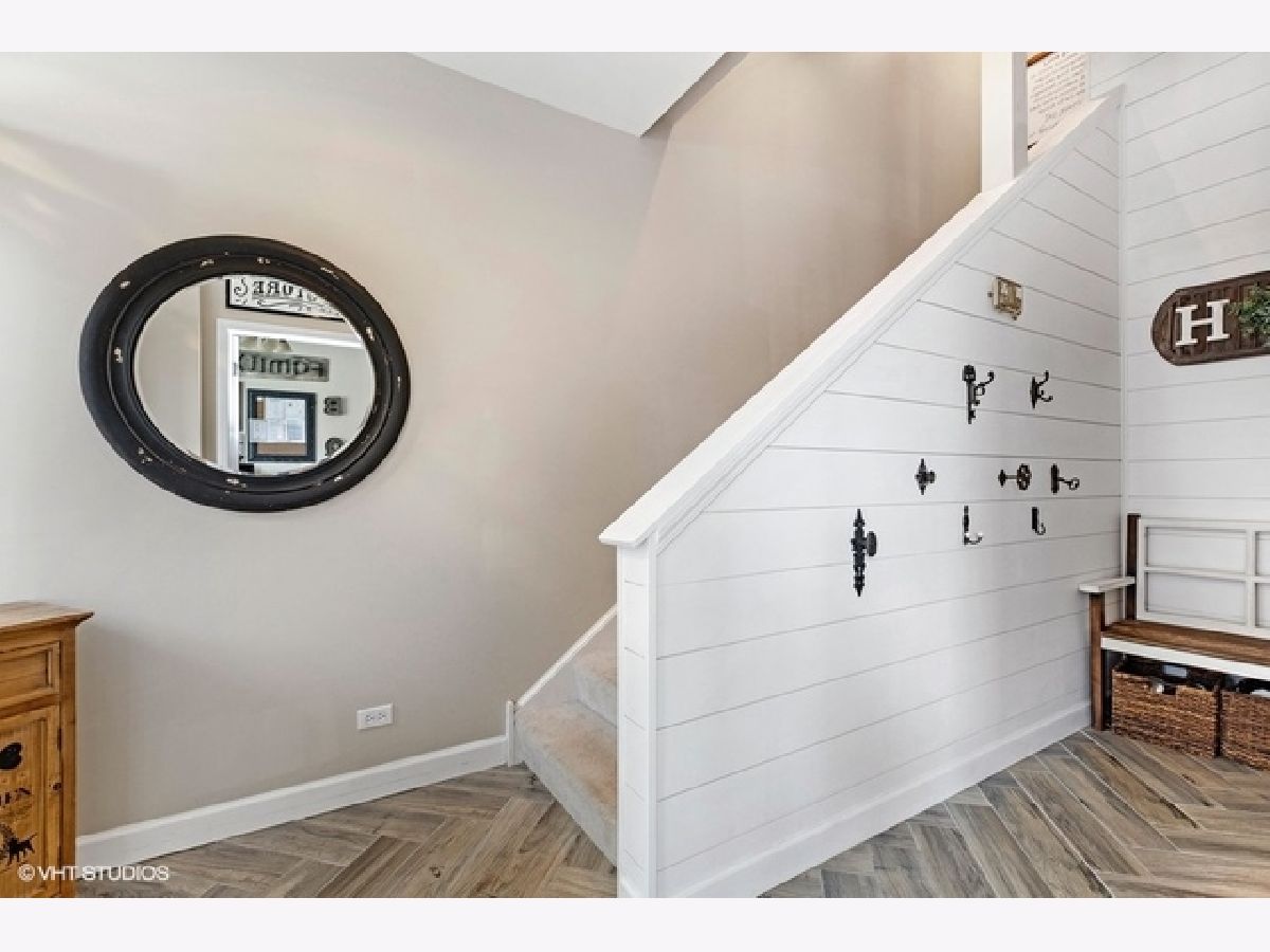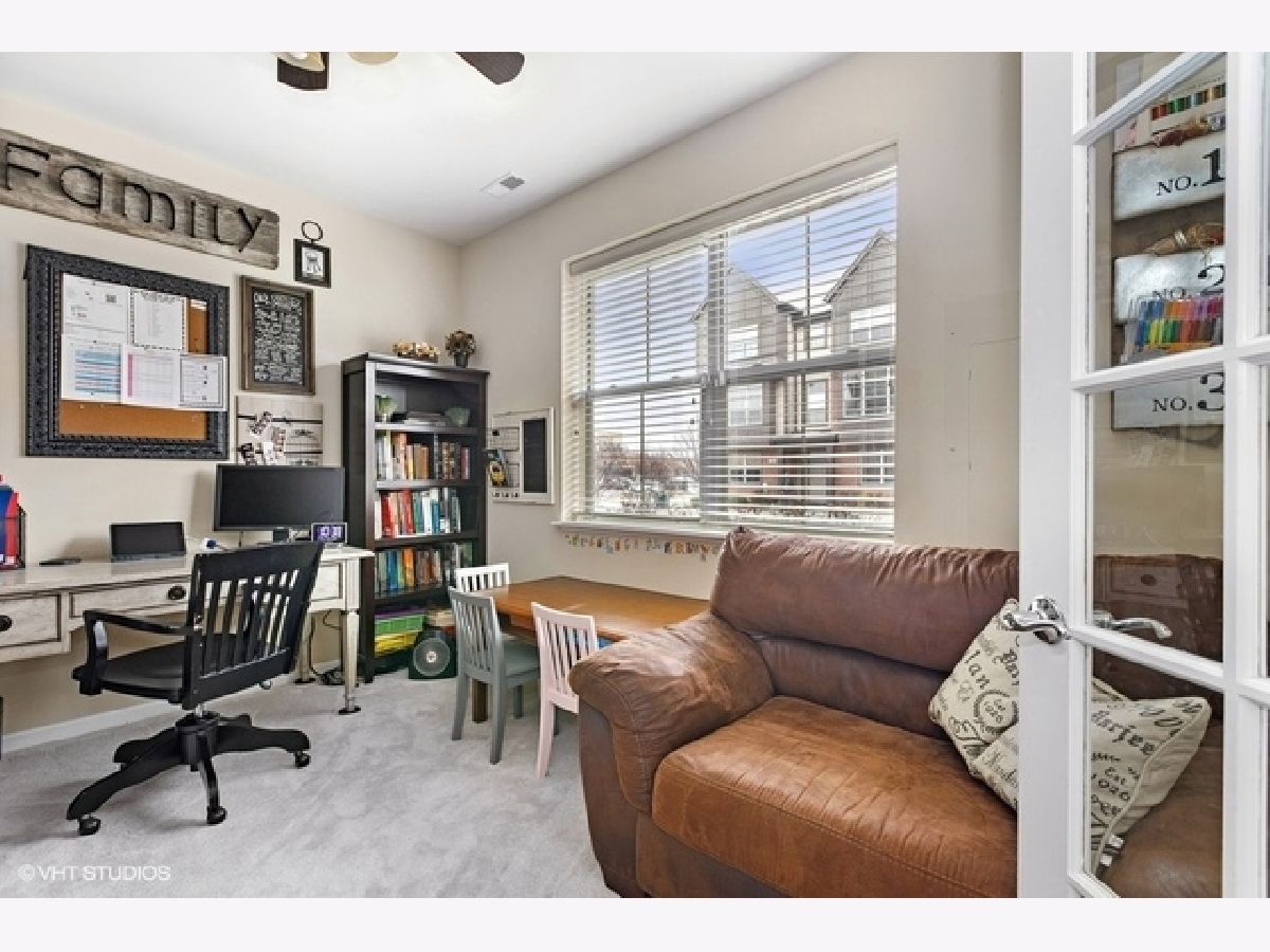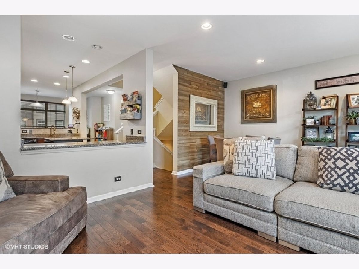 Highly upgraded 3 bedroom/2.1 bath townhome with bonus main floor office/den/playroom with french doors. Shiplap walls and herringbone tile in the foyer welcome you into the home. The main level floor plan is more open then the early builds with no obstruction between family (great room) and the kitchen and dining area. You will love the beautiful hardwood floors, recessed lights, gray granite counters, open kitchen concept and upgraded 42" kitchen cabinets. Family room and primary bedroom have custom reclaimed wood accent walls. 9ft ceilings on first and second floors, large balcony, white trim package and six panel doors. Easy access to trains, tollway and shopping at Mellody Farm!