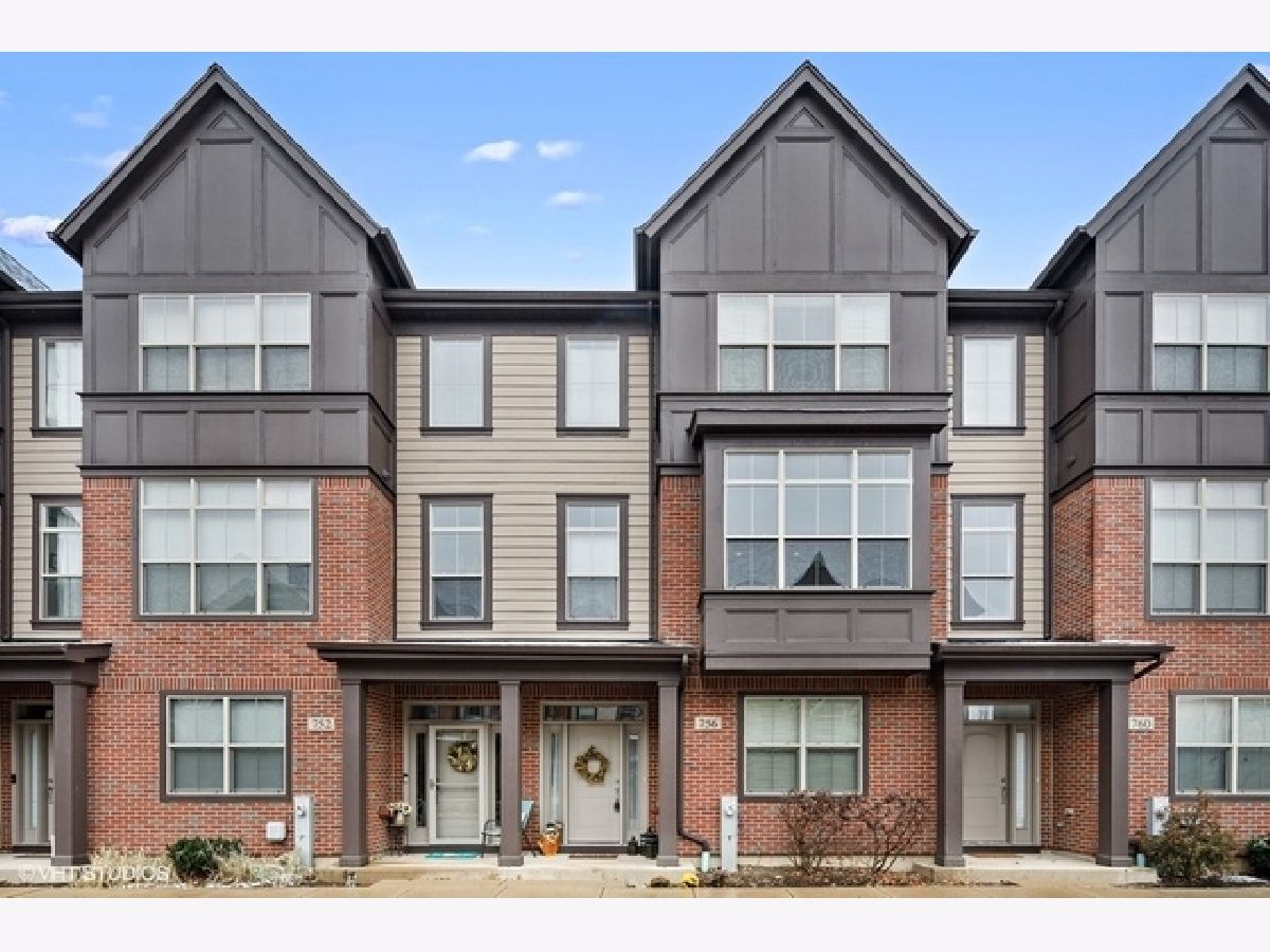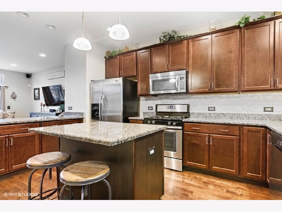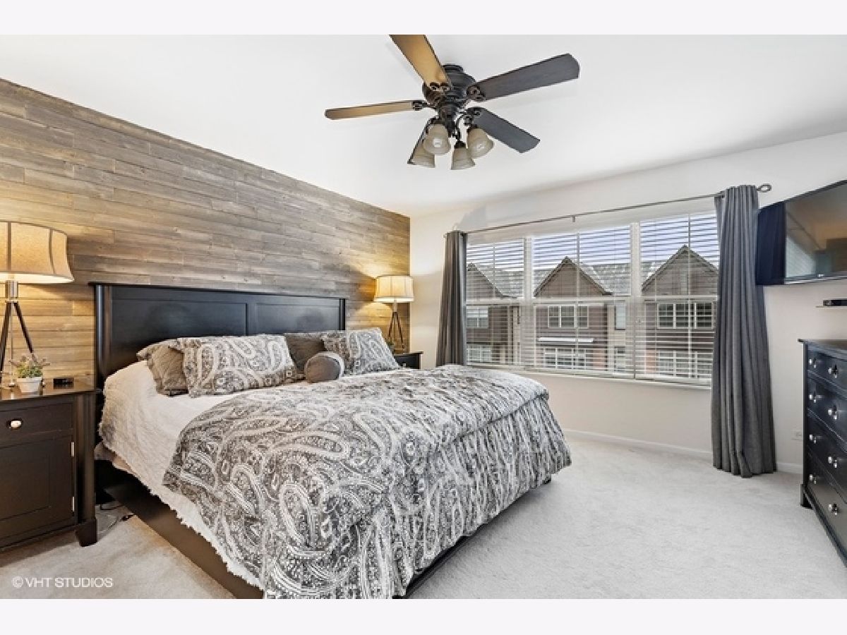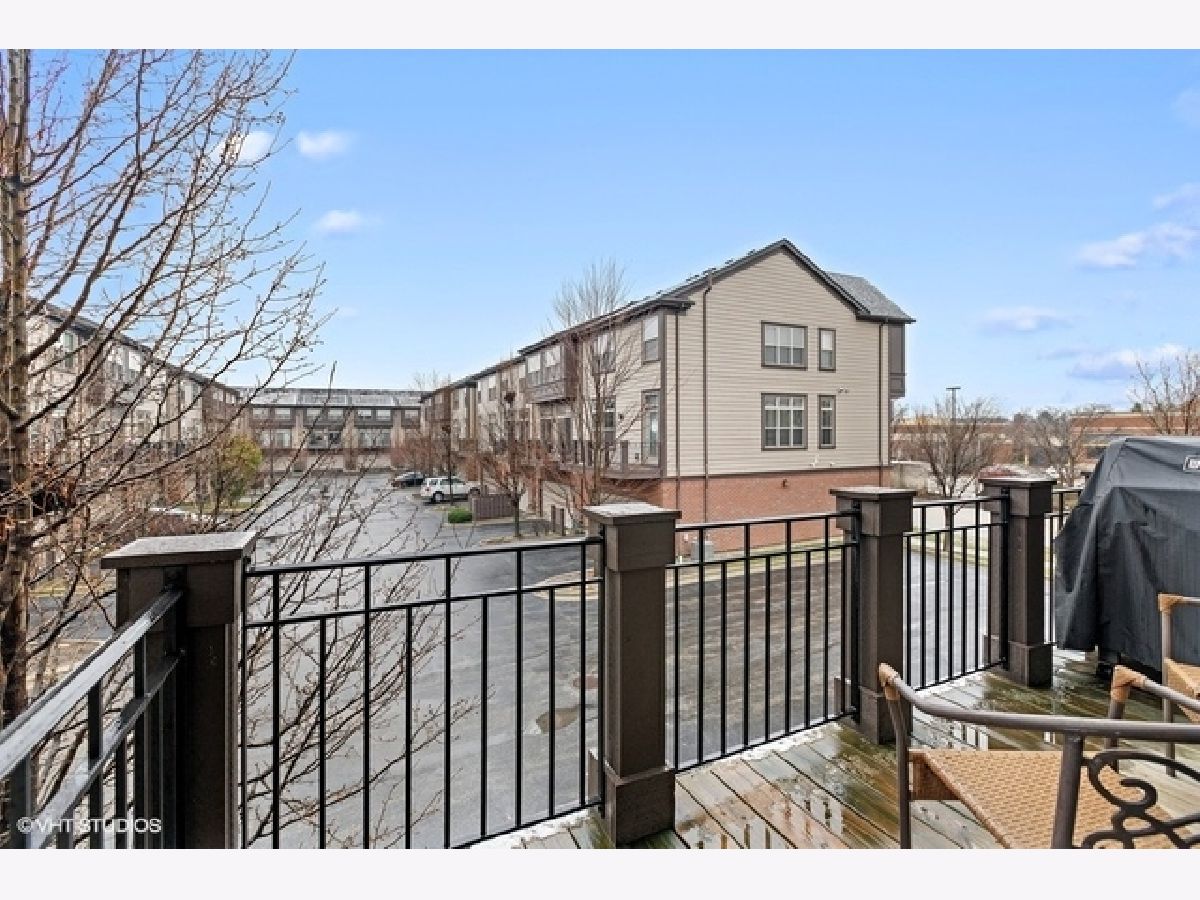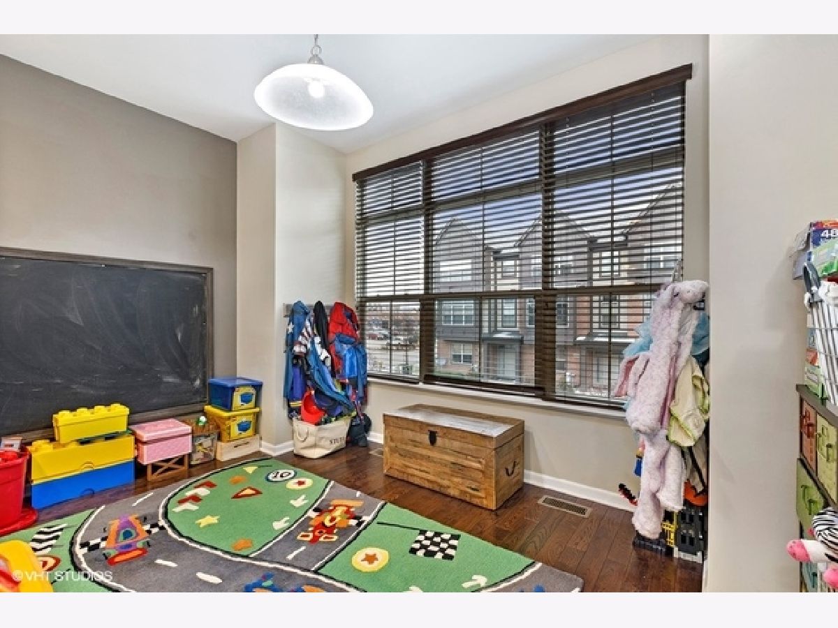 Highly upgraded 3 bedroom/2.1 bath townhome with bonus main floor office/den/playroom with french doors. Shiplap walls and herringbone tile in the foyer welcome you into the home. The main level floor plan is more open then the early builds with no obstruction between family (great room) and the kitchen and dining area. You will love the beautiful hardwood floors, recessed lights, gray granite counters, open kitchen concept and upgraded 42" kitchen cabinets. Family room and primary bedroom have custom reclaimed wood accent walls. 9ft ceilings on first and second floors, large balcony, white trim package and six panel doors. Easy access to trains, tollway and shopping at Mellody Farm!