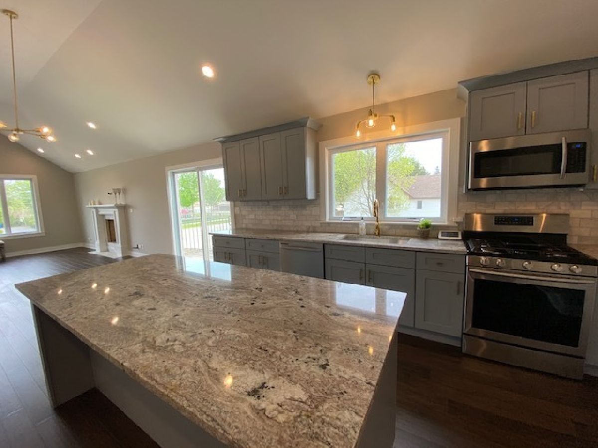 This ALL BRICK with beautiful decorative stonework NEW CONSTRUCTION home features...A large side and front yard, spacious open floor plan with vaulted ceilings, recess lighting throughout the home. 5 bedrooms 3 full baths, 2 beautiful fireplaces. Gourmet kitchen w/quartzite counter tops, large waterfall island, stainless steel appliances, walk-in pantry, Dining area with balcony. Mastersuite with full bath & his/her closets. Lower level features gorgeous wet bar w/ quartzite countertops, wine refrigerator, laundry room has walk out access to garage,Perfect for in-law arrangements. THIS NEW CONSTRUCTION HOME IS STUNNING AND TASTEFULLY DESIGNED!!!