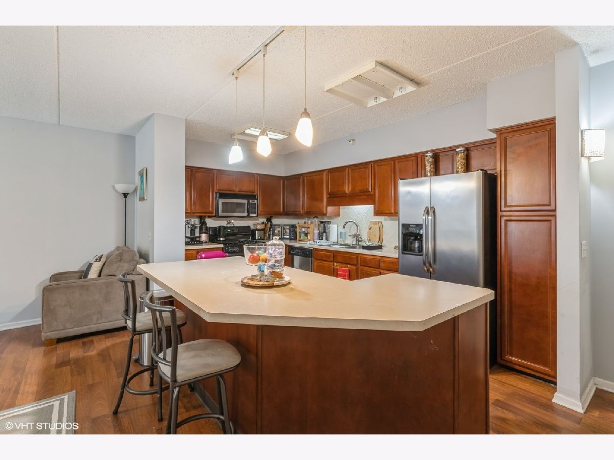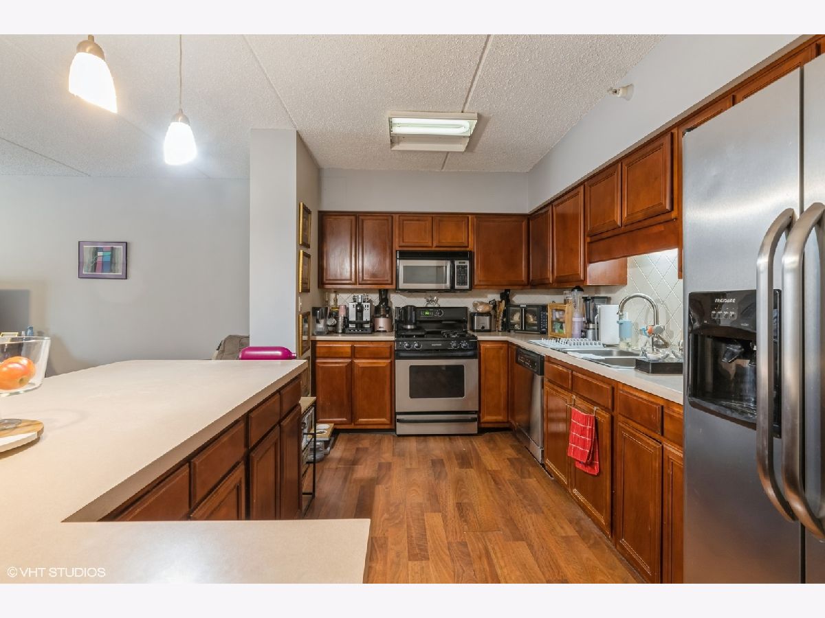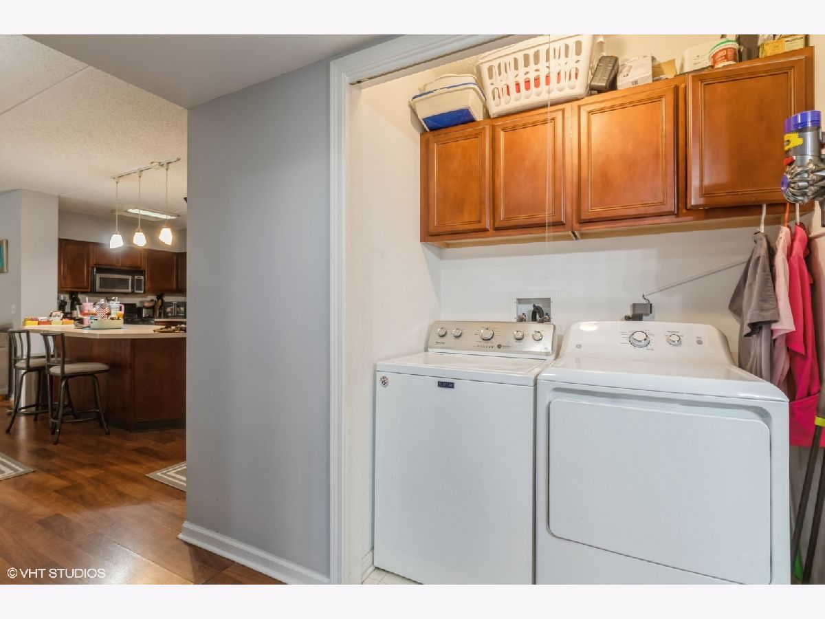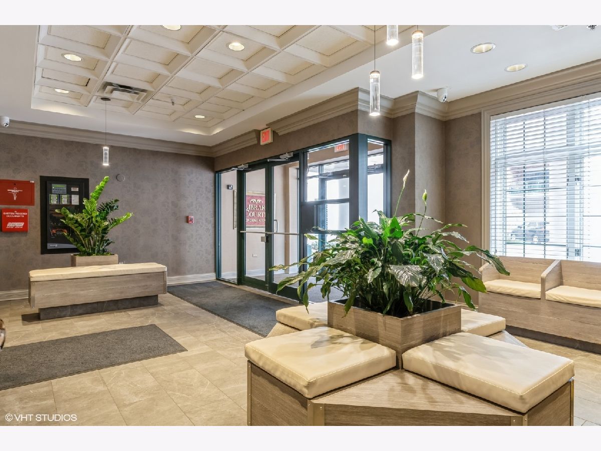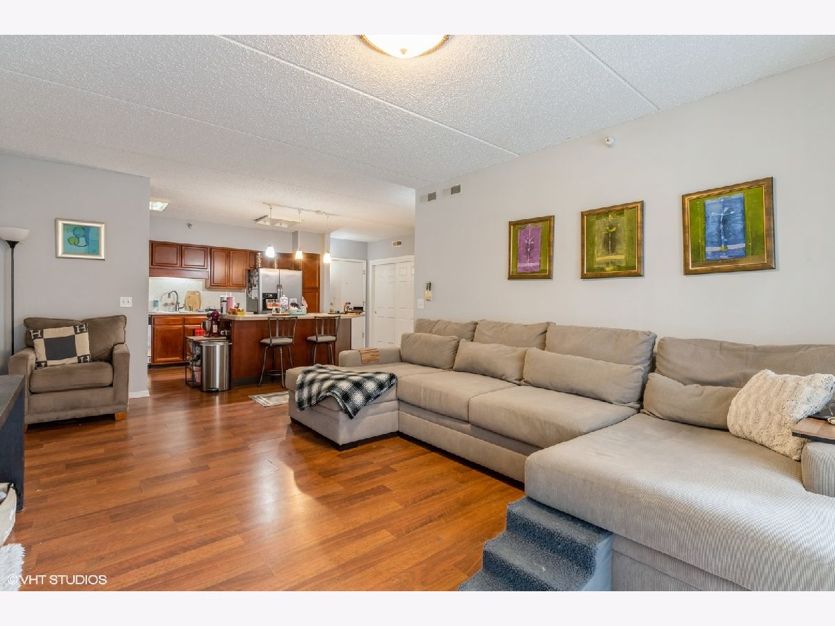 Condo in the Heart of Downtown Des Plaines! Library Courte has great location. True 2 bedroom with plenty of closet space, in unit full size washer/dryer. Open concept kitchen with island and seating. SS appliances. New flooring in primary bedroom. Private balcony facing courtyard! 1 garage space. Pets allowed and investors.