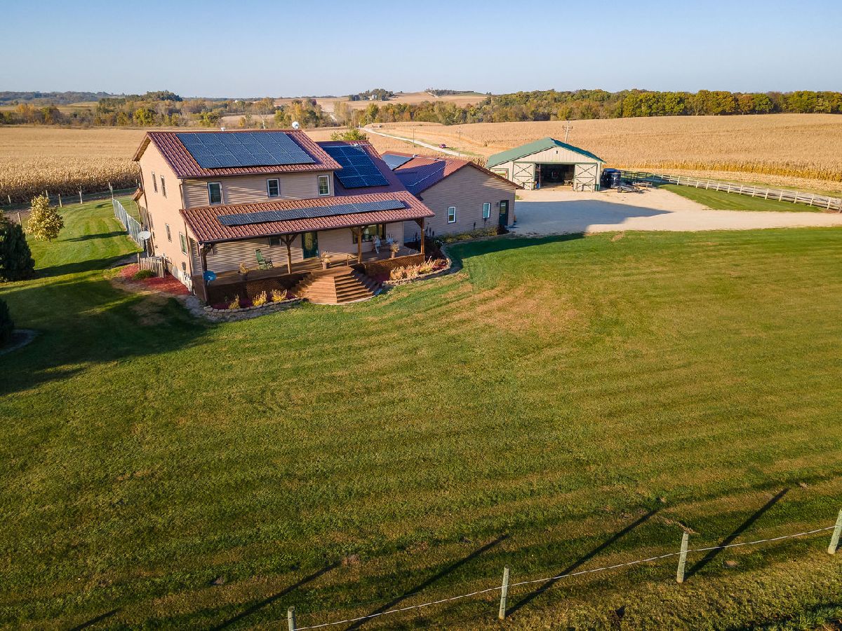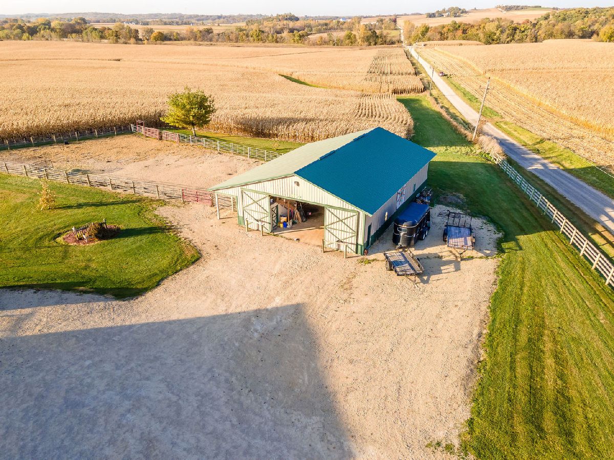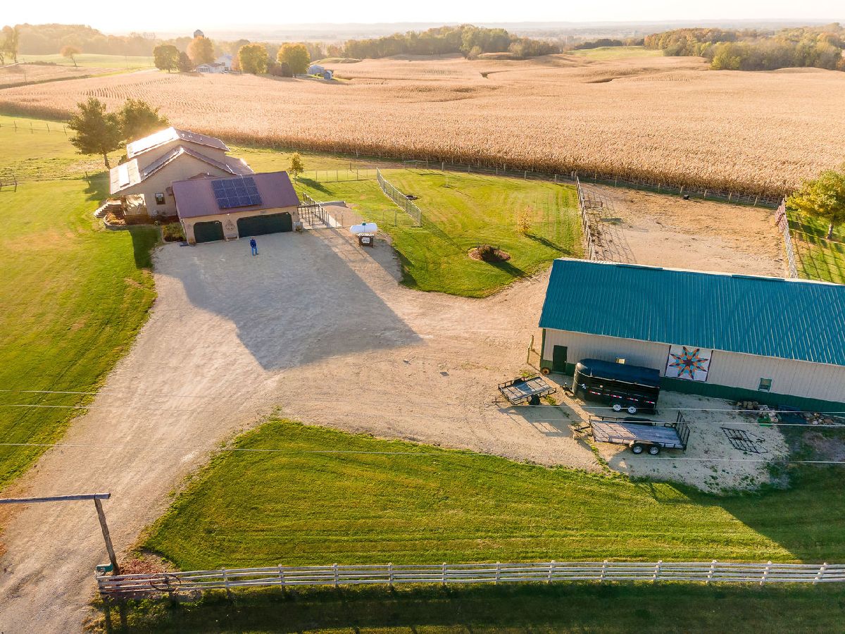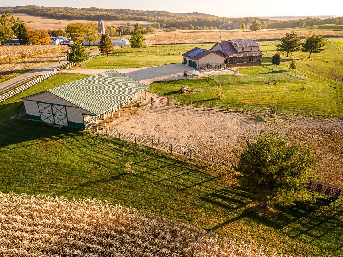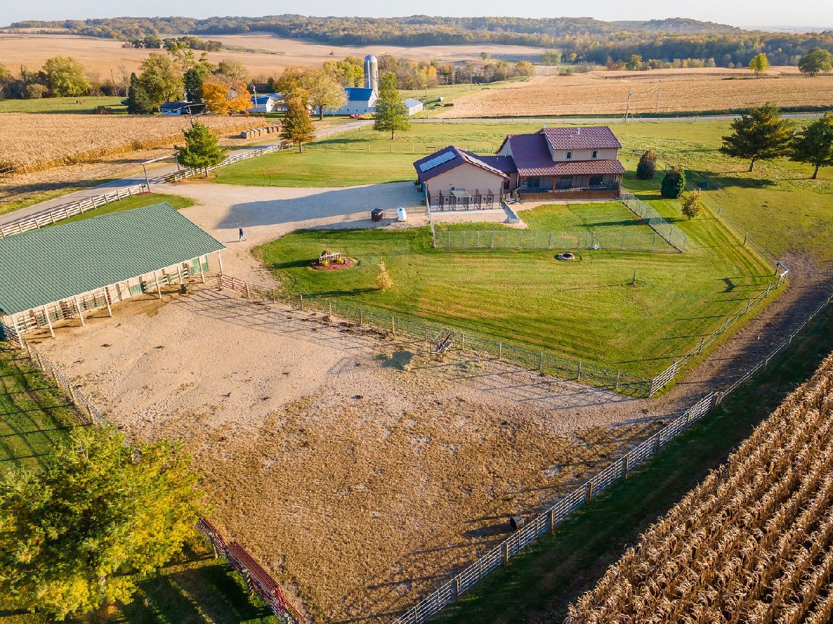 Hobby Farm Deluxe on 5.31 acres. Enjoy panoramic country views from the front or back full length porches this 3 bedroom3 bath custom home has. This is truly one of a kind property with so many features and updates to enjoy. Open concept living-dining room and kitchen area have vaulted ceilings with custom woodwork and a half bath. Kitchen has custom crafted hickory cabinets and walk-in pantry. Primary bedroom is on the main floor with 2 walk-in closets, slider to walkout screened back porch and private bath that has a double sink, whirlpool tub, and separate shower. 2nd floor has a lounge/rec area with built-in storage/tv stand and custom western mural wall along with 2 large bedrooms and a full bathroom that has a double sink vanity. The oversized 3 stall garage has radiant in-floor heating, multiple cabinets and counters for workshop space and storage, ventilation fan to outside, 6 inside kennels that each have outside private access and can be opened to the larger chain-link fenced yard. Garage has 2 exterior entry doors and 2 interior doors; one going to the basement and one to the main floor where the laundry room is conveniently located. Full partially finished basement has9ft ceilings, a family room, one large workshop/storage area and a second storage room with shelving. 40x60 Pole shed offers 2 insulated rooms, 2 box stalls, access to outside paddock, large sliding doors on both sides and multiple entry doors, loft area with stair access for easy access. 8' wide full length Lean-to off pole shed has an automatic waterer, large paddock that is great for an outdoor riding arena with continuous panel fencing. Most recent house updates include fresh paint throughout, most newer windows, metal roof in 2021. Leased solar panels keeps electric bill less than $200/month. Garage in-floor heat has it's own water heater and pressure tank.