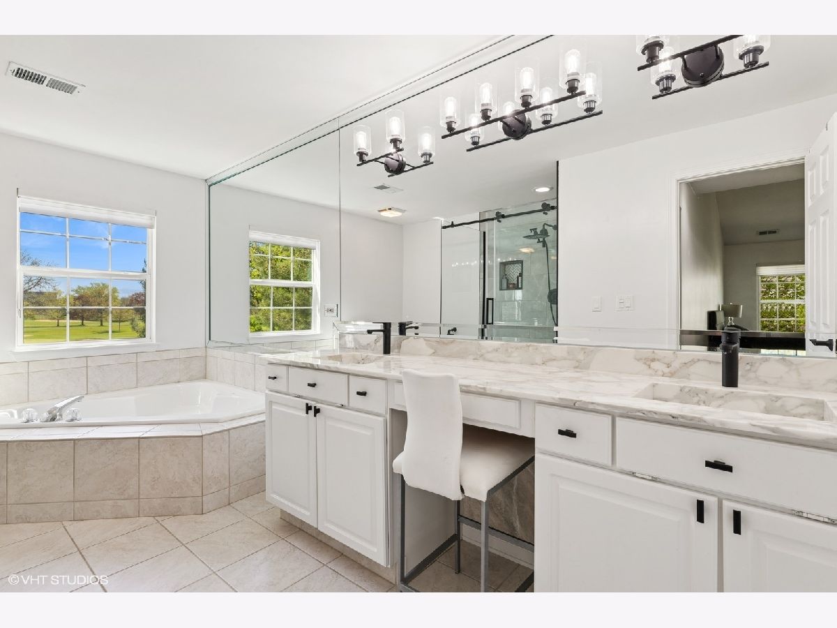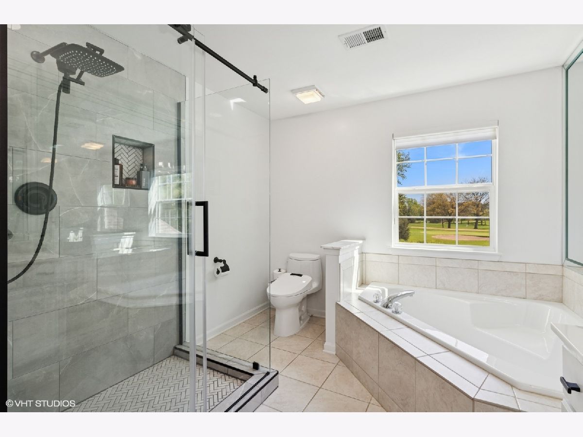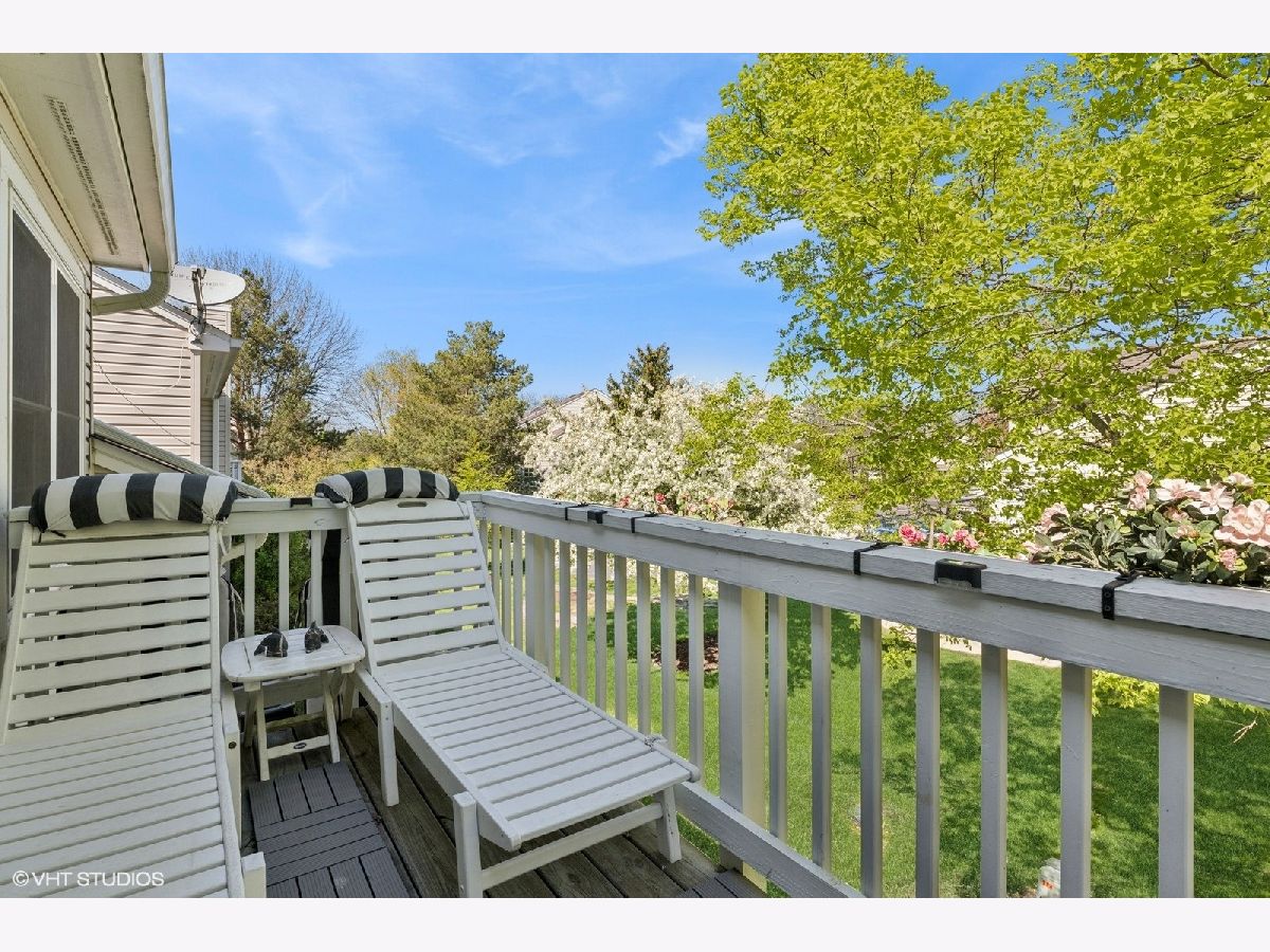 Largest 2 BR, 2 bath unit in the sought-after Rose Glenn subdivision with golf course views. 1844 spacious square foot similar to a 3BR unit. Open floor plan featuring vaulted ceilings in the entryway and numerous windows throughout that provide an abundance of natural light. New upgraded wood floors in living, dining and master BR. Newer eat-in kitchen with quartz countertops. Beautifully newly renovated marble master bath and hall bath. 2 Car attached garage and private balcony. Desirable Stevenson HS district. Located next to a golf course and across from parks, pools, bike paths, and restaurants. Have to see to appreciate.