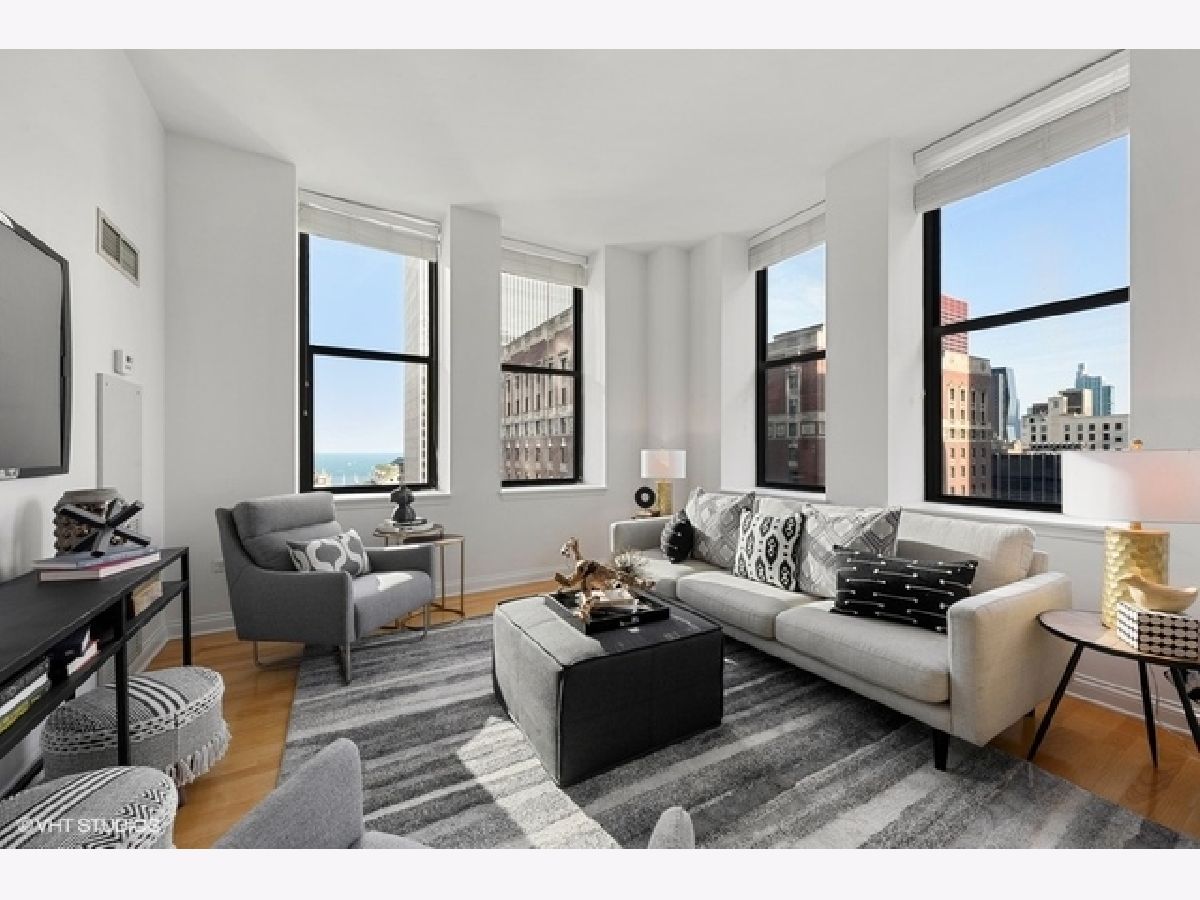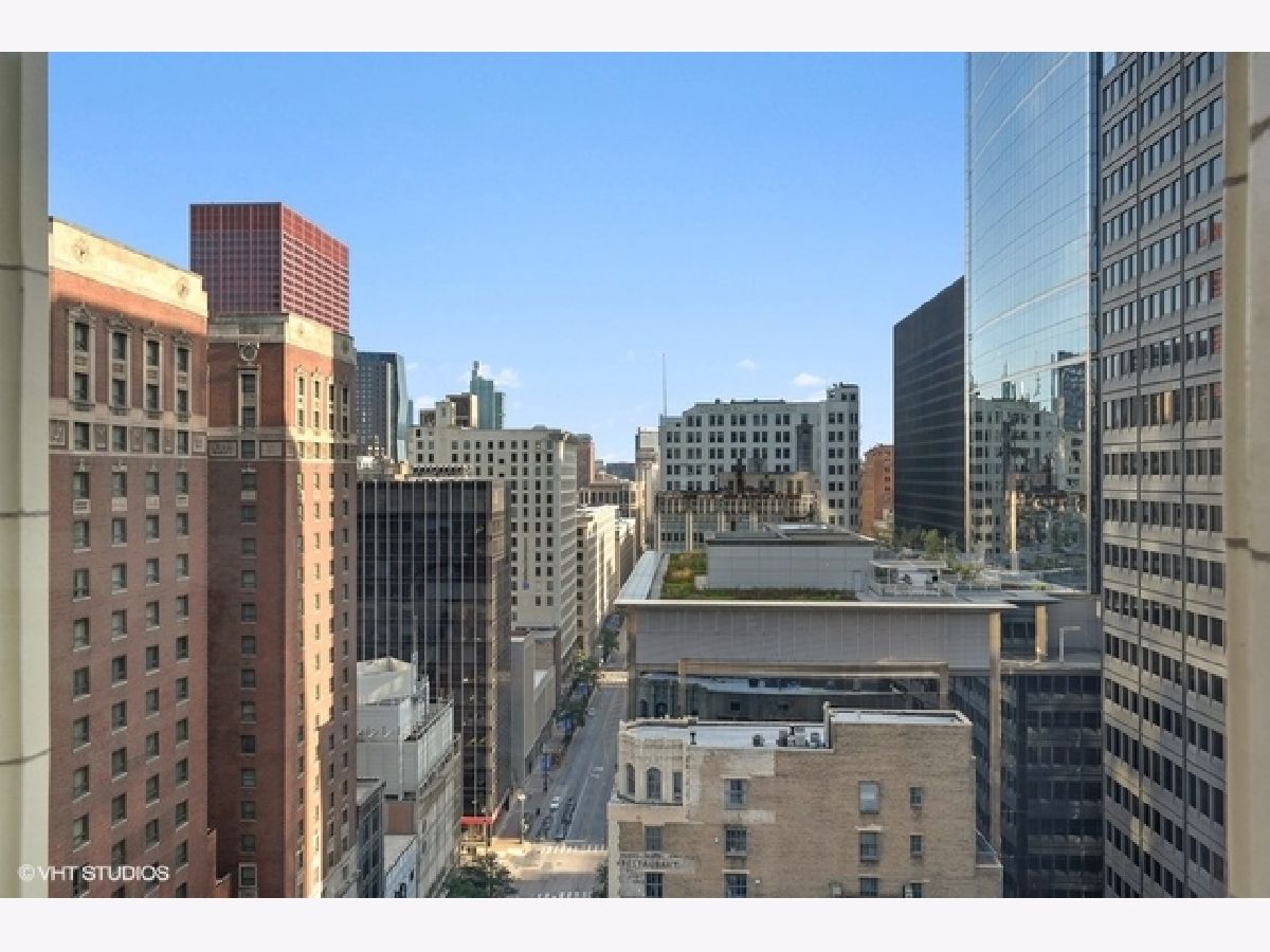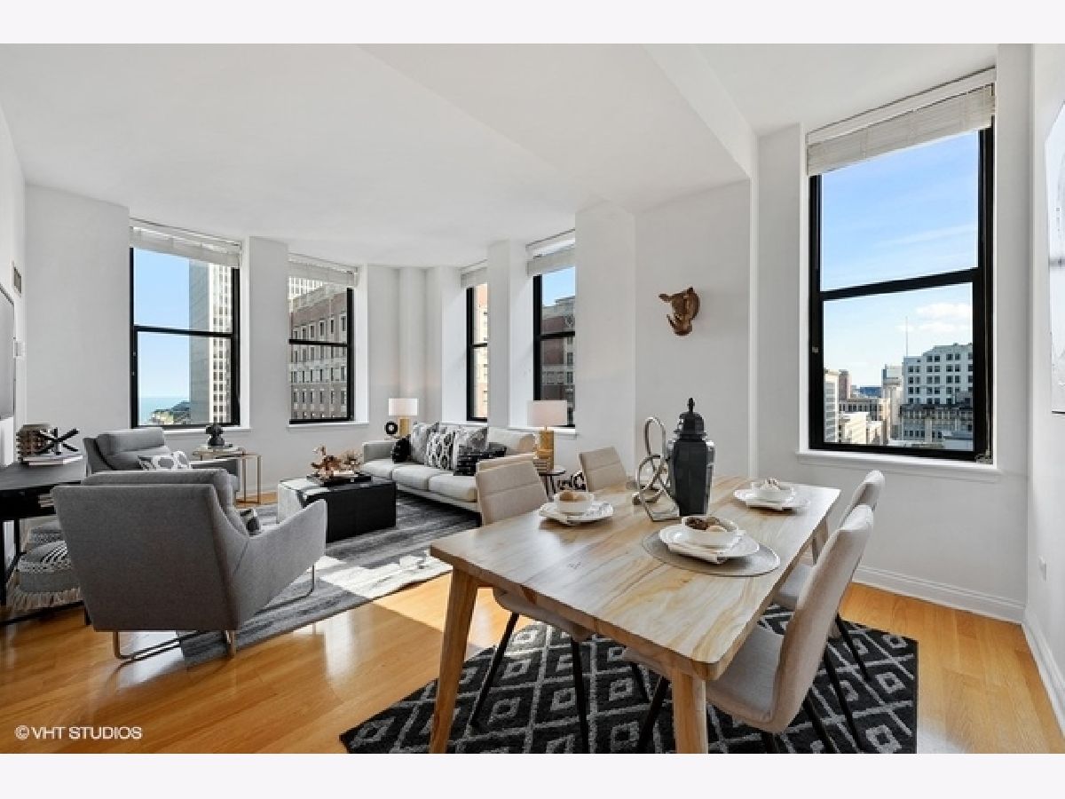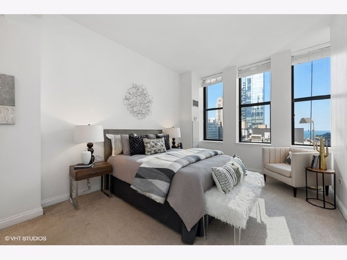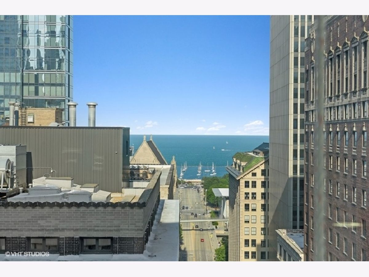 Sun-filled, largest floor plan 2 BD/2BA corner unit in Loop/Theater District.Unit features 12+ high ceilings, large windows that draw plenty of natural light, city & lake views, hardwood floors, oak cabinets, granite countertops. En-suite master bedroom with two closets and a large master bathroom featuring a soaking tub and separate shower. Second bath has a shower. Ample closets throughout and in-unit washer/dryer. Unit comes with additional storage. Full amenity building offers fitness center, party room, conference room and business center, 24H doorman, bike storage and a terrace that features an area for pets and is equipped with grills. Close proximity to transportation, theaters, Art Institute, Millennium Park, the lake as well as Red and Blue EL lines. Garage parking is available for an additional $13,000. Sold " AS IS".
