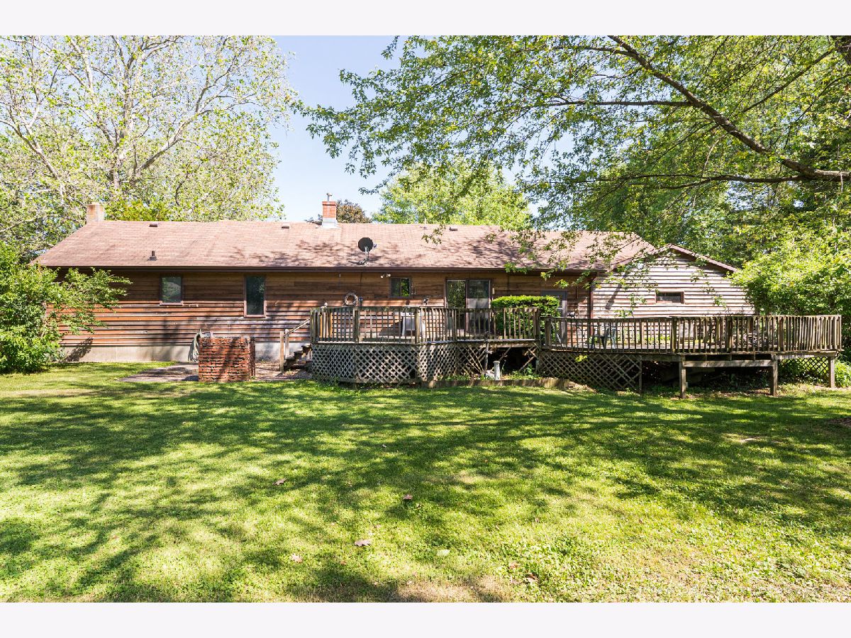 Charming ranch home sits on a double lot in Grand Detour. The foyer leads to a very large living room and two bedrooms with a full bath plus a third bedroom with its own half bath- this room might also be perfectly suited for home office or den, light and bright kitchen with eat-in area AND breakfast bar AND designated dining area, just off the garage you will find an additional den or hobby room offering you even more living space. The basement offers a family room with wood burner, shop, or hobby possibilities. Attached two-car garage, patio door to extra-large two-tier deck, front deck, second garage, and garden sheds. Natural light, attractive wood beam accents in living room, and this setting are ALL wonderful attributes of this property. ESTATE- sold as is.