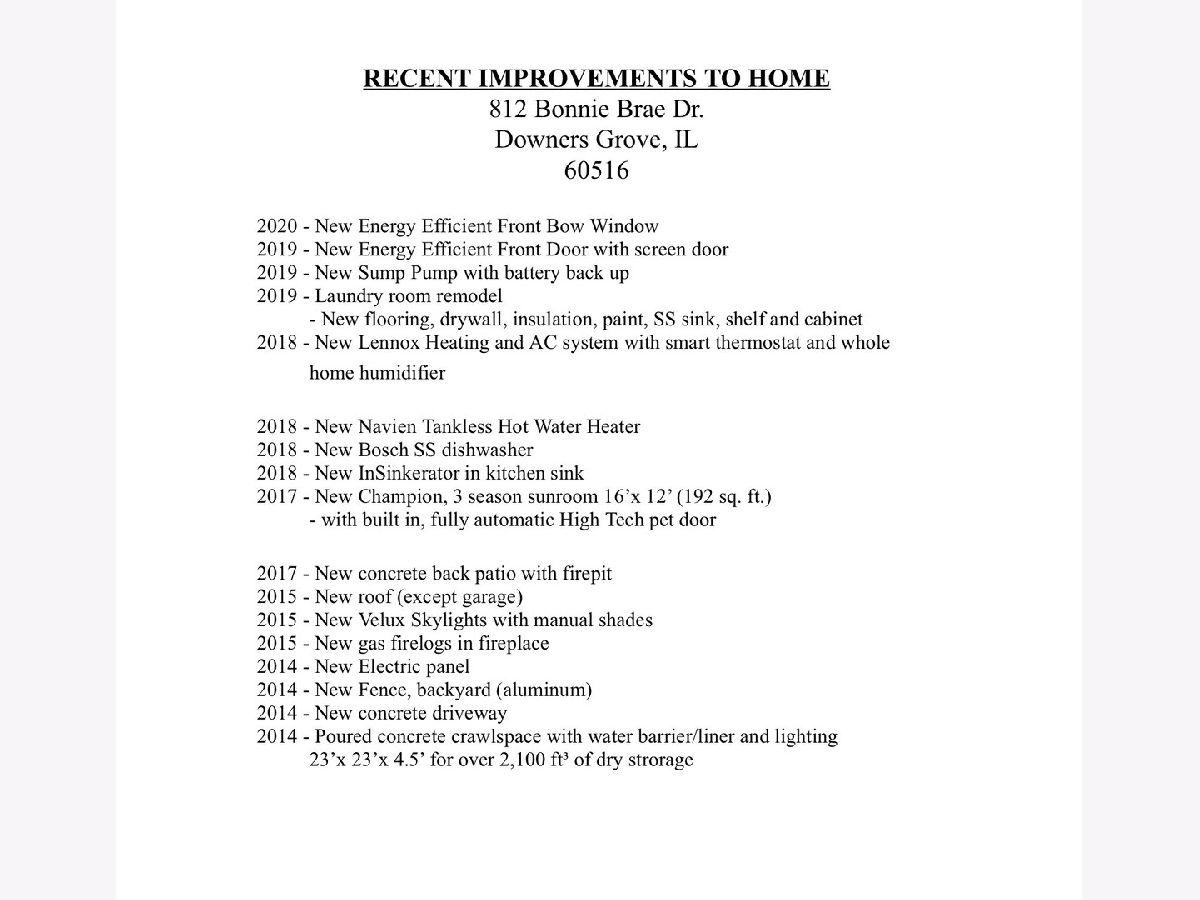 CONTEMPORARY OPEN FLOOR PLAN SPLIT LEVEL, MOVE IN READY WITH MANY UPDATED AND NEWER FINISHES | FURNACE, HUMIDIFIER & AC W/ SMART THERMOSTAT, TANKLESS/ON DEMAND HWH NEW 2018 & ROOF (MAIN HOUSE, NOT GARAGE) NEW IN 2015 | VAULTED CEILINGS & SKYLIGHTS (NEW 2015) OFFER EXTRA SUNLIGHT & MANUAL SHADES | UPDATED KITCHEN FEATURES 42" MAPLE CABINETS, GRANITE, ALL SS APPLIANCES (NEW BOSCH DW 2018 & GARBAGE DISPOSAL 2018) | UPDATED BATHROOMS - UPPER BATHROOM BOASTS DUAL VANITY W/ TOWER FOR EXTRA STORAGE, SOAKING JETTED TUB & SEPARATE SHOWER WITH GLASS DOORS | HARD-WOOD FLOORING THROUGHOUT MAIN AND UPPER LEVELS | ALL RECESSED LIGHTING IS LED & DIMMABLE | LOWER LEVEL FEATURES COZY GAS LOG FIRE PLACE, NOOK FOR DESK/WORK SPACE, UPDATED FULL BATHROOM, EASY ACCESS TO CRAWL/STORAGE SPACE & WALK OUT TO SPACIOUS 2 CAR GARAGE | SUNNY 3 SEASON SUNROOM (2017) OVERLOOKS SIZABLE & DEEP YARD W/ ACCESS GATE TO WALK-ING PATH & PARK AREA | SPACIOUS CONCRETE PATIO & BUILT IN FIREPIT PERFECT FOR ENTERTAINING | NEWER FINISHES ~ 2014- ELECTRIC PANEL, CONCRETE DRIVEWAY, FENCE, POURED CONCRETE CRAWL SPACE W/ WATER BARRIER & LIGHTING ~ 2015- GAS LOGS FOR FAMILY ROOM FIREPLACE ~ 2017- 3 SEASON SUNROOM W/ TILE FLOOR & REMOTE/AUTOMATIC PET DOOR, CONCRETE PATIO W/ WOOD BURN-ING FIRE PIT ~ 2019- ENERGY EFFICIENT FRONT DOOR & SCREEN DOOR, REMODELED LAUNDRY/UTILITY ROOM W/ LVT (WATERPROOF), DRYWALL, INSULATION, SS SINK & CABINET, SUMP PUMP W/ BATTERY BACK UP ~ 2020- ENERGY EFFICIENT FRONT BOW WINDOW | 2 MILES TO DOWNTOWN DOWNERS GROVE & METRA COMMUTER TRAIN | 3 MILES TO I355, 5 MILES TO I88, 4 MILES TO I55