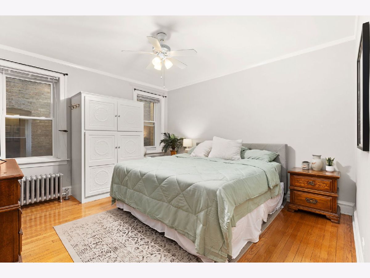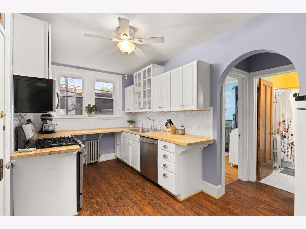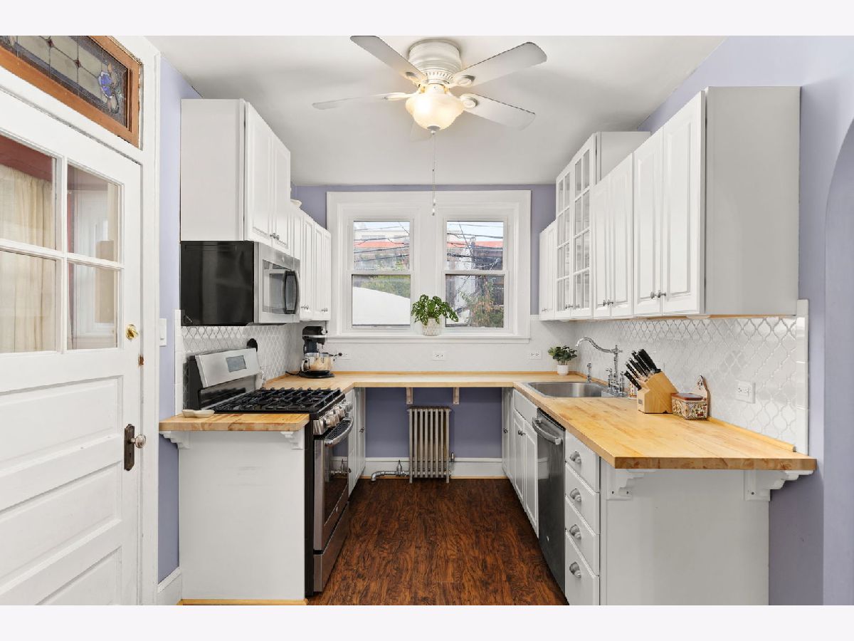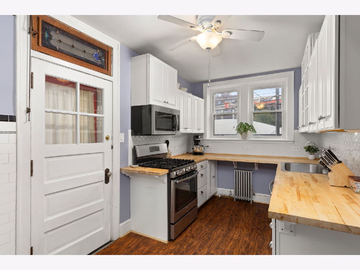 Classic, cool charm fills this expansive, light-filled, three bedroom condo w/two full baths, an updated kitchen plus NEW WINDOWS & GARAGE PARKING. It feels like home in this sprawling space (about 1700 sq. ft.) w/large windows that open up the front living area overlooking a beautiful, tree-lined street. Details like lovely archways, a decorative fireplace, stained glass, built-in bookshelves & hallway nook add to the character. Kitchen has newer white cabinets w/butcher block counters, stainless appliances & butler pantry. Dining room is currently doubling as a home office & has more than enough space for ample seating/buffet/hutch. Bedrooms each have their own A/C unit and ceiling fan. New, in-unit, front loading washer/dryer & you have a private storage space in the building. South Evanston at its best -- come see this great place!