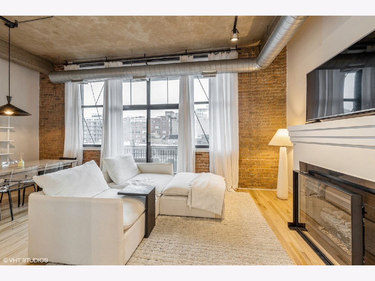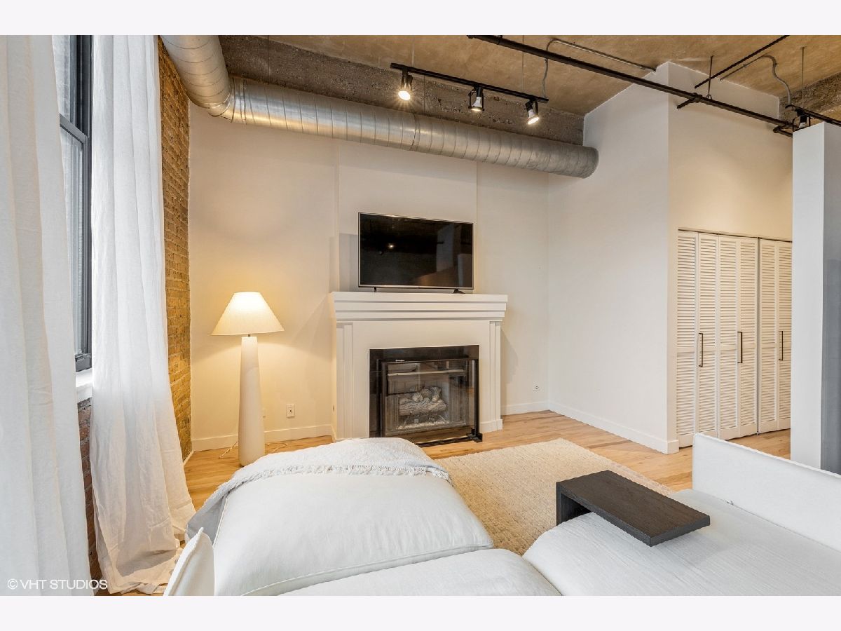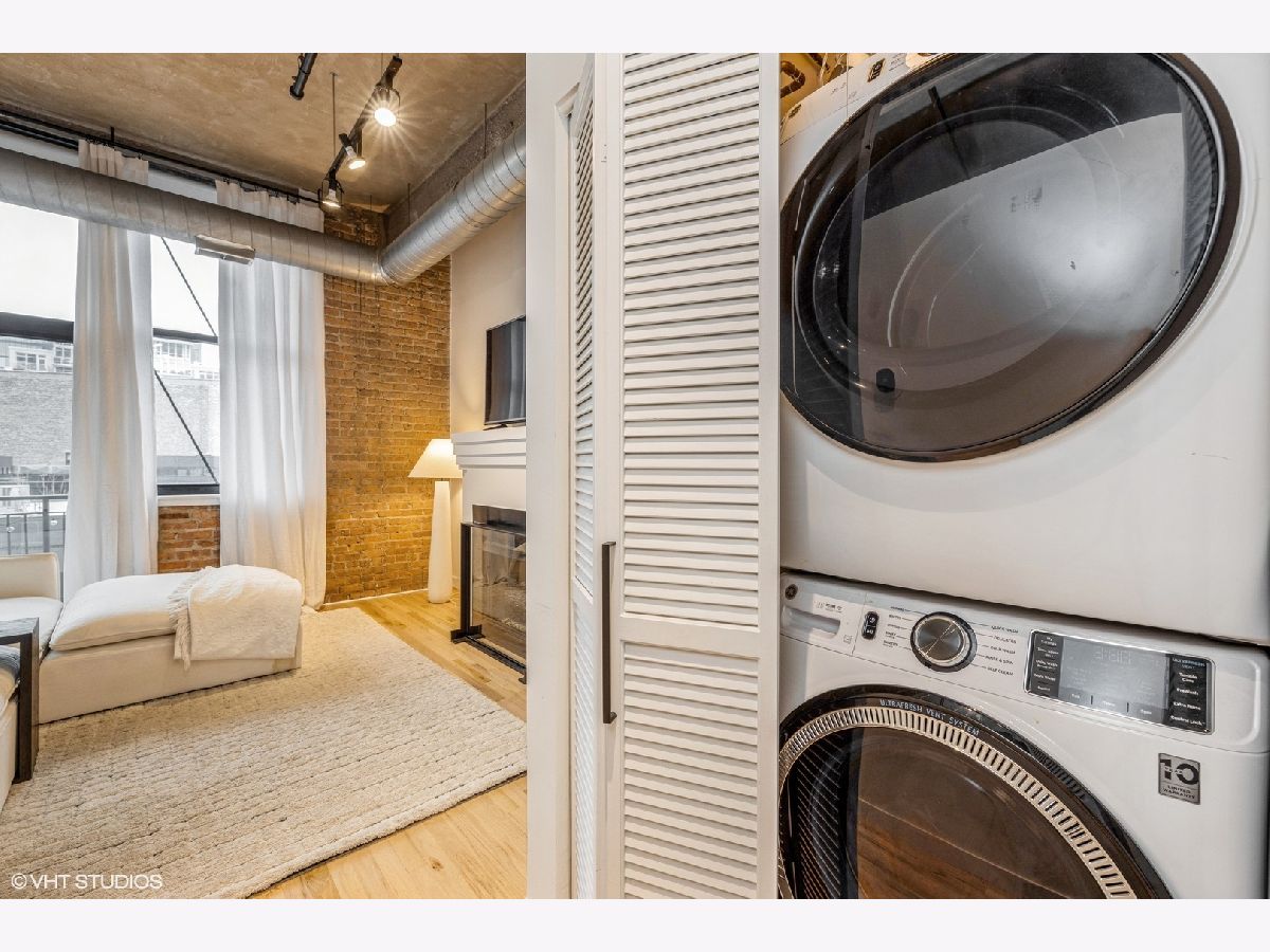 Rarely available 1-bedroom, 1-bath concrete loft in the highly sought-after Washington Blvd Lofts. This stunning home features soaring 14-foot concrete ceilings, exposed brick walls, and floor-to-ceiling west-facing windows that flood the space with natural light. The open, airy floor plan extends to a spacious private balcony. The kitchen offers stainless steel appliances, maple cabinetry, and granite countertops, seamlessly opening to the living and dining area. The living room is anchored by a gas fireplace with a decorative mantle and complemented by hardwood floors throughout. Thoughtful storage abounds with custom-built coat and bedroom closets. Additional highlights include newer in-unit stacked washer and dryer and a large, private, lockable storage cage located in a secure, climate-controlled storage room. A true loft living opportunity in a premier West Loop location close to the highway, Randolph Street restaurant row, Fulton Market, Mariano's, Whole Foods, Greektown, shopping, nightlife and more! 1 Deeded exterior parking space is included.
