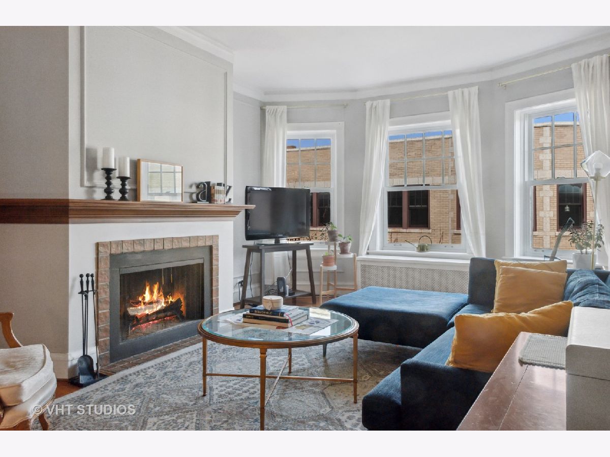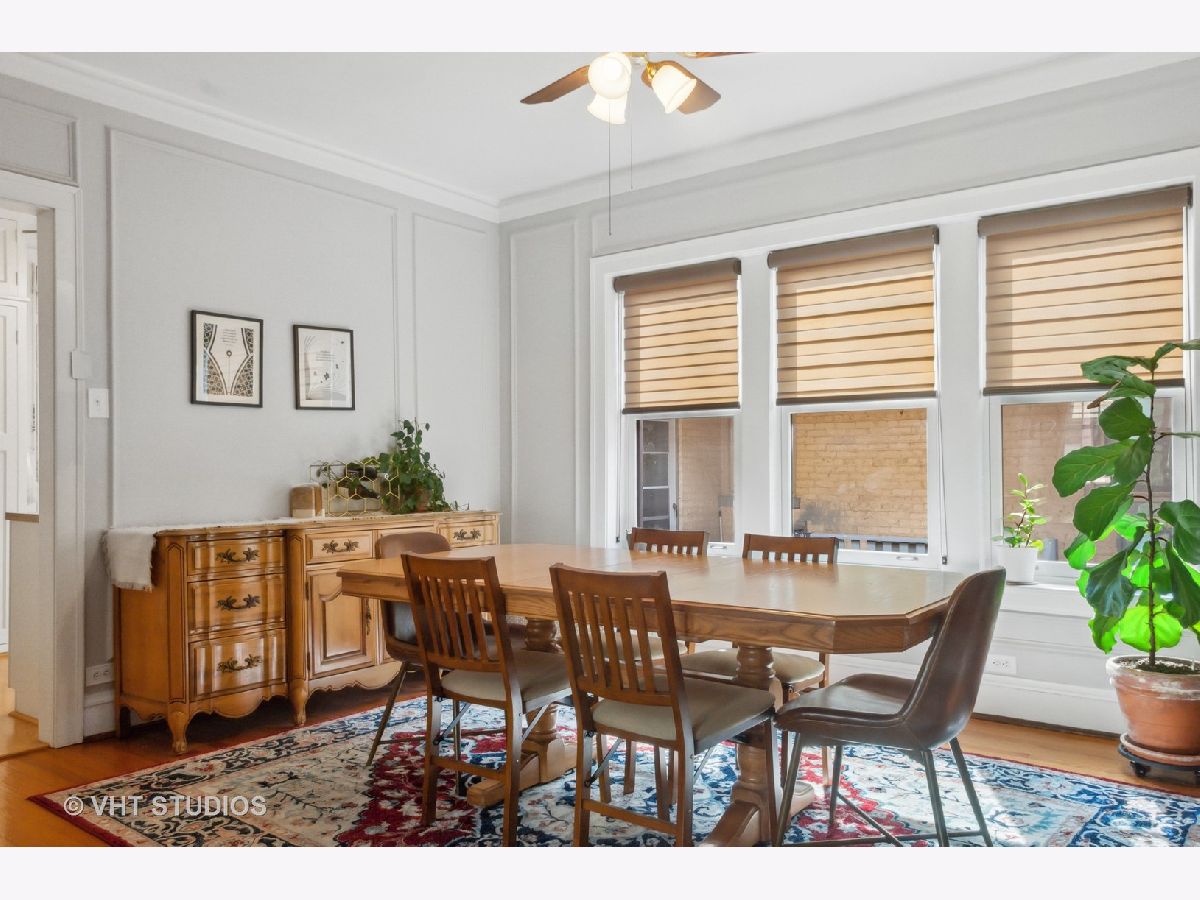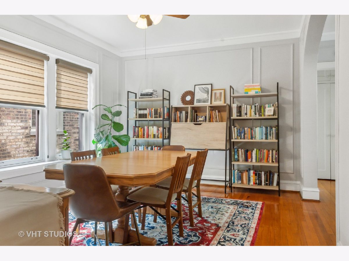 Gorgeous top floor condo in Historic courtyard building. Loads of light and air fill this unit. Split floor plan includes 2 bedrooms and 2 full baths. Large dining room adjacent to the white kitchen. Classic details including curved arched doorways, natural hardwood floors and a wood burning fireplace. Newer windows and custom window treatments. Deeded garage parking space included. This is a premier location in Evanston and in very close proximity to the Main Street Purple Line, Metra, Lake Michigan, restaurants and shopping. Monthly assessment includes heat. Window AC units included. Large storage space and FREE LAUNDRY.
