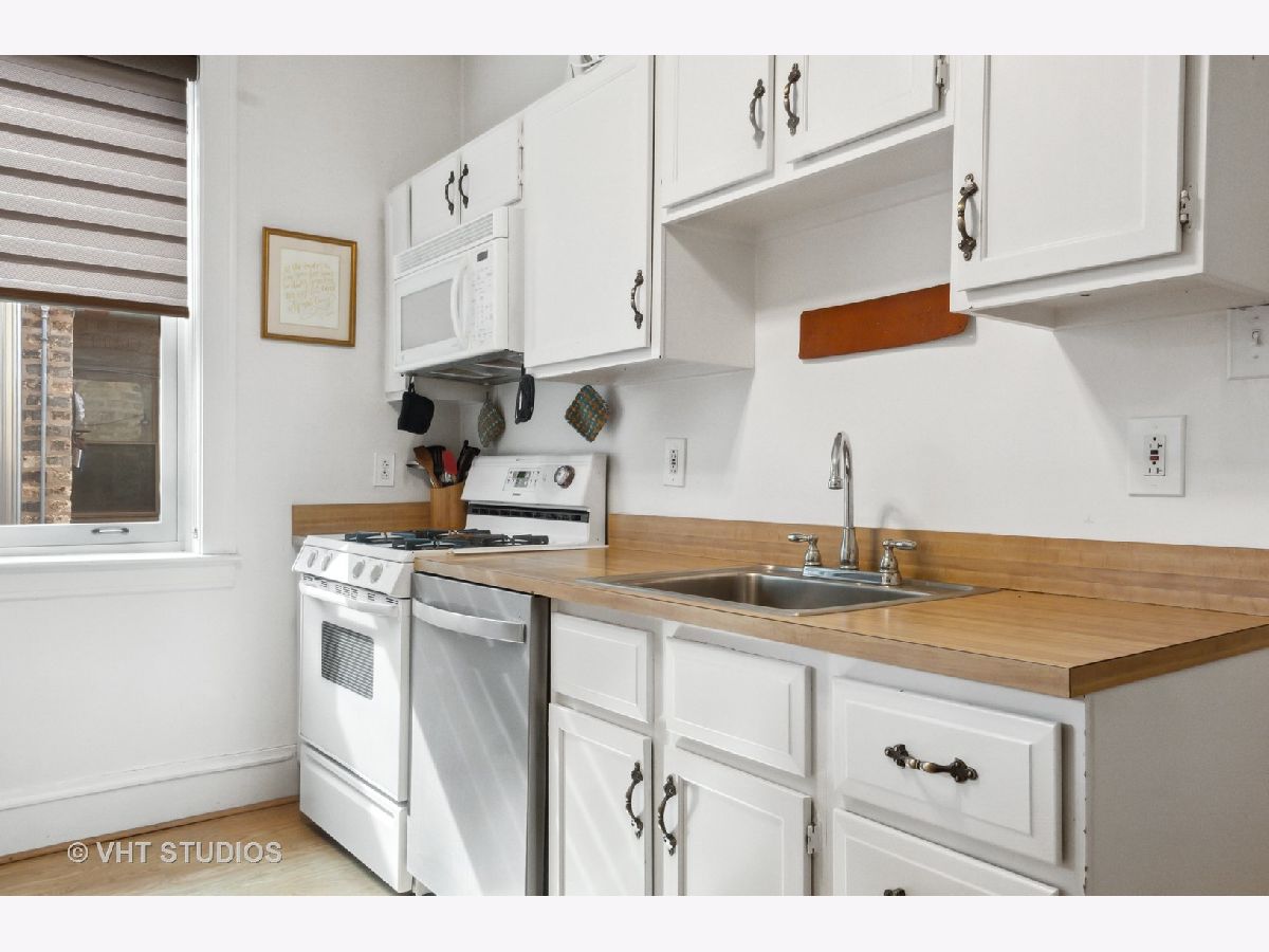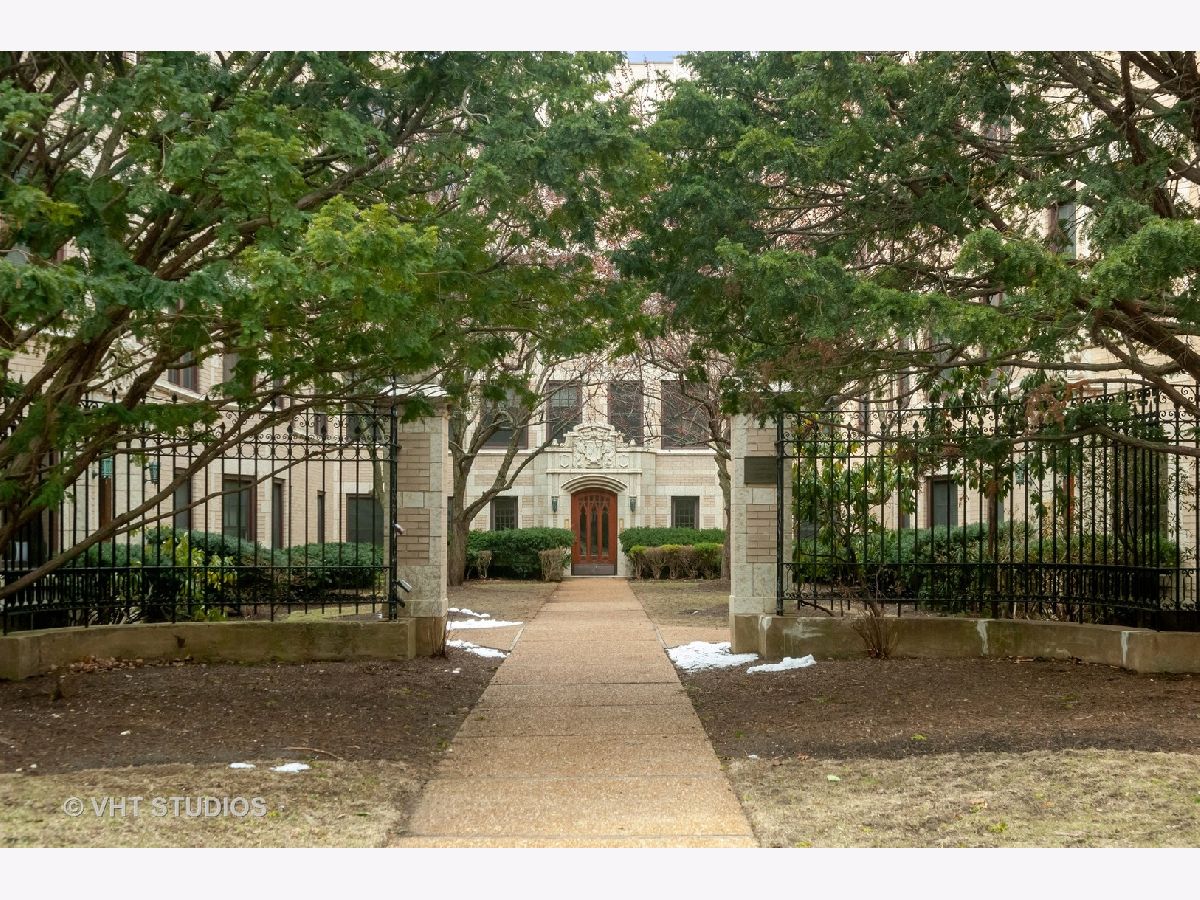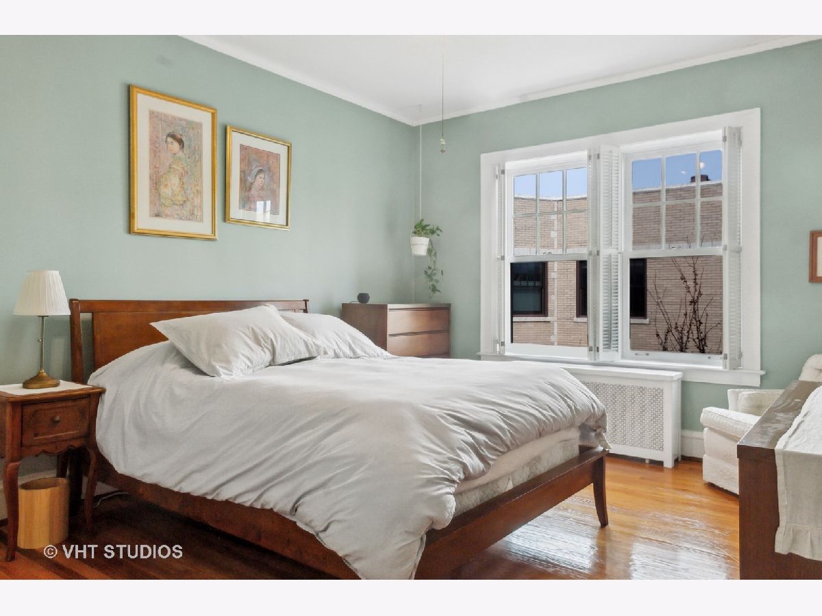 Gorgeous top floor condo in Historic courtyard building. Loads of light and air fill this unit. Split floor plan includes 2 bedrooms and 2 full baths. Large dining room adjacent to the white kitchen. Classic details including curved arched doorways, natural hardwood floors and a wood burning fireplace. Newer windows and custom window treatments. Deeded garage parking space included. This is a premier location in Evanston and in very close proximity to the Main Street Purple Line, Metra, Lake Michigan, restaurants and shopping. Monthly assessment includes heat. Window AC units included. Large storage space and FREE LAUNDRY.