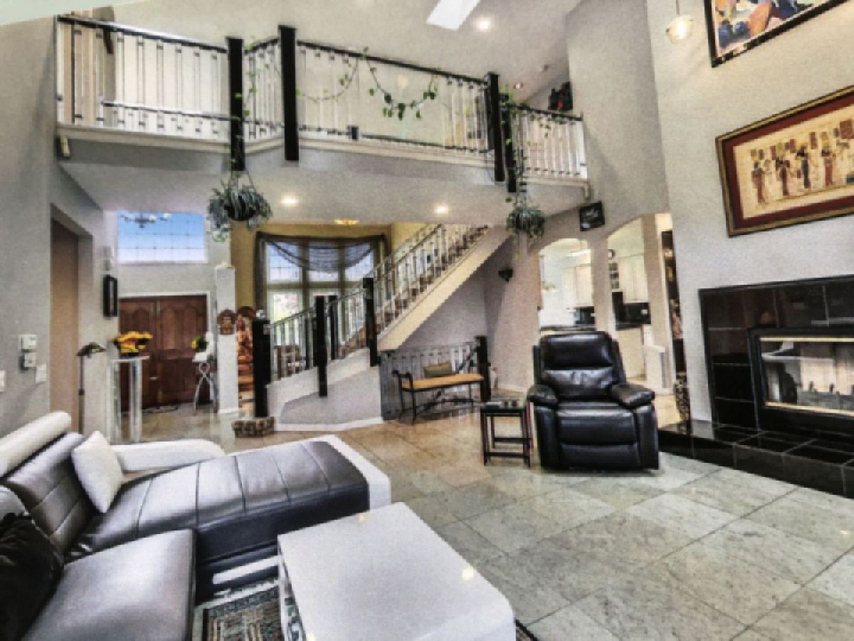 Custom-built 2-story home with over 5,000 square feet of living space. Hand carved main doors allow entry to the main level that provides an open layout with high ceiling, granite stone flooring, gas/wood burning common fireplace and large picture windows that bask the interior with ample natural light. The kitchen provides granite backsplash and countertops, blended with stainless steel appliances and an island for added counter space. On this floor, is a spacious guest bedroom with en-suite bathroom, with a double walk-in closet. A study and a den rooms. Up the acrylic staircase in the second level, there are 3 bedrooms. A spacious master suite with a large walk-in closet. An en-suite bathroom with double vanity sinks, a jacuzzi-tub, steam shower and another walk-in closet. A bridge connects to 2 additional bedrooms with tub and shower bathrooms. The lower level offers a full, finished basement with granite flooring, offering a recreational room, bar area, and a full bathroom.