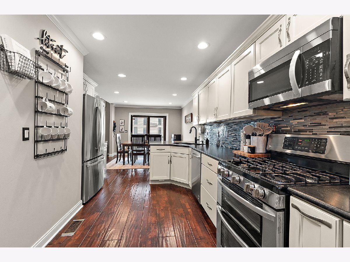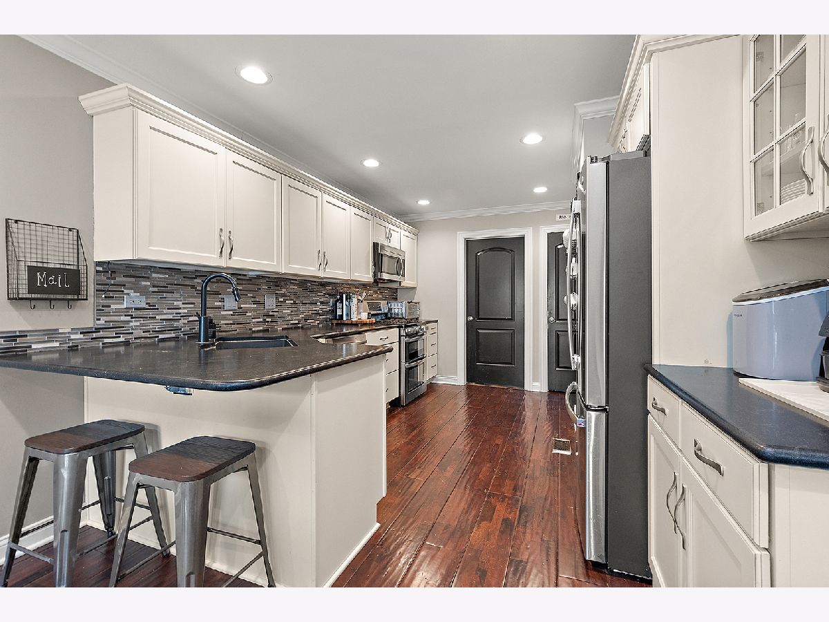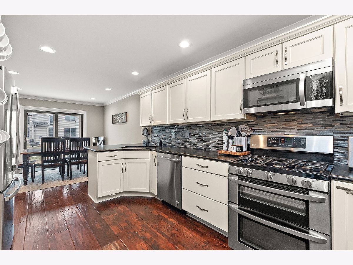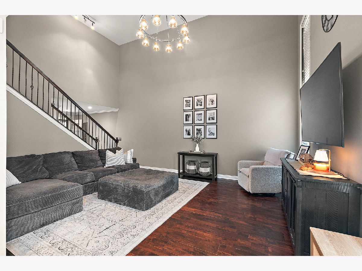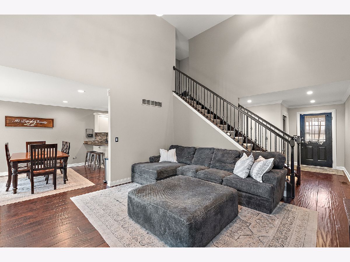 Beautiful updated townhome with covered front entry. Rich hand-scraped hardwood floors run throughout the main level, creating a warm and inviting feel. The kitchen features stainless steel appliances, including a double oven, complemented by a stylish glass-tiled backsplash, granite countertops and a breakfast bar with seating, perfect for everyday meals or entertaining. White cabinetry with above and under mounted lighting. Sliding glass doors lead to a private paver patio with a built-in seating, ideal for relaxing or hosting guests. The soaring, 2-story family room offers beautiful stacked windows that bring in an abundance of natural light. Finished lower level adds even more living space with a recreation area, full-size bar, and a dedicated office or possible 4th bedroom. Upstairs, enjoy three spacious bedrooms, including a shared ensuite featuring a vanity, double sinks, and a step-in shower with bench and dual shower heads. A large walk-in closet means no boxing each seasons clothes. Additional highlights include a front-load 2-car garage and a backyard walking path. Conveniently located near Frankfort shopping, dining, parks and amenities, and served by award winning Lincoln-Way East High School.