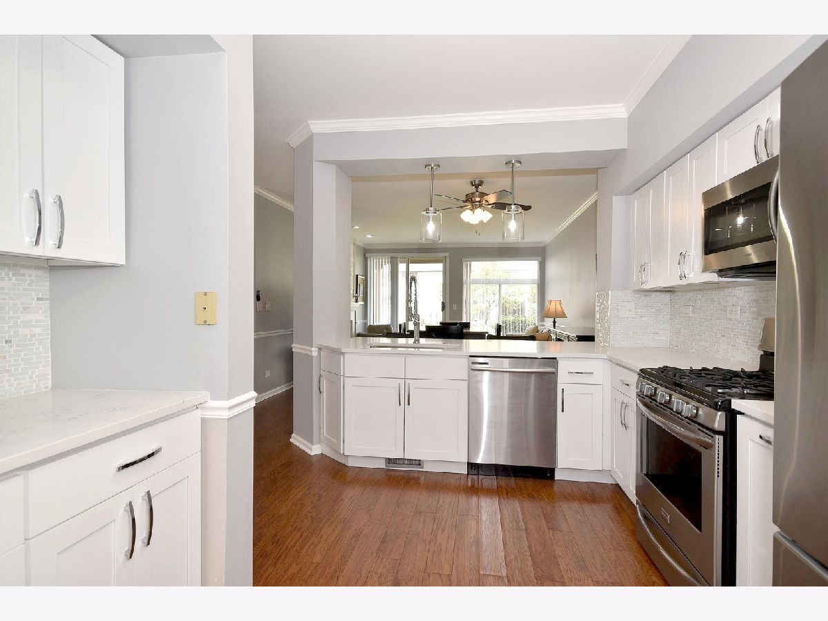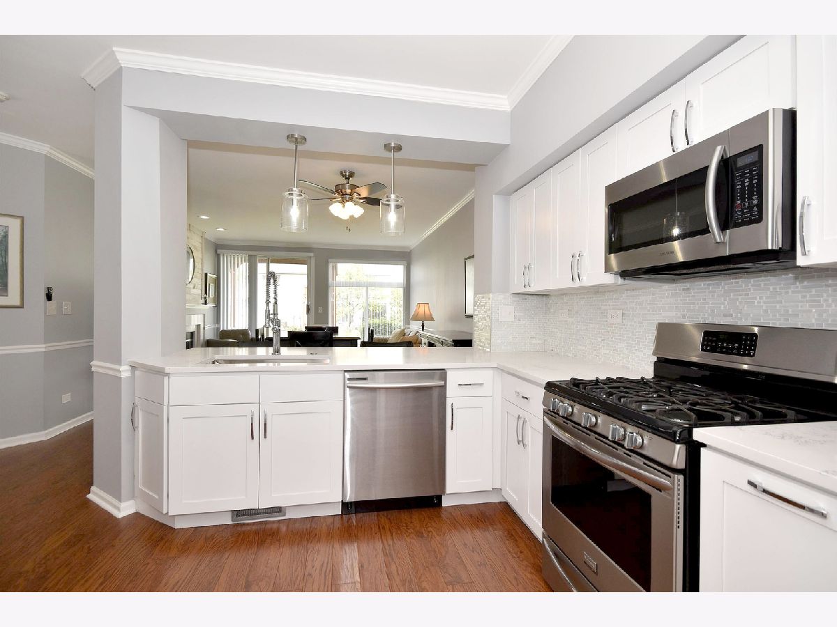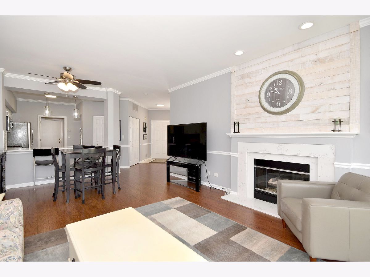 Gorgeous first floor unit with updated kitchen, baths, flooring, lighting, paint, new blinds, and luxury features. Kitchen has new white shaker cabinets, quartz countertops, beautiful backsplash, new lighting, and stainless steel appliances. A pass through breakfast bar from the kitchen, makes cereal in the morning a comfortable habit. The wood-look flooring throughout the common living space highlights the stylish features, including the updated fireplace with shiplap chimney front and quartz surround. Tons of light in this unit's exposure and great courtyard views. This home includes two bedrooms with new carpets and two very stately updated bathrooms. Tons of storage including a huge walk-in master closet, kitchen pantry, & convenient in-unit laundry. Enjoy the patio, the easy access to the one car attached garage, and low monthly HOA fees! Top rated schools! The perfect location with easy access to I-55! Live Luxury in Darien!